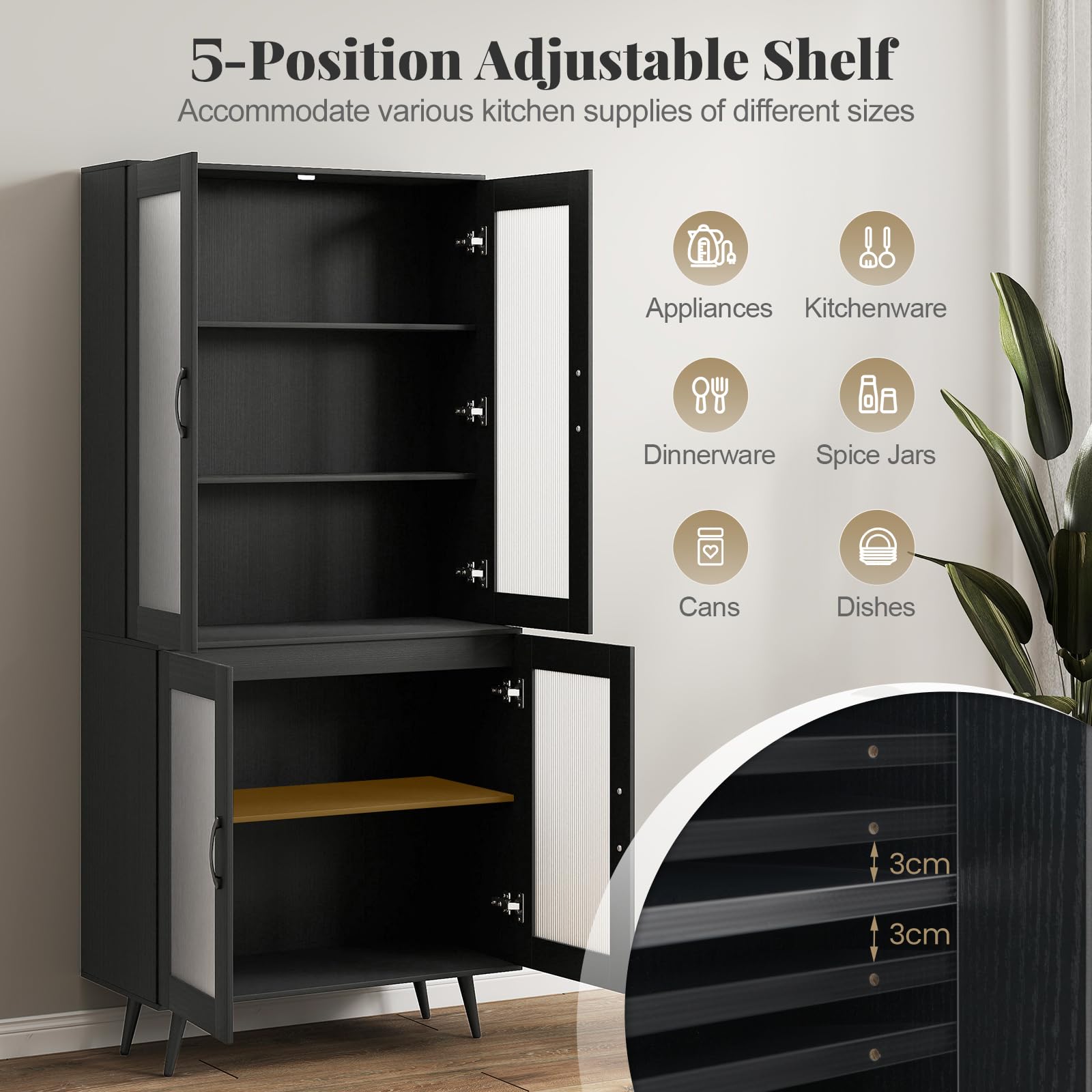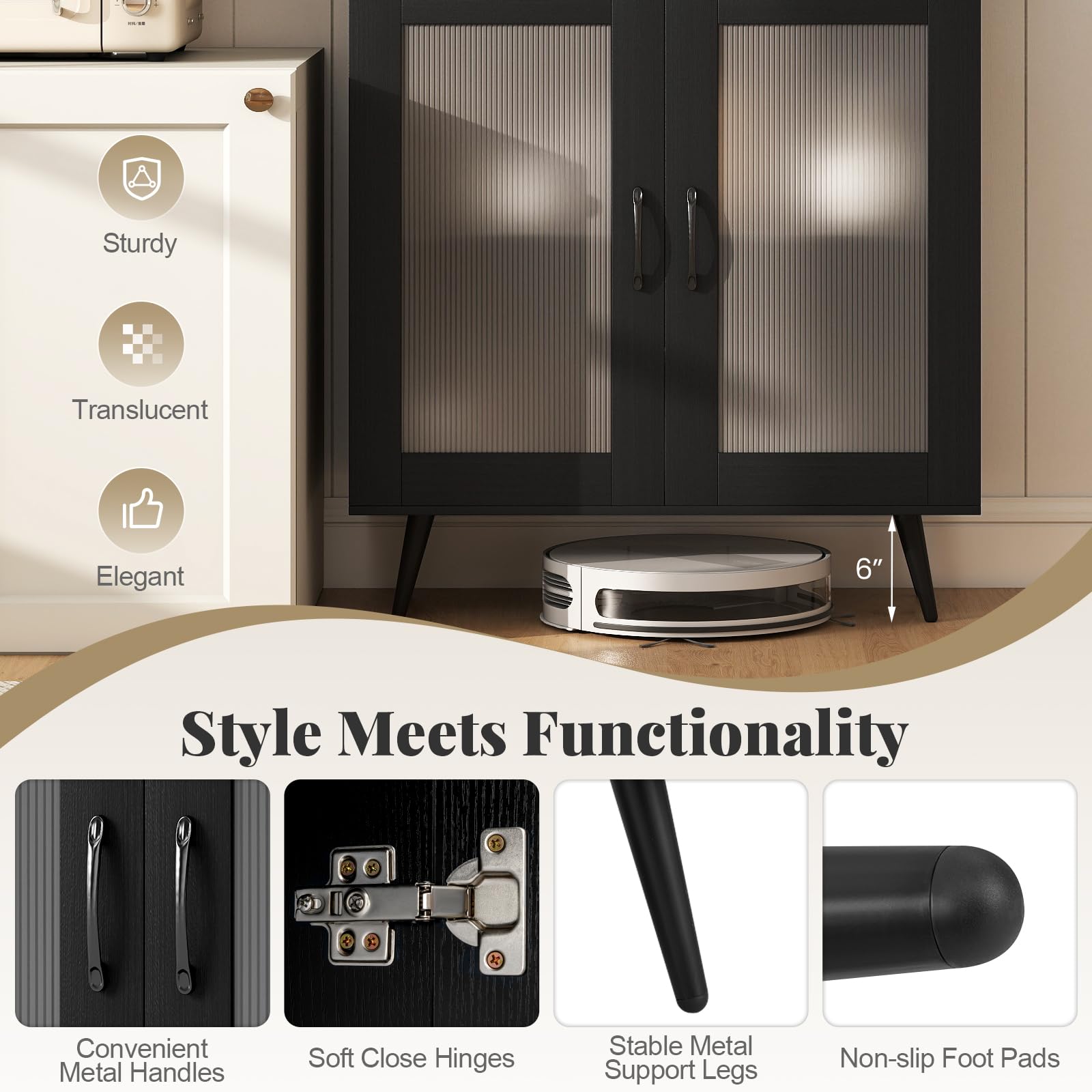 The buffet sideboard features 4 see-through doors, making it easier to view and organize items while adding a touch of elegance to your space. The lower section of the cabinet includes an adjustable shelf that can be set in 5 different heights to customize your storage needs. Positioned on sturdy raised metal legs, this tall cupboard boasts reliable structure. Safety is prioritized with included anti-toppling kits, ensuring the cabinet remains stable and secure. Crafted with modern style and neutral finish, this storage cabinet seamlessly fits into any space.
