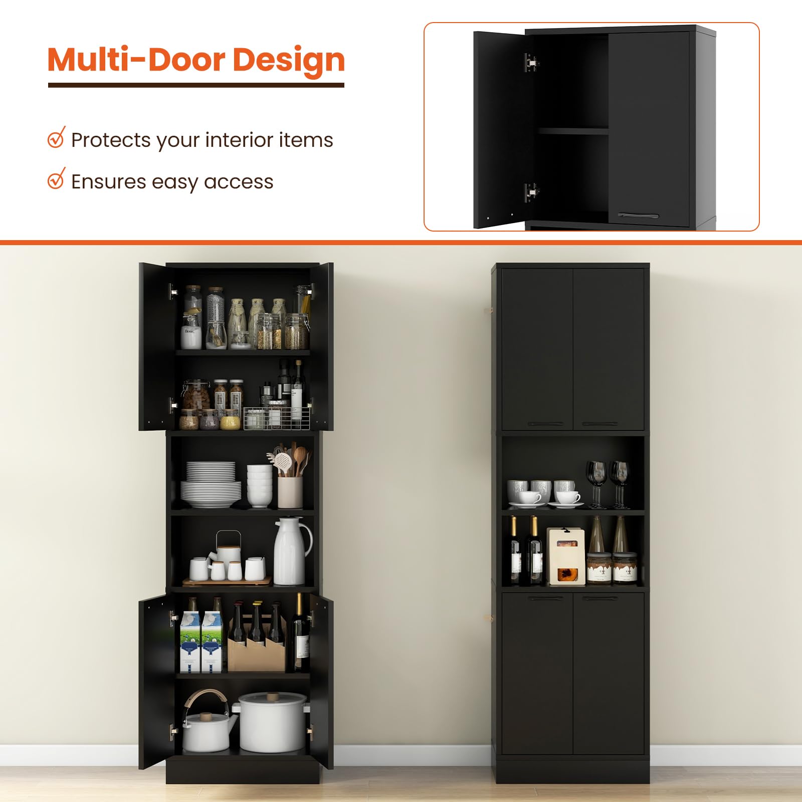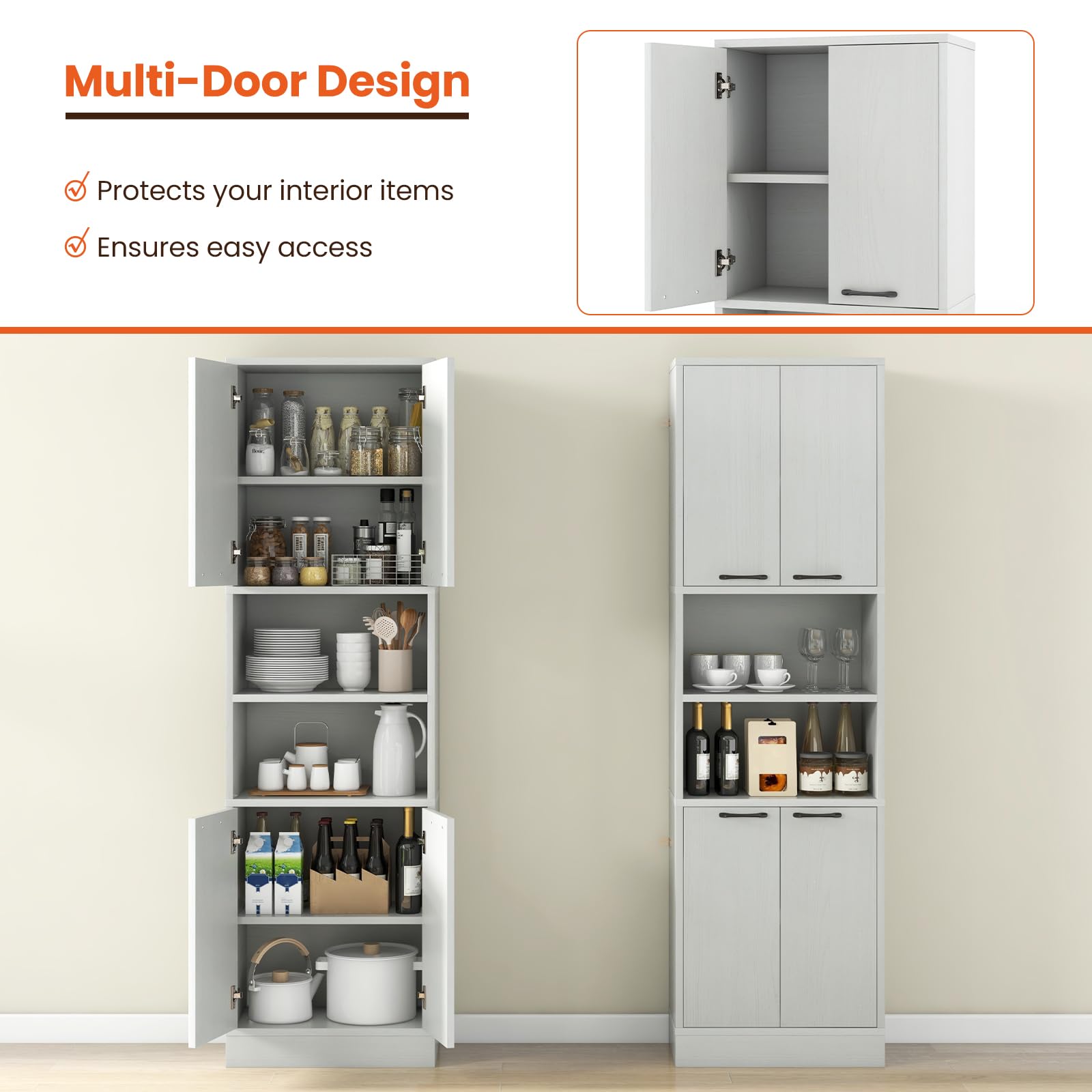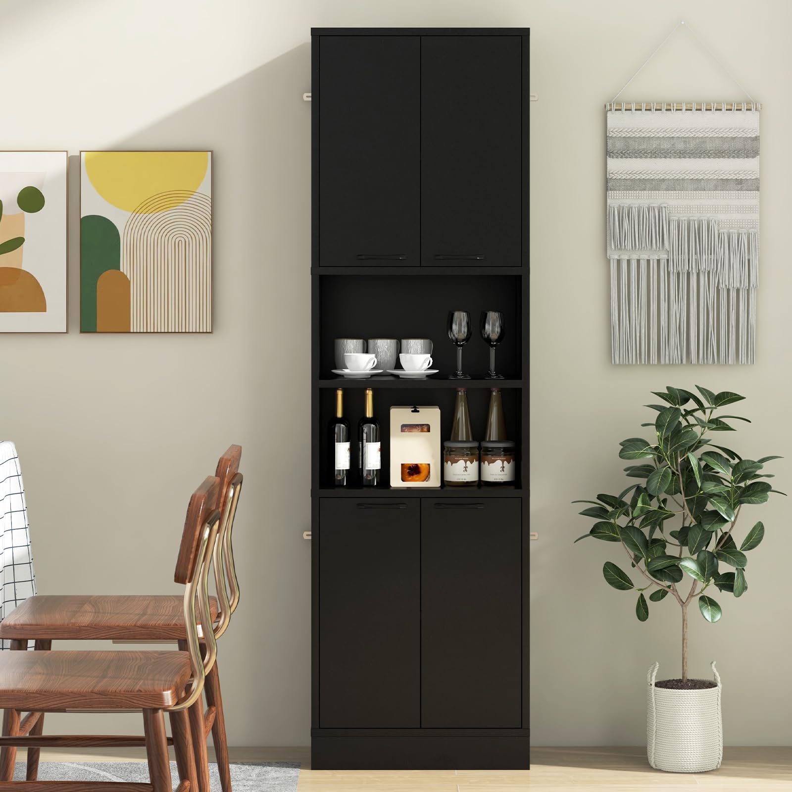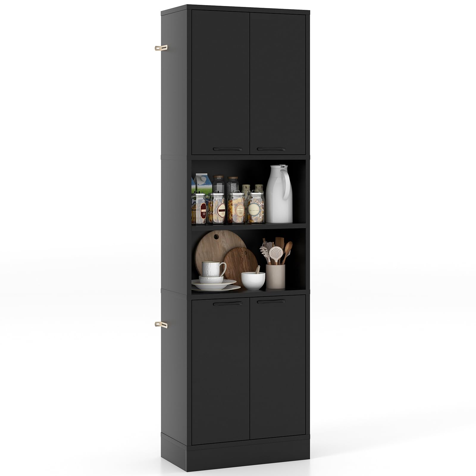 This kitchen pantry cabinet offers you abundant storage space without taking up too much floor space. It has 2 double-door cabinets with shelves and 2 open shelves to meet your storage needs. It not only serves as a buffet cabinet, but also works well as a cupboard, coffee bar, display cabinet, or bathroom cabinet. Besides, 4 doors help to prevent items from falling and keep interior items clean. There are easy-to-grip handles and metal hinges for effortless opening and closing. Robust base and non-slip foot pads make it steady enough. Furthermore, with the anti-toppling system, you can firmly fix the cabinet to the wall.