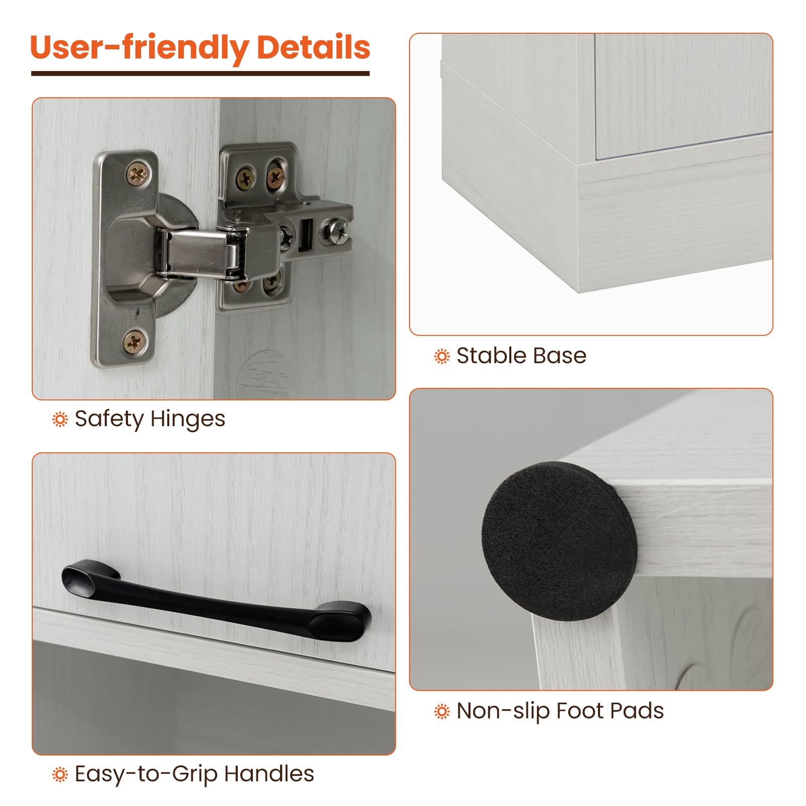 - Reliable & Sturdy Construction: The solid base keeps this cupboard stable and not easy to wobble. Non-slip foot pads bring added sturdiness and protect the floor from being scratched. Moreover, the upper & lower anti-toppling devices securely attach the cabinet to the wall for extra stability and security.
