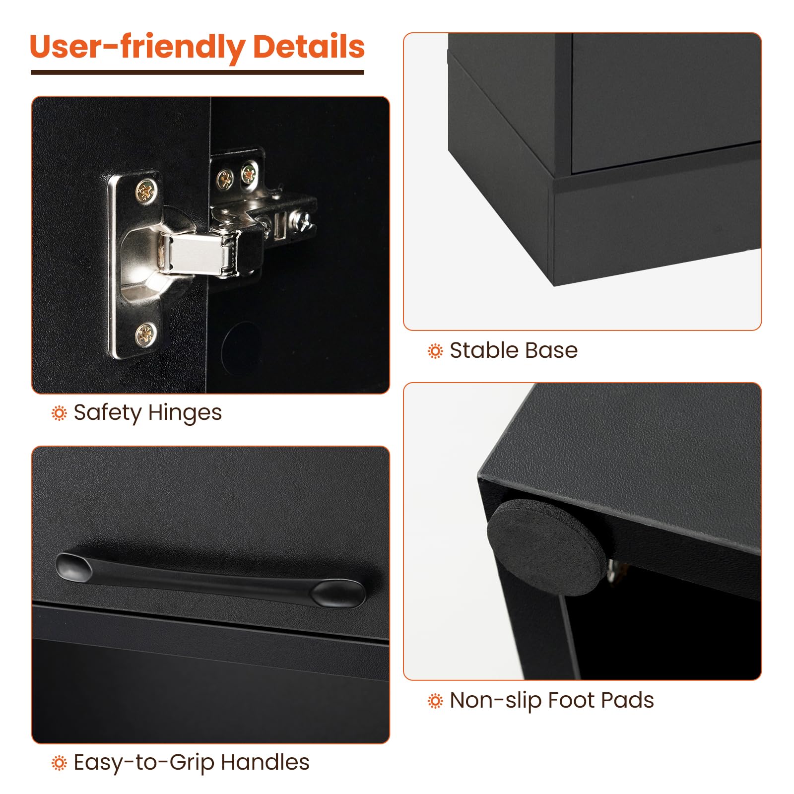 - Designed with User-friendly Details: Multi-door design protects your interior items and ensures easy access to stuff. It also helps to keep the interior space clean. Additionally, the easy-to-grip handles and safety hinges allow for easy opening and safe closing.