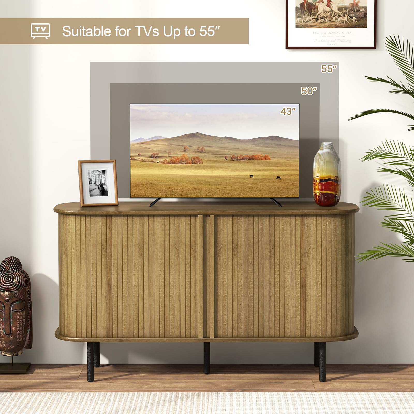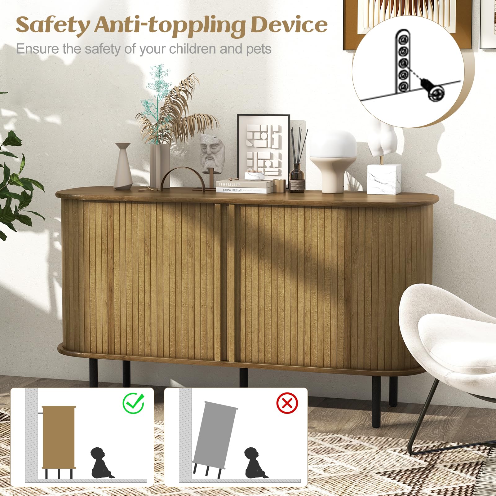 Enhance your space with the buffet cabinet, featuring unique waveform panel doors and a seamless mid-century modern design that effortlessly complements any home style. This versatile piece offers flexible storage space with smoothly sliding doors and adjustable shelves, allowing you to efficiently utilize the cabinet space. The spacious tabletop provides ample storage and display space while the sturdy metal legs ensure stability. Use it as a TV stand, cupboard, or display cabinet for added functionality and style in any room.