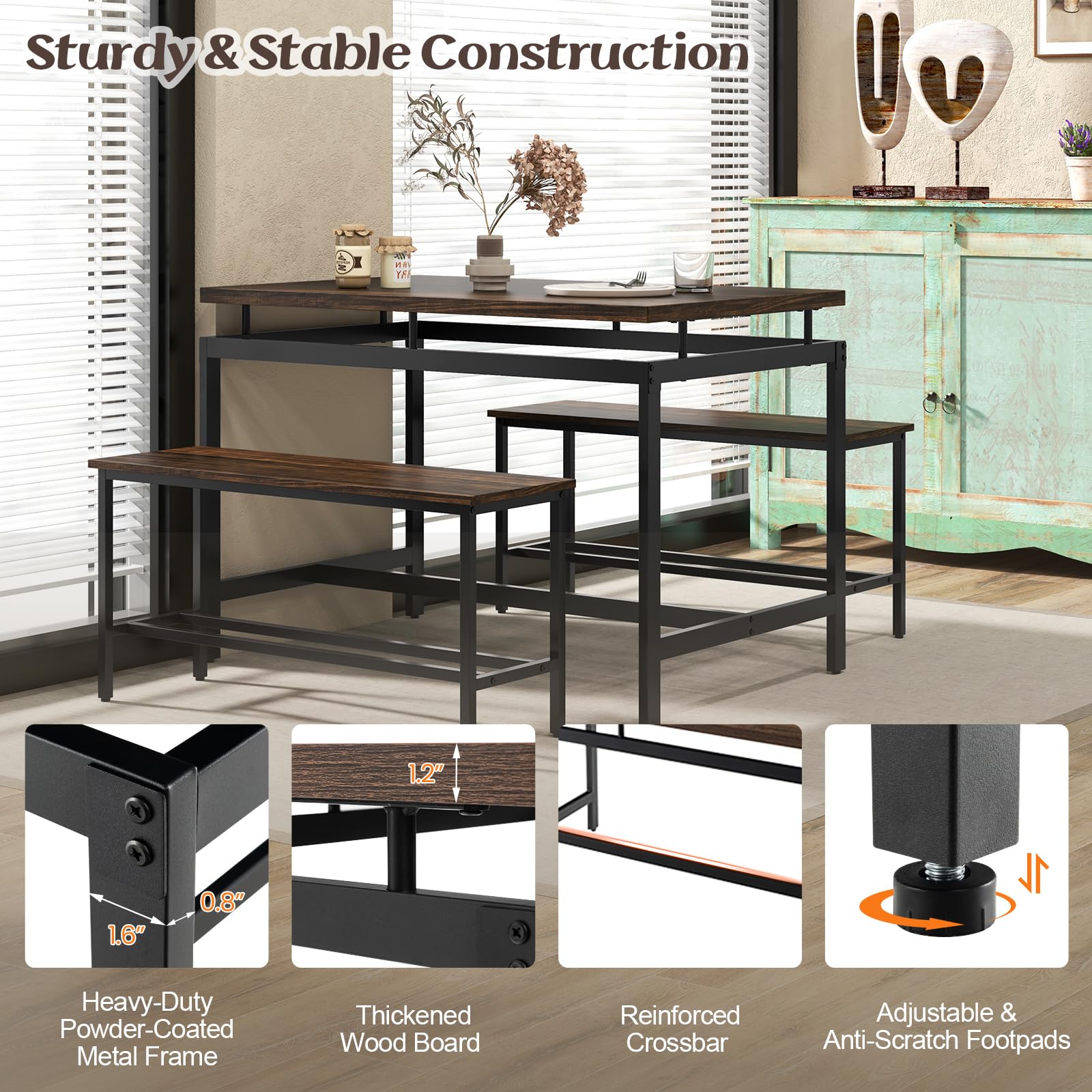 - 【Sturdy & Stable Construction】: The dining table and benches are supported by a heavy-duty powder-coated metal frame and reinforced by crossbars, ensuring exceptional sturdiness and a large loading capacity. The table loads up to 160 lbs, and the chair loads up to 660 lbs. Besides, the bottom features adjustable footpads for enhancing stability.