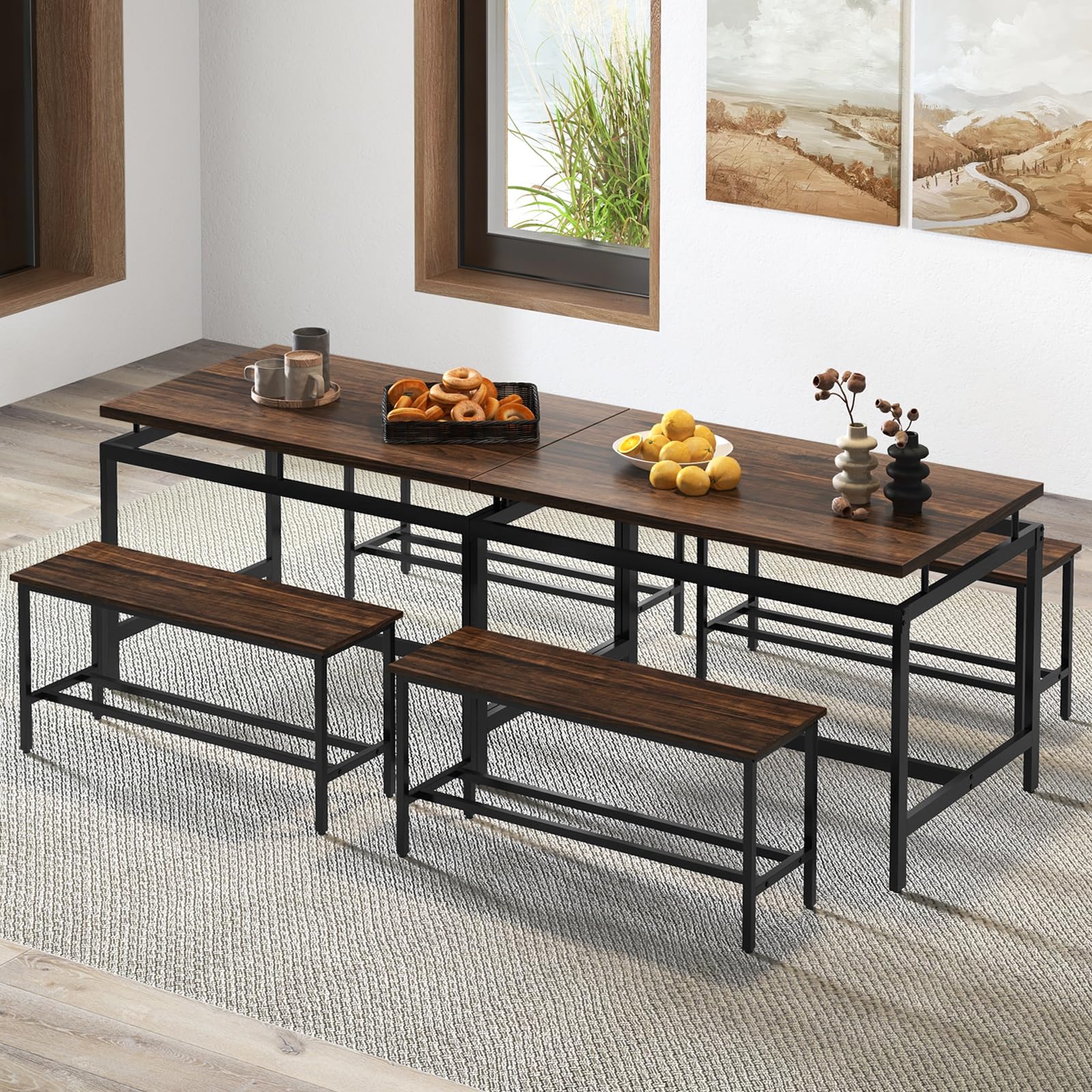 Our 3-piece dining table set includes a dining table and 2 benches, which are versatile for eating meals, enjoying afternoon tea, reading, or working. Besides, the rich, aged wood tones complement the black metal frame, which could add a touch of vintage charm to your space. Other than that, it is supported by 1.6” x 0.8” thickened metal tubes and reinforced crossbars, ensuring unmatched sturdiness and durability. And there exist adjustable and non-slip footpads to further enhance its stability while protecting your floor from scratching. And when not in use, 2 benches can be conveniently stored underneath the table, which could maximize the available room in your home, making it ideal for small places. Thanks to its waterproof veneered wood boards, you can easily clean the table after eating, saving your time and effort. Whether it's for everyday dining or entertaining guests, this dining set adapts to various occasions effortlessly.