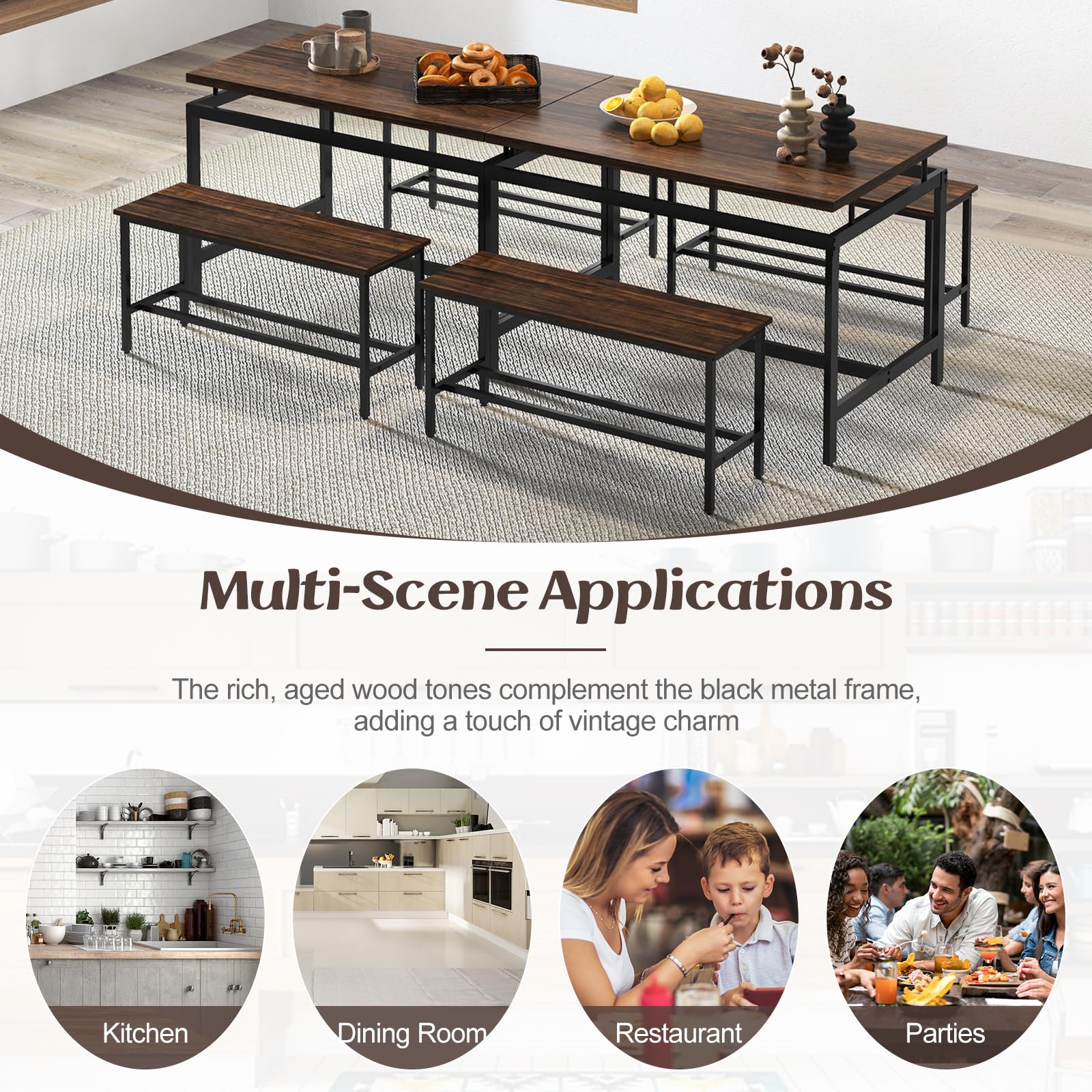 - 【Retro Style & Versatile Use】: With its rich aged wood tones and matte black metal tubes, this antique dining table set could add a touch of elegance and blend into any home style. And it is suitable for various occasions, such as kitchens, dining rooms, restaurants, parties, coffee shops, studies, offices, and more.