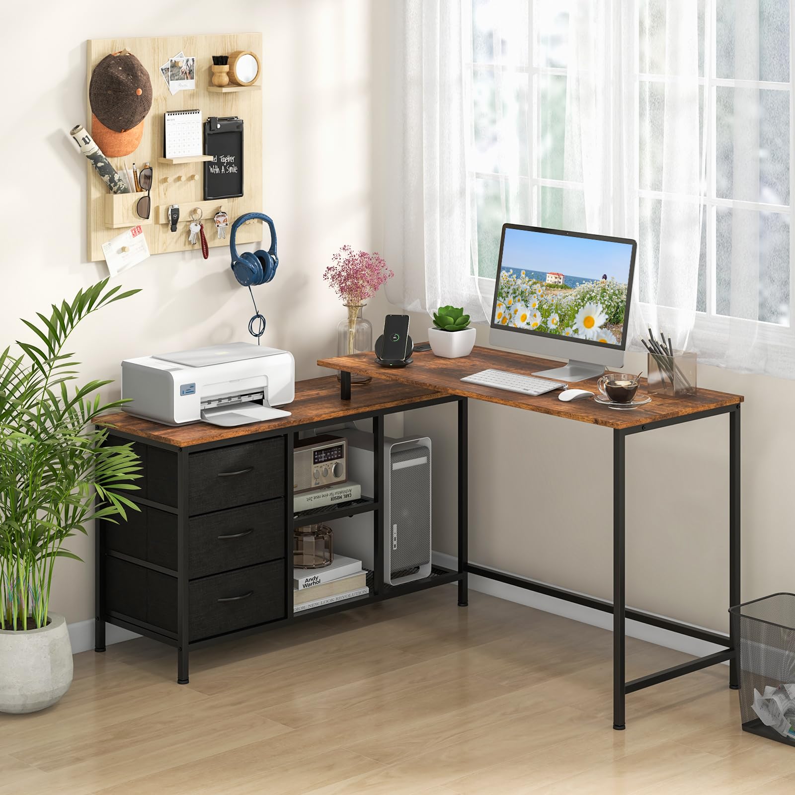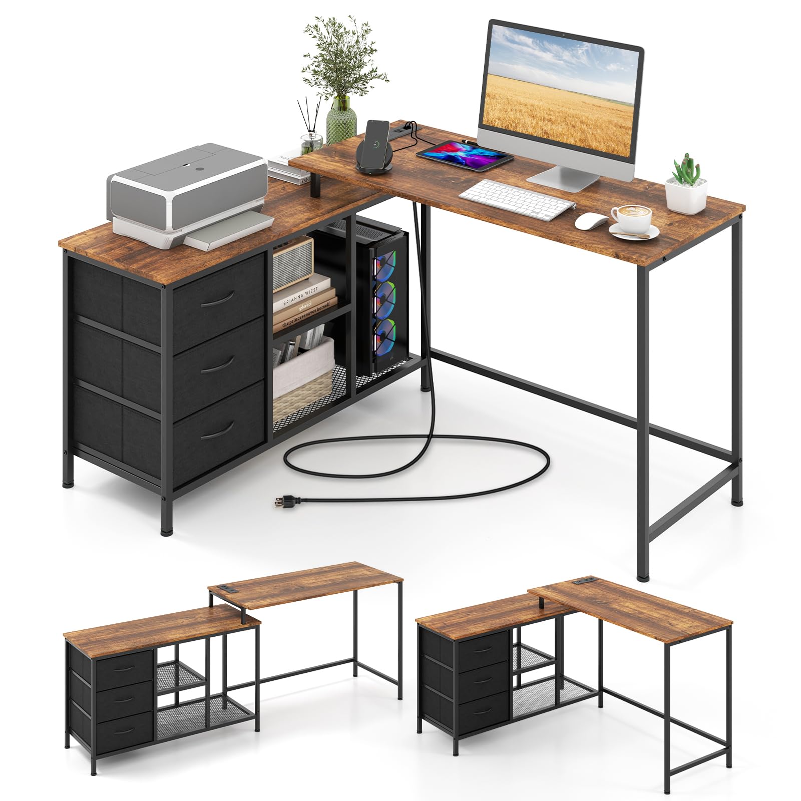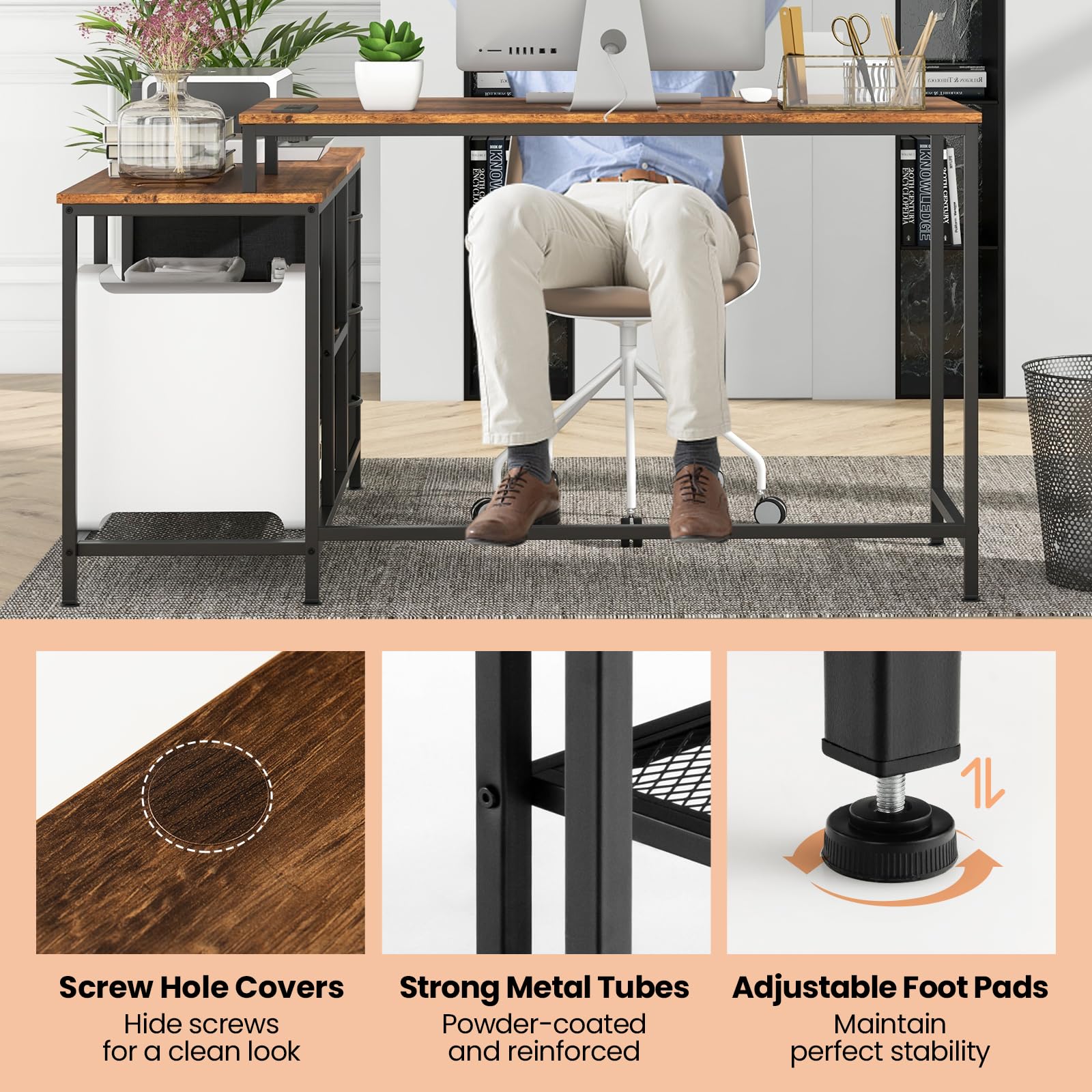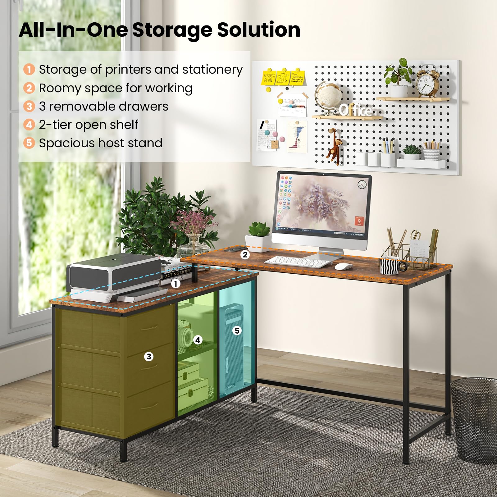 Step into your personal work paradise with the vibrant L-shaped computer desk. Whether you prefer a straight desk or an L-shaped office desk, it has got you covered. Also, with its detachable tall tabletop, you have the freedom to create a smaller study writing desk. It offers roomy space for working and large storage of printers and stationery. With 3 removable drawers, 2 shelves, and a multi-functional host stand, this workstation desk can keep everything within reach. Say goodbye to tangled cords and dead batteries, as this computer desk is equipped with 2 AC outlets and 2 USB ports for convenient charging. Built with a reliable metal frame and adjustable foot pads, it offers unparalleled stability. The L-shaped design allows for efficient multitasking, making it perfect for computer work, writing, reading, or engaging in creative pursuits.