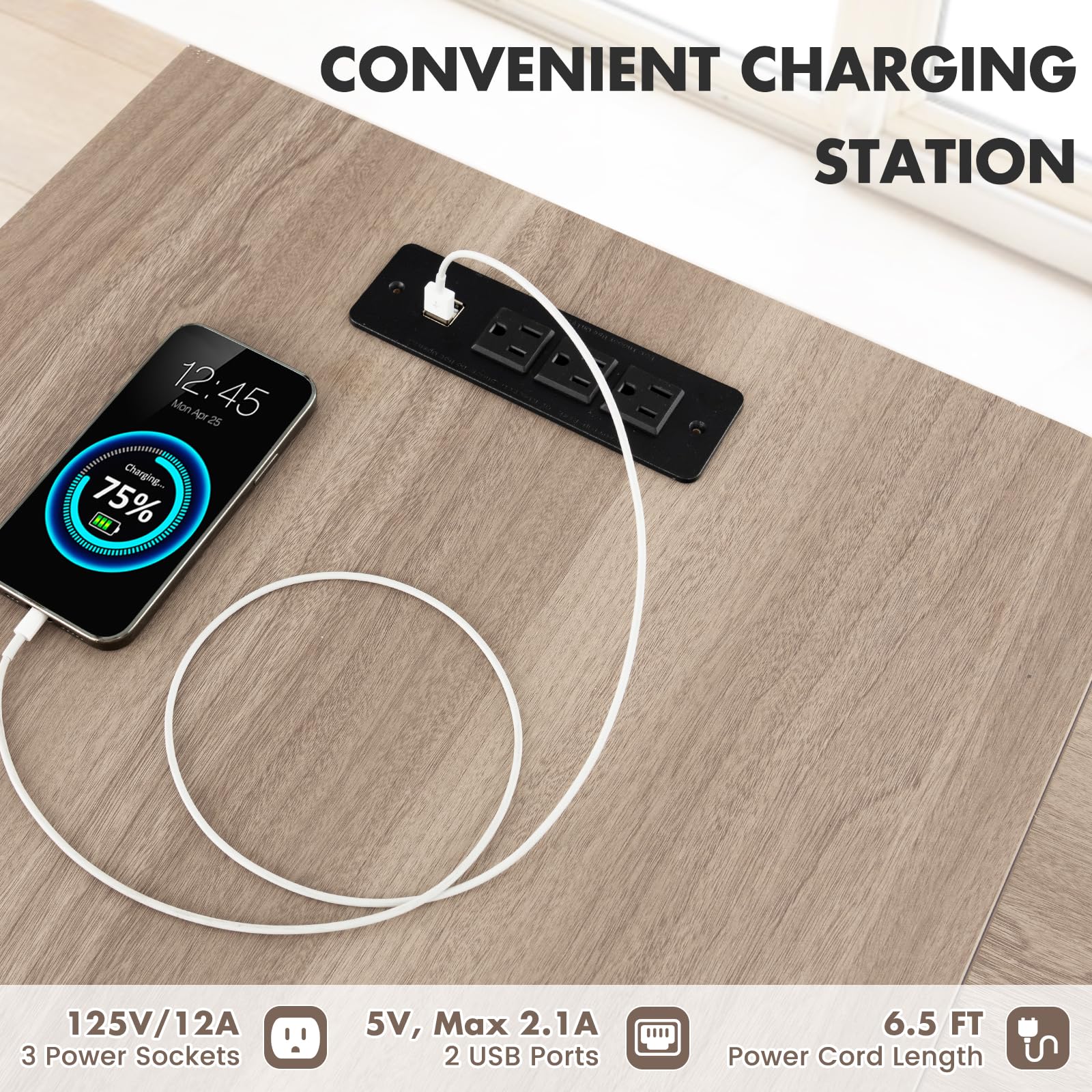 - [Convenient Charging Station]: Equipped with an intimate charging station, the L-shaped desk provides a flexible power source that supports multiple electronic devices. There are 3 power sockets (125V/12A) and 2 USB ports (5V, Max 2.1A) for convenient charging.