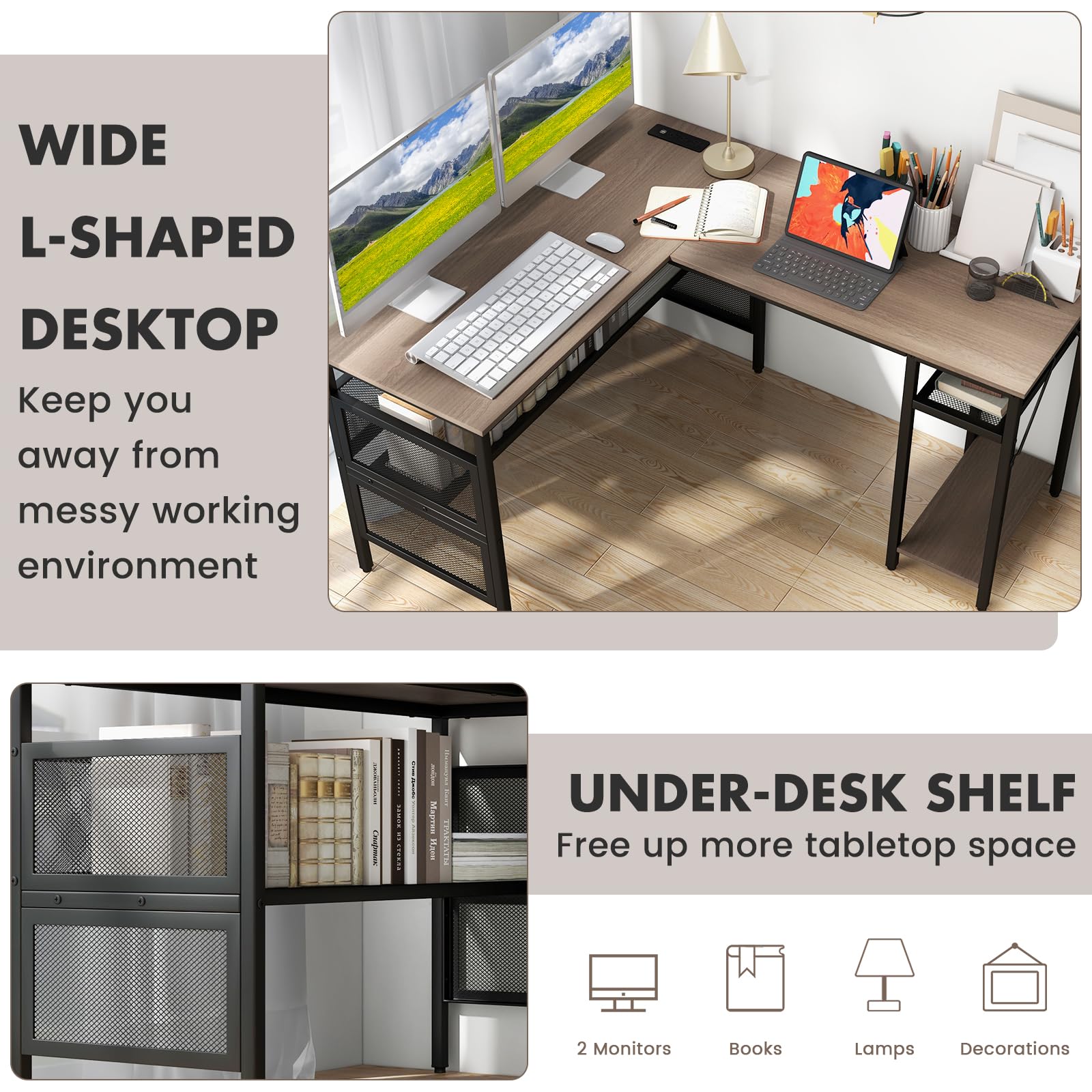 - [2-in-1 Reversible Design]: Thanks to reversible design, the L-shaped desk can be installed either on the right or left side according to your needs, which can adapt to most room layouts and usage scenarios. Besides, the L-shaped design perfectly fits corners and utilizes space.
