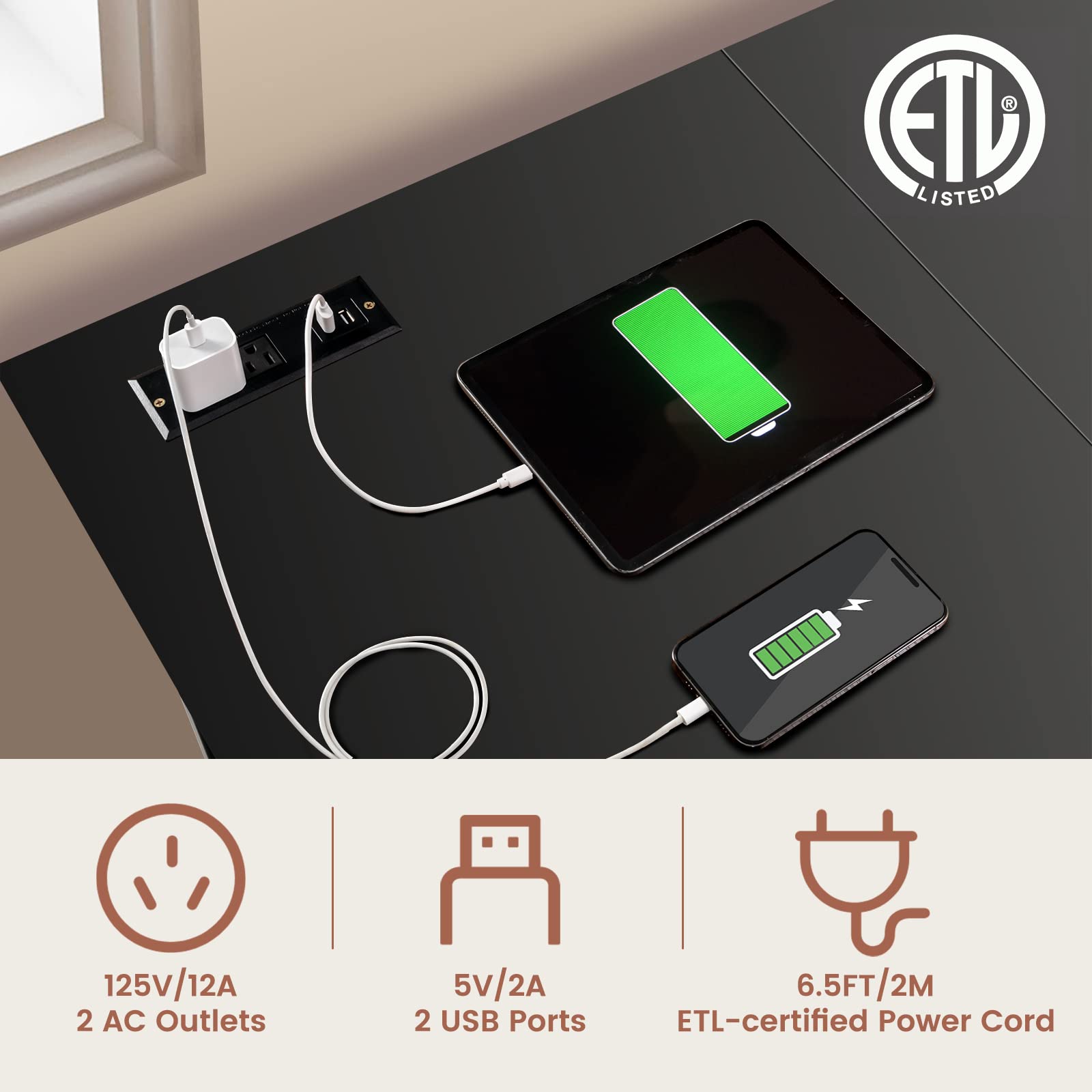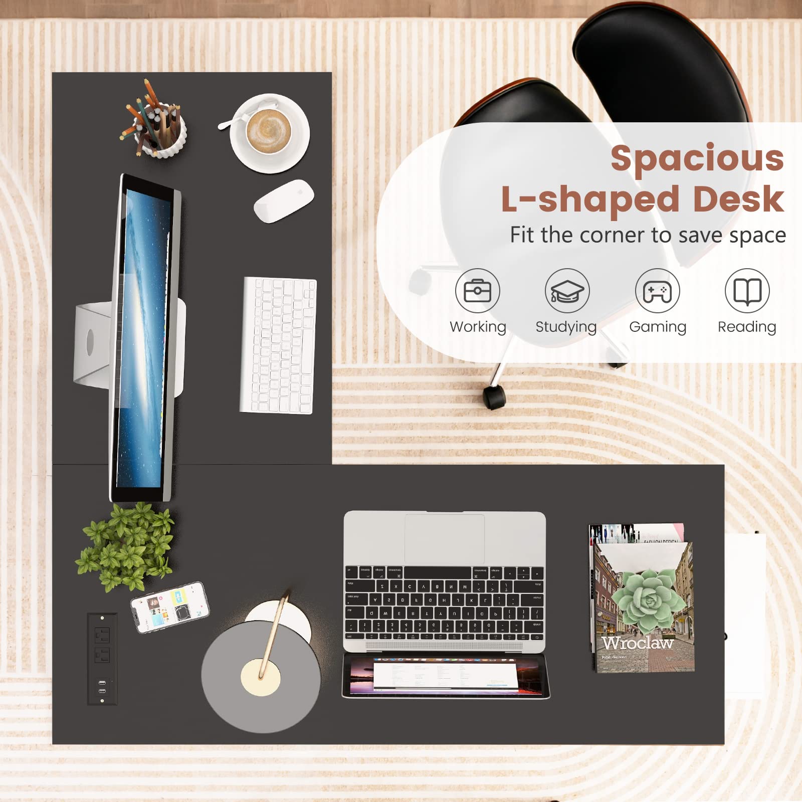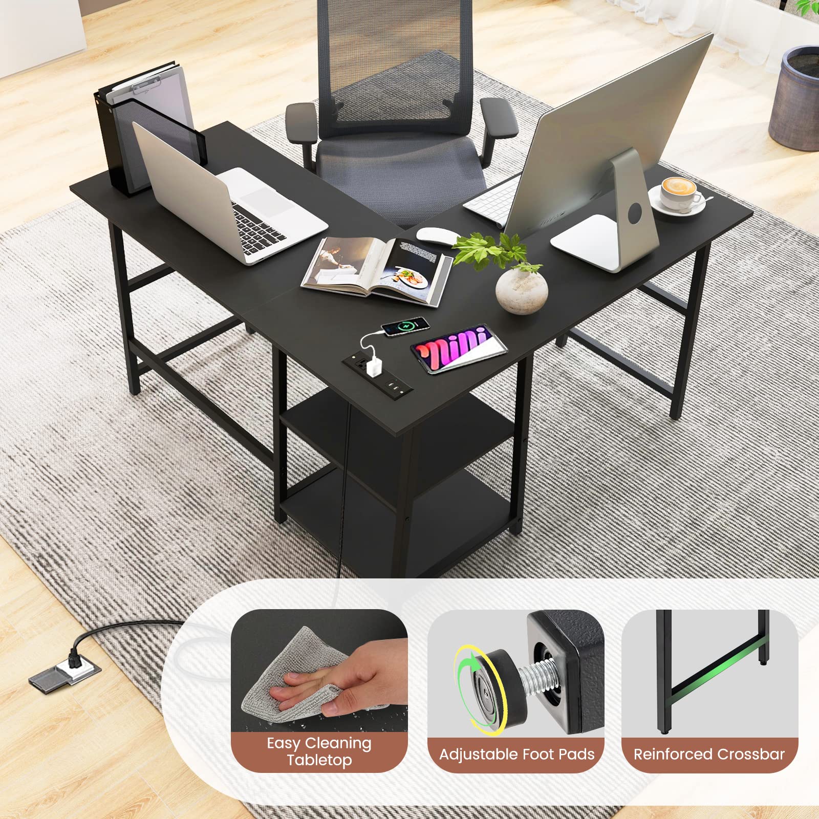 • [Built-in Charging Station]: No need to reach for a socket far away! The L-shaped desk is fitted with a power station for convenient charging. There are 2 AC outlets (125V/12A) and 2 USB ports (5V/2A) to support several devices at the same time.