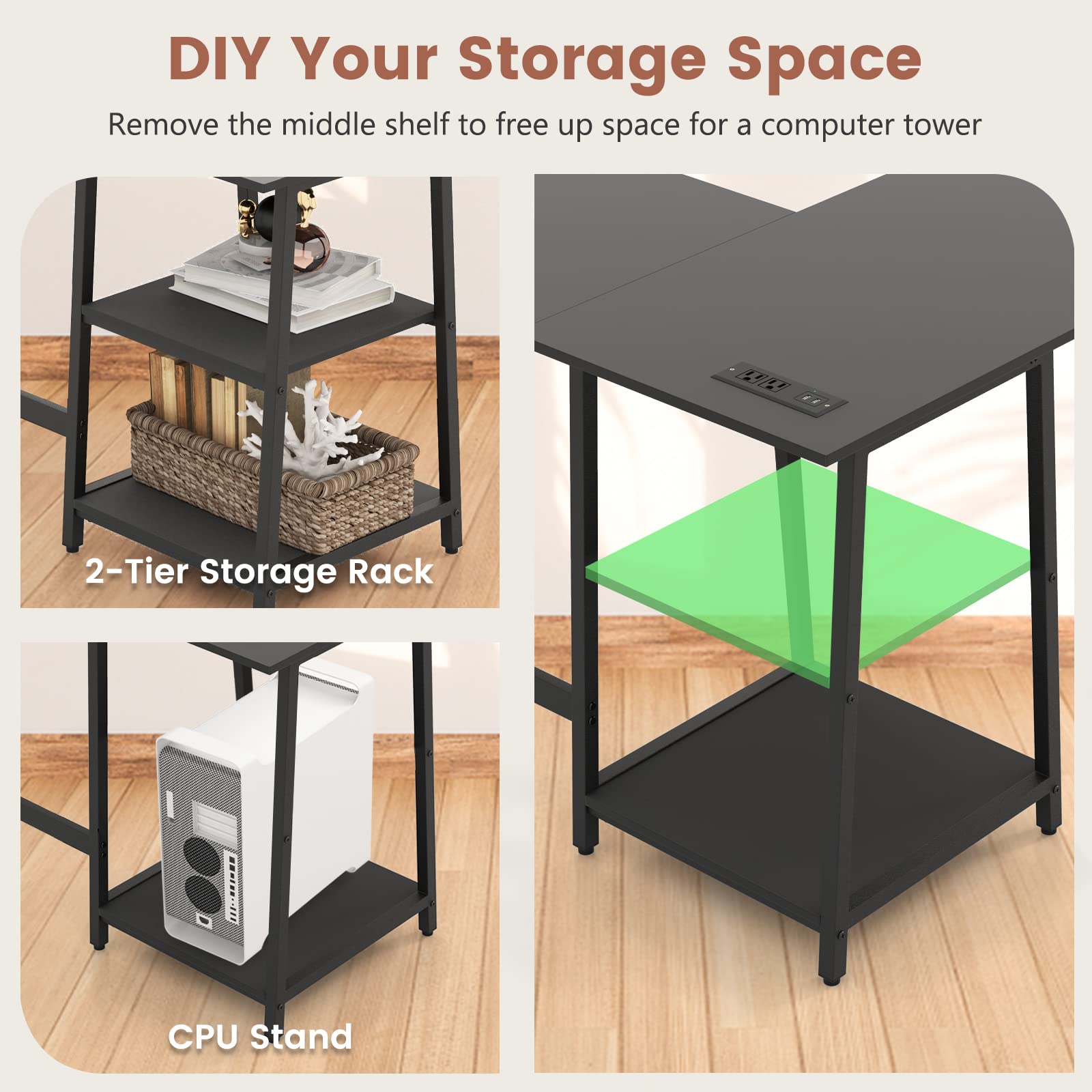 • [2-Tier Storage Rack]: Under the office desk there is a multifunctional shelving unit to add extra storage space. You can DIY your storage space. Use it as a 2-tier storage rack, or remove the middle shelf to free up space for a computer tower.
