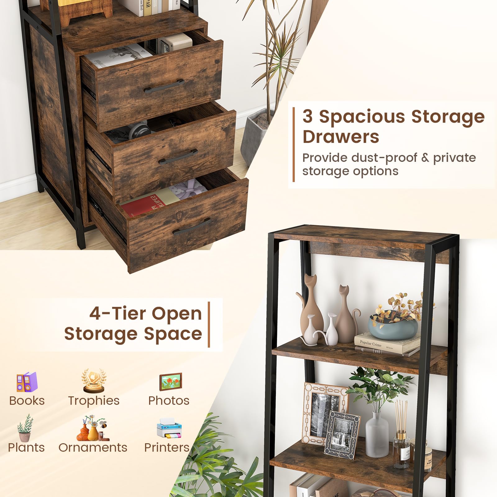 - Versatile Storage Solution: Giantex bookshelf is designed with 4-tier open storage space, which is great for displaying your favorite books, plants, and ornaments, or even placing your printers or other office essentials. Besides, the 3 drawers offer concealed storage for personal items.