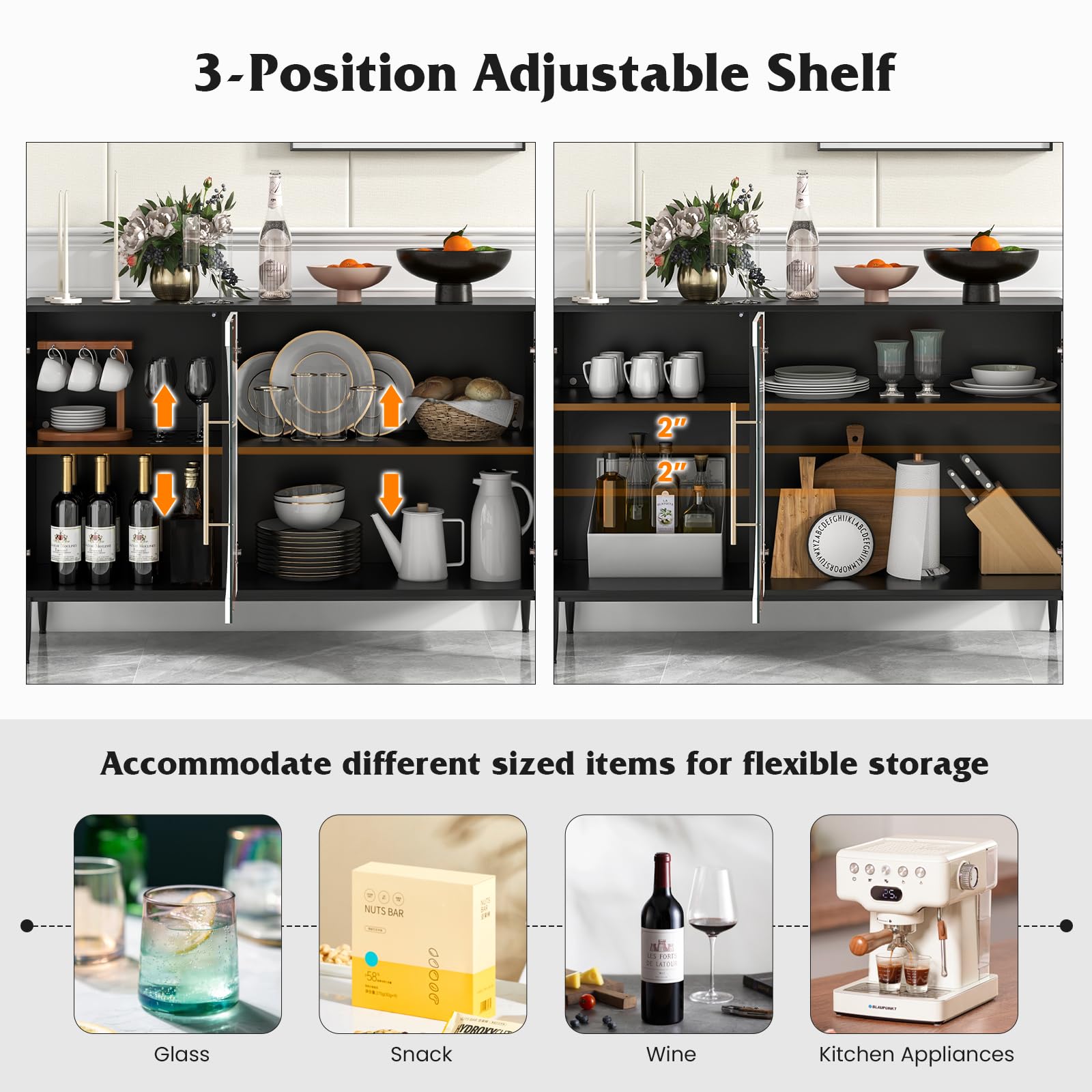 - 3-Position Adjustable Shelf: Our sideboard features 2 adjustable shelves, and each of them can be adjusted in 3 positions (2” for each level). Moreover, the shelves can be detached separately, so you have the flexibility to arrange and display your personal belongings of different sizes.