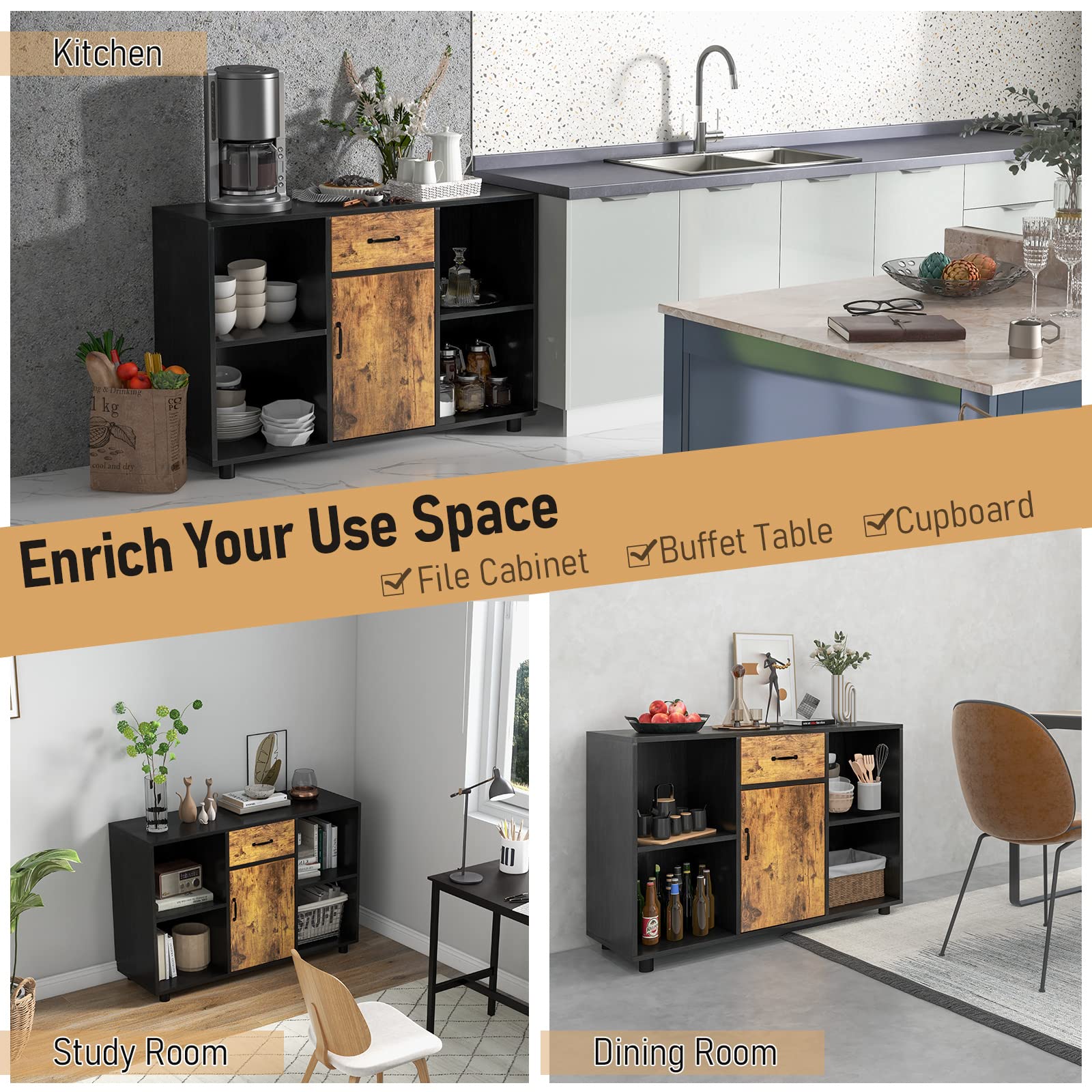Are you still bothered by the mess in the kitchen? Our buffet sideboard is a perfect storage solution to help you keep a tidy kitchen environment. Designed with a spacious cabinet top, 4 open compartments, 1 practical drawer, and a cabinet with a door, this buffet sideboard provides you with enough space to store microwaves, tableware, or personal items for your maximum storage needs. Moreover, thanks to the anti-toppling device, you can fix the sideboard to the wall to prevent wobbling or tipping over, so as to create a safe environment for your family. What's more, 5 sturdy legs give strong support and good stability. With exquisite workmanship and rustic style, the buffet sideboard is suitable for the kitchen, dining room, restaurant, study room, and more.