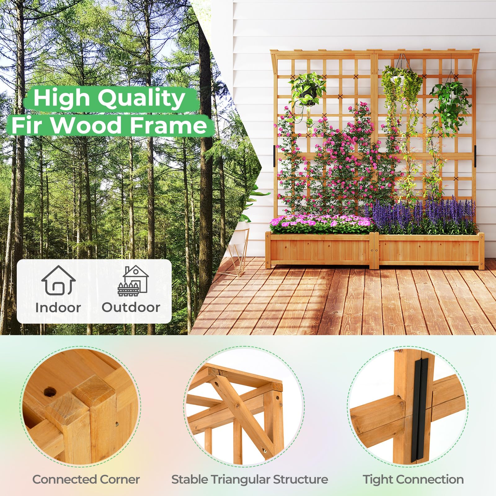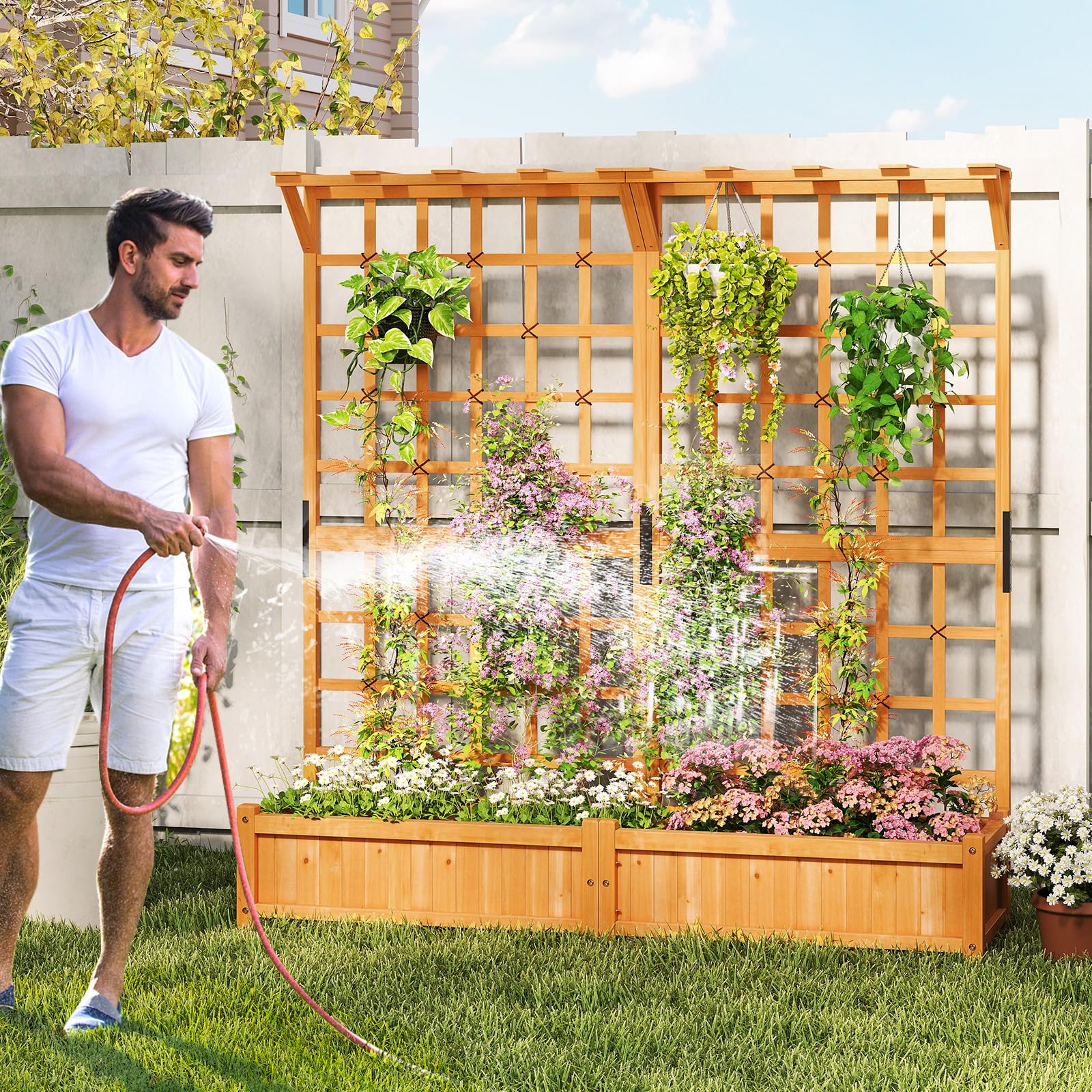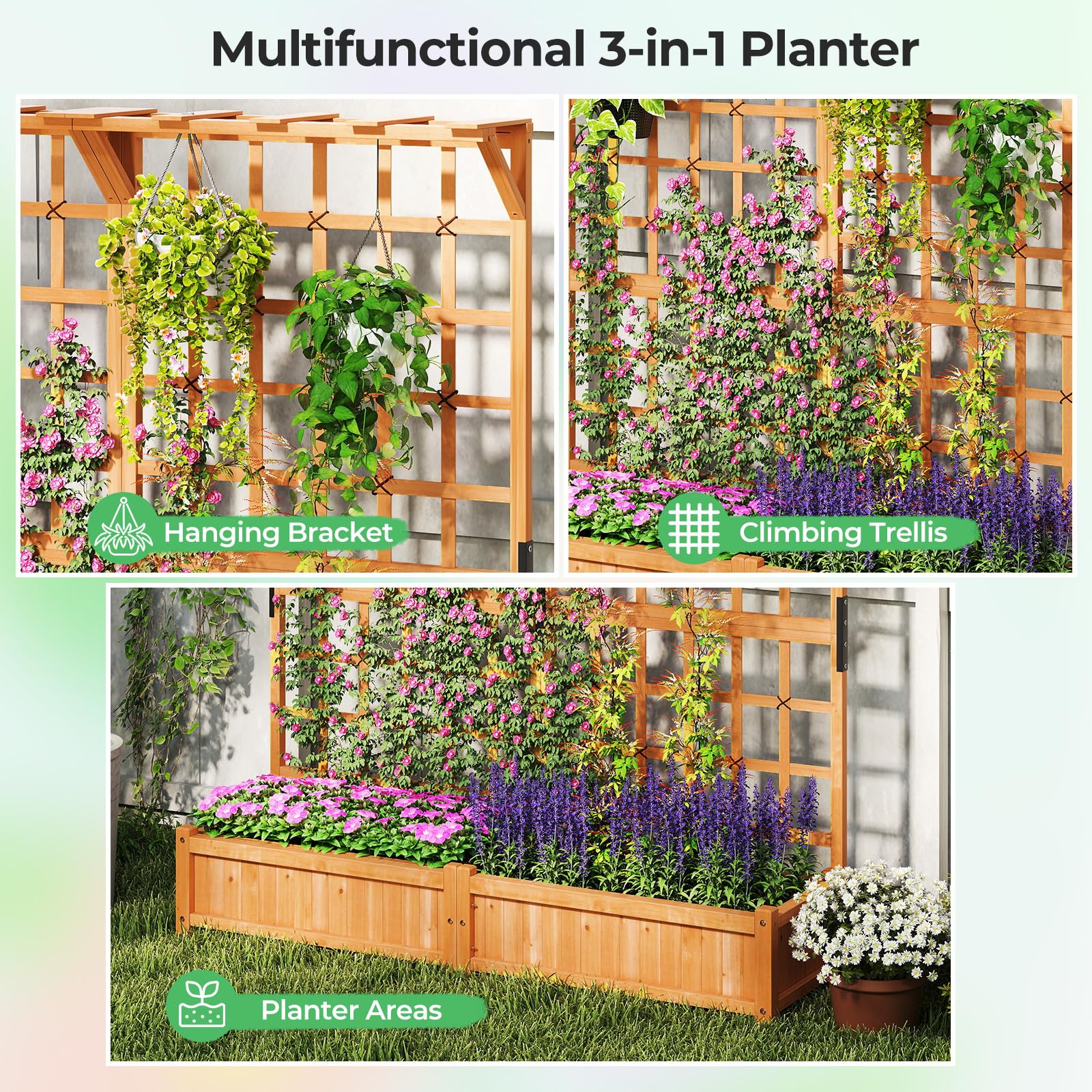 Enhance your gardening experience with this raised garden bed. The planter set includes hanging bracket, climbing trellis, planter areas, allowing you to cultivate various plants, such as flowers, herbs, vegetables, fruits, and more. Featuring a large capacity, it accommodates various plants while ensuring good drainage with internal holes. Crafted of solid fir wood and finished with waterproof paint, the raised planter box ensures durability. Perfect for enthusiasts and professionals alike, it offers a practical solution to cultivating a thriving, beautiful garden!
