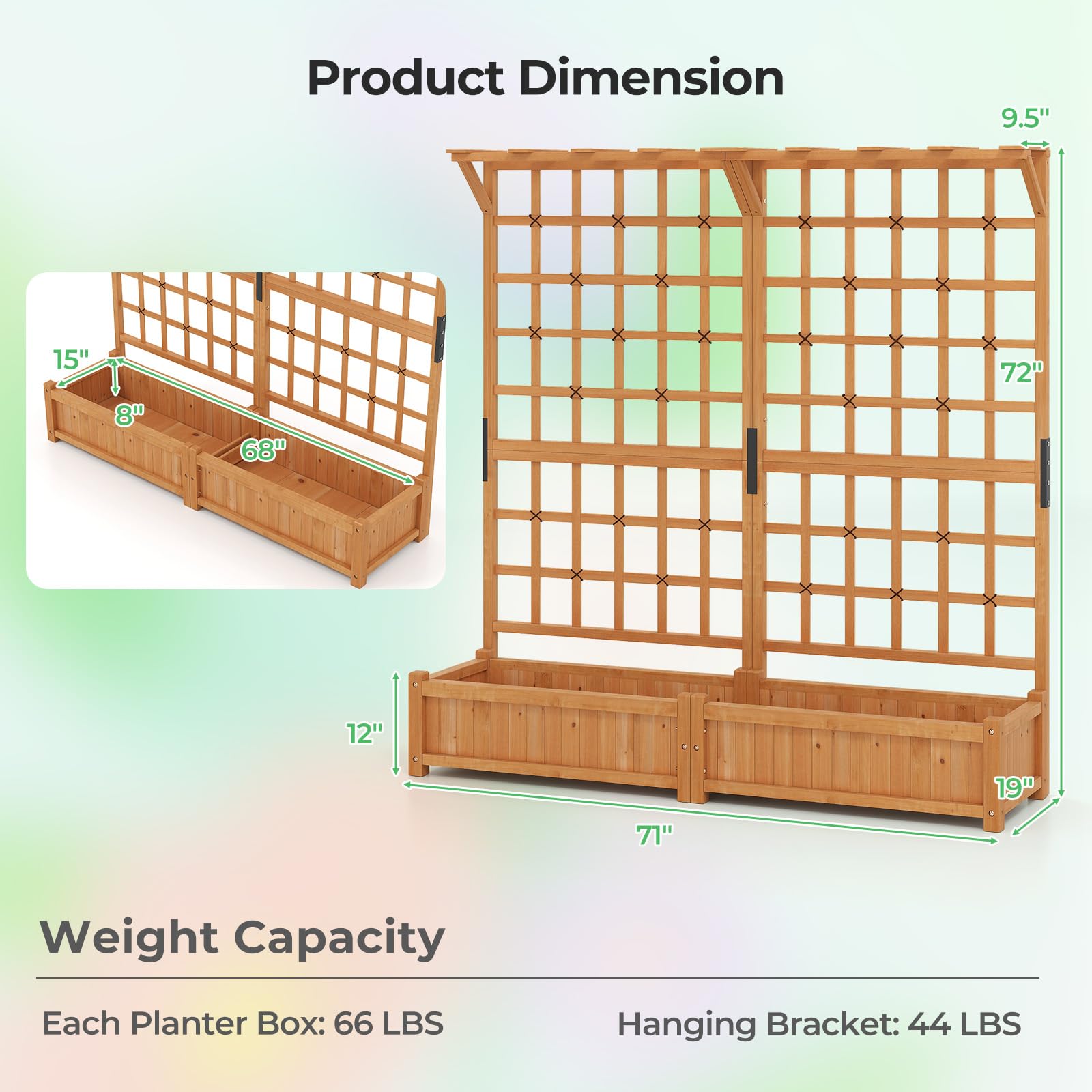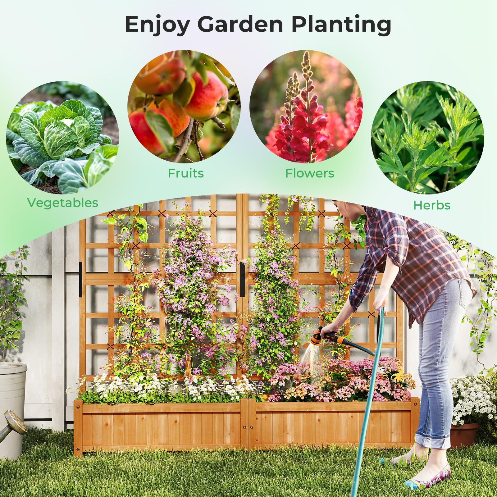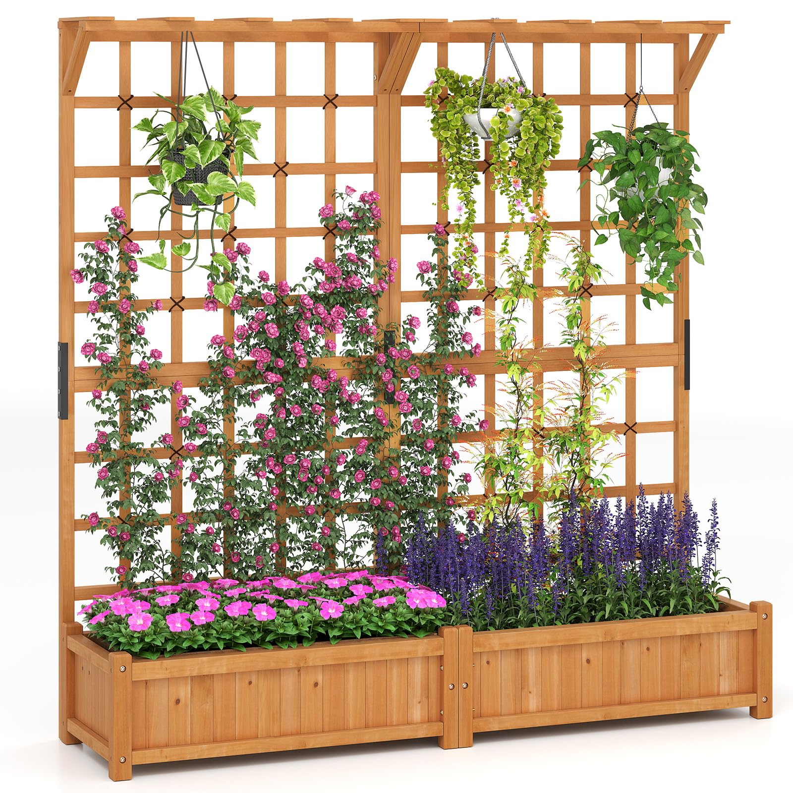 Enhance your gardening experience with this raised garden bed. The planter set includes hanging bracket, climbing trellis, planter areas, allowing you to cultivate various plants, such as flowers, herbs, vegetables, fruits, and more. Featuring a large capacity, it accommodates various plants while ensuring good drainage with internal holes. Crafted of solid fir wood and finished with waterproof paint, the raised planter box ensures durability. Perfect for enthusiasts and professionals alike, it offers a practical solution to cultivating a thriving, beautiful garden!