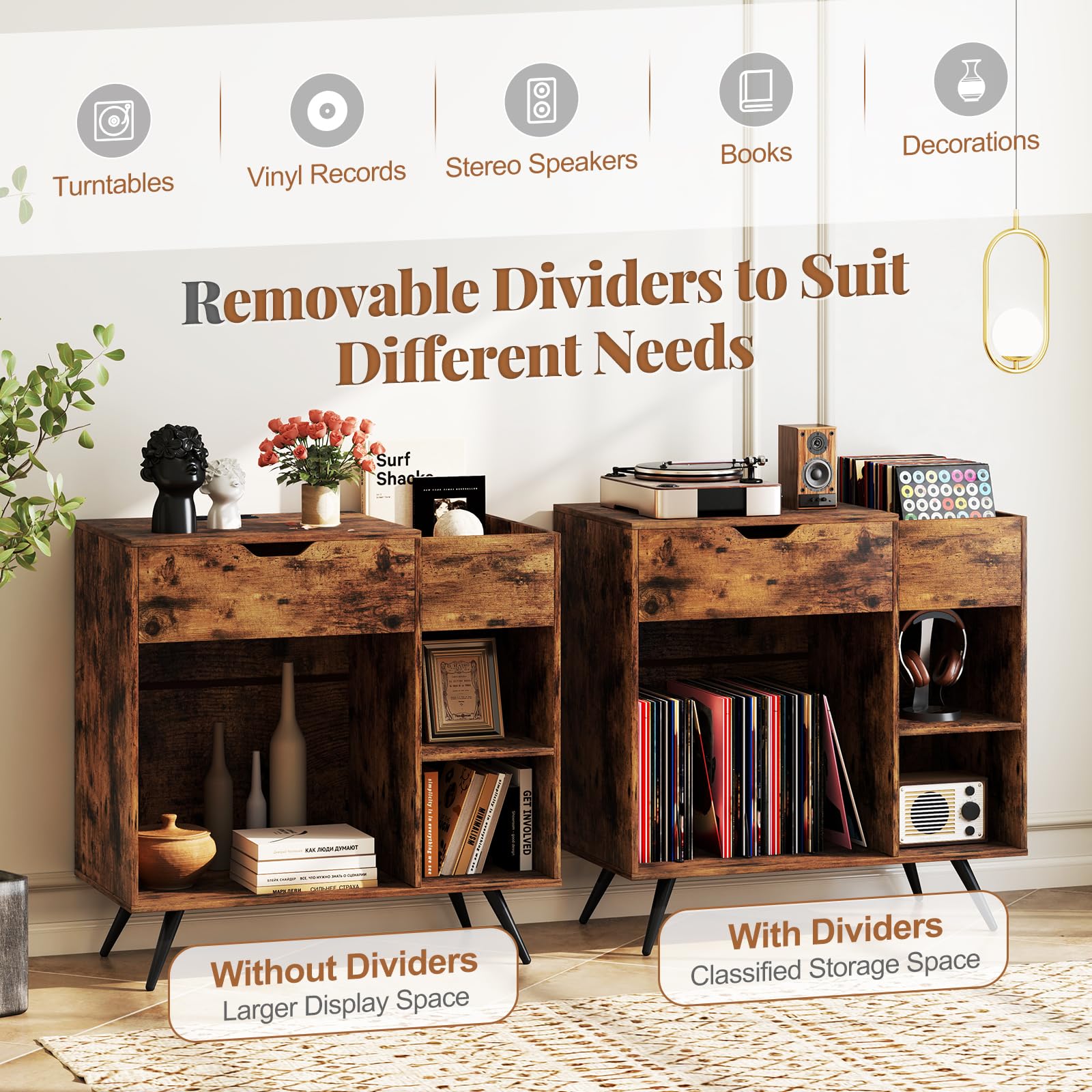 This mid-century record stand seamlessly blends vintage charm with modern functionality. The warm wood grain and sleek metal legs complement each other, adding unique character and style to any space. With ample storage for over 300 records, a built-in drawer, and an open display area, it offers both organization and easy access. The integrated power outlets and thoughtful cable management keep everything tidy and powered. Enhanced with anti-tip features and elevated legs for easy cleaning, this stand is the perfect combination of safety, convenience, and elegance for any vinyl enthusiast.