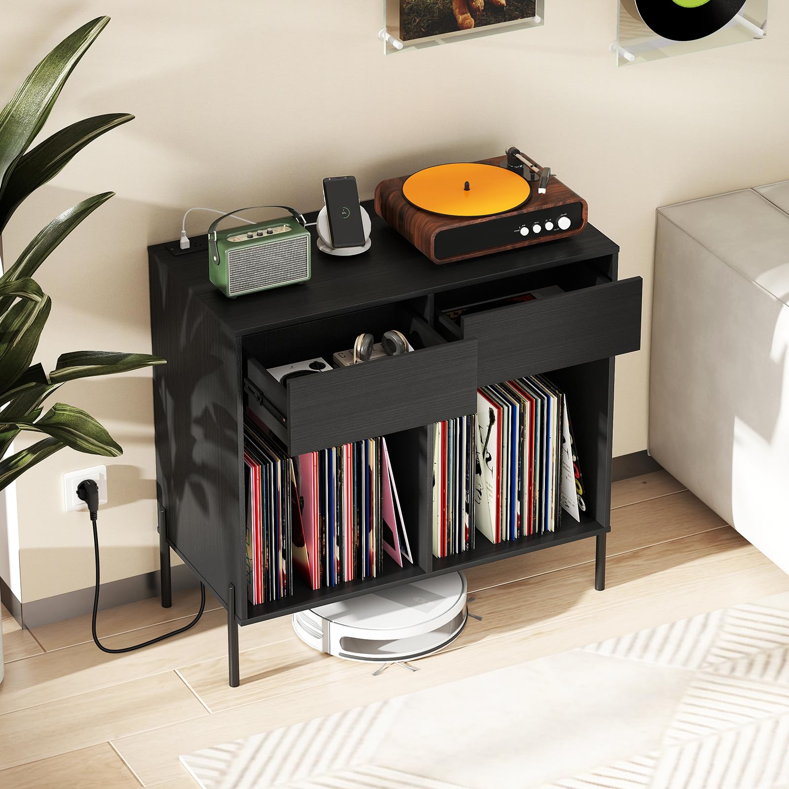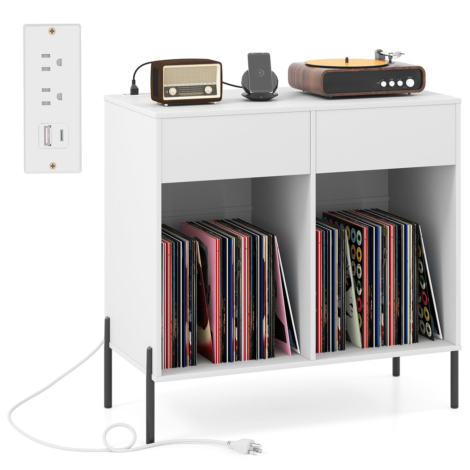 The convenient charging station allows you to charge multiple devices simultaneously. No more struggling with messy wires! There is a cable hole to maintain a neat appearance. In addition to its spacious top, the record player stand is designed with 2 drawers for storing media items. The open compartments feature removable dividers to suit different needs, providing flexible storage solutions for your vinyl records. This turntable display shelf includes 2 anti-toppling kits, ensuring a safe setup in your home. Together with metal support legs, higher stability is ensured. It is an ideal choice for music enthusiasts looking to create a dedicated space for their vinyl collection.