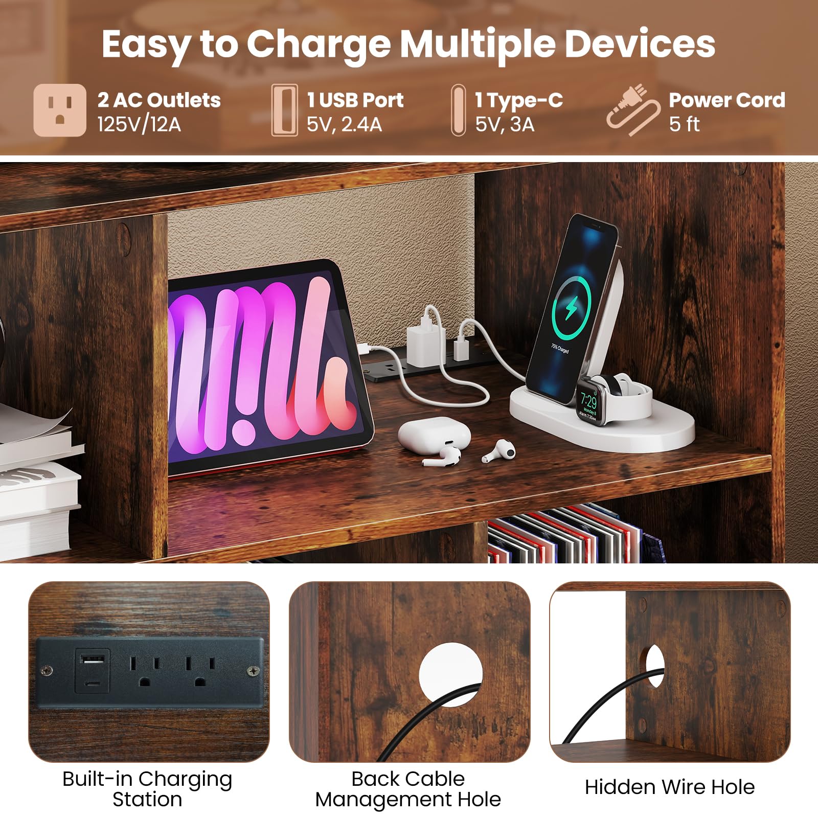 The record player stand with power strip is designed to keep your devices charged and ready to play. No more struggling with messy wires! There are 2 cable holes to maintain a neat appearance. The turntable stand comes with 2 open shelves and 4 compartments, offering ample space to organize your record collection and audio equipment. The vinyl record storage table is supported by 5 sturdy legs for higher stability. Safety is a priority with this piece, as it includes anti-toppling kits to securely anchor it to the wall. It is an ideal choice for music enthusiasts looking to create a dedicated space for their vinyl collection.