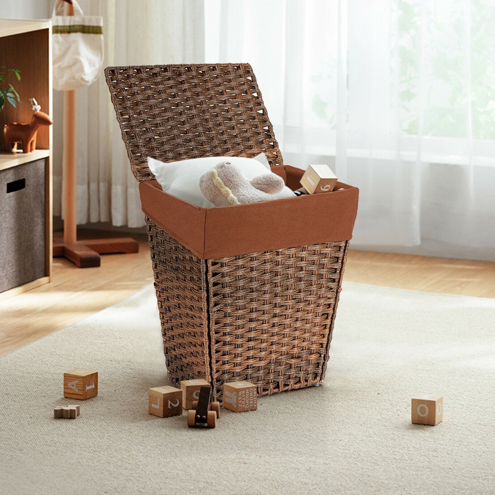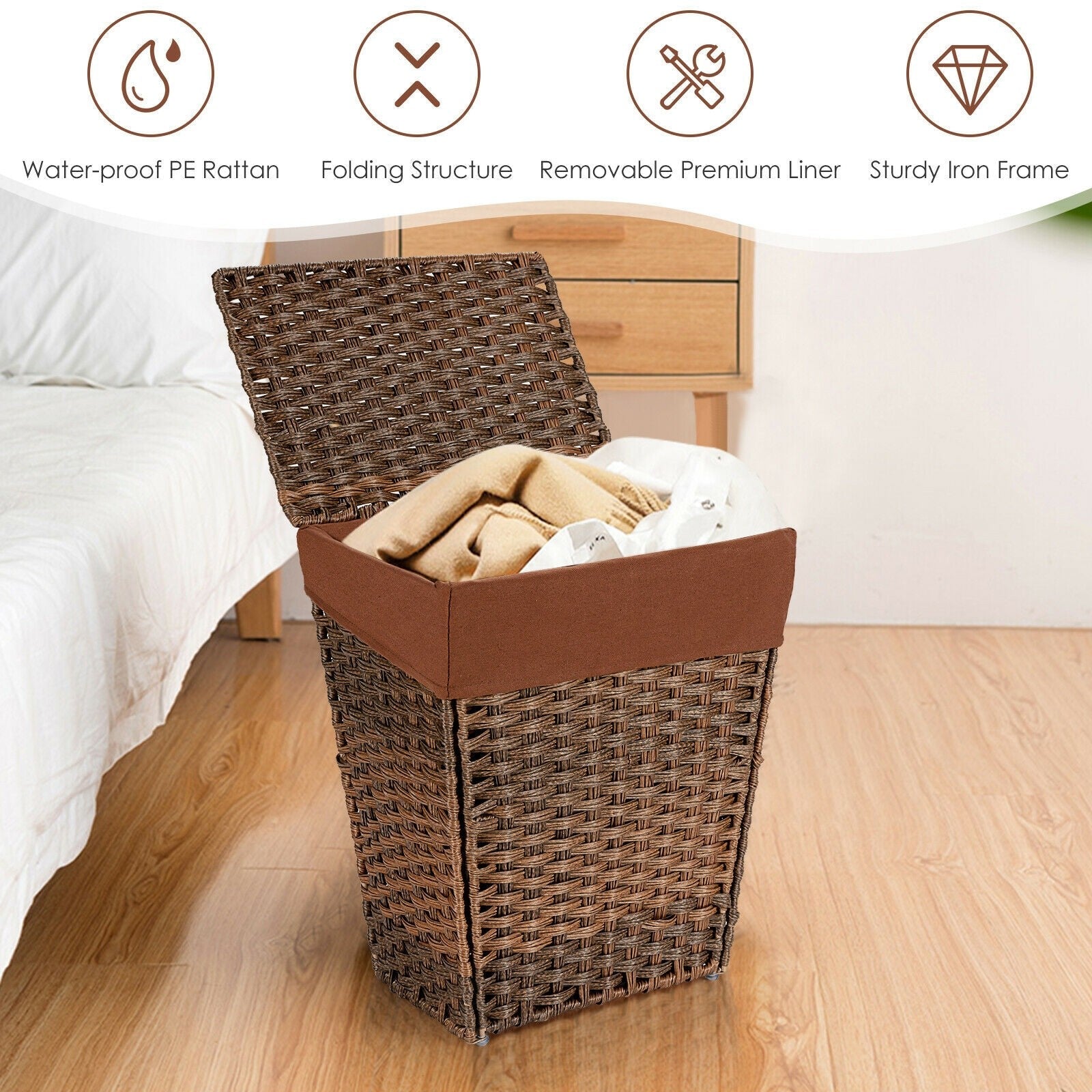 - Thoughtful & Humanized Details: Four anti-skid pads on the bottom make it more stable in a wet environment, avoiding slipping or toppling. And the liner bag is tied to the hamper so as to prevent falling. In addition, a handwoven synthetic rattan hamper with a beautiful look hides away your dirty clothes and adds an elegant touch to your house.