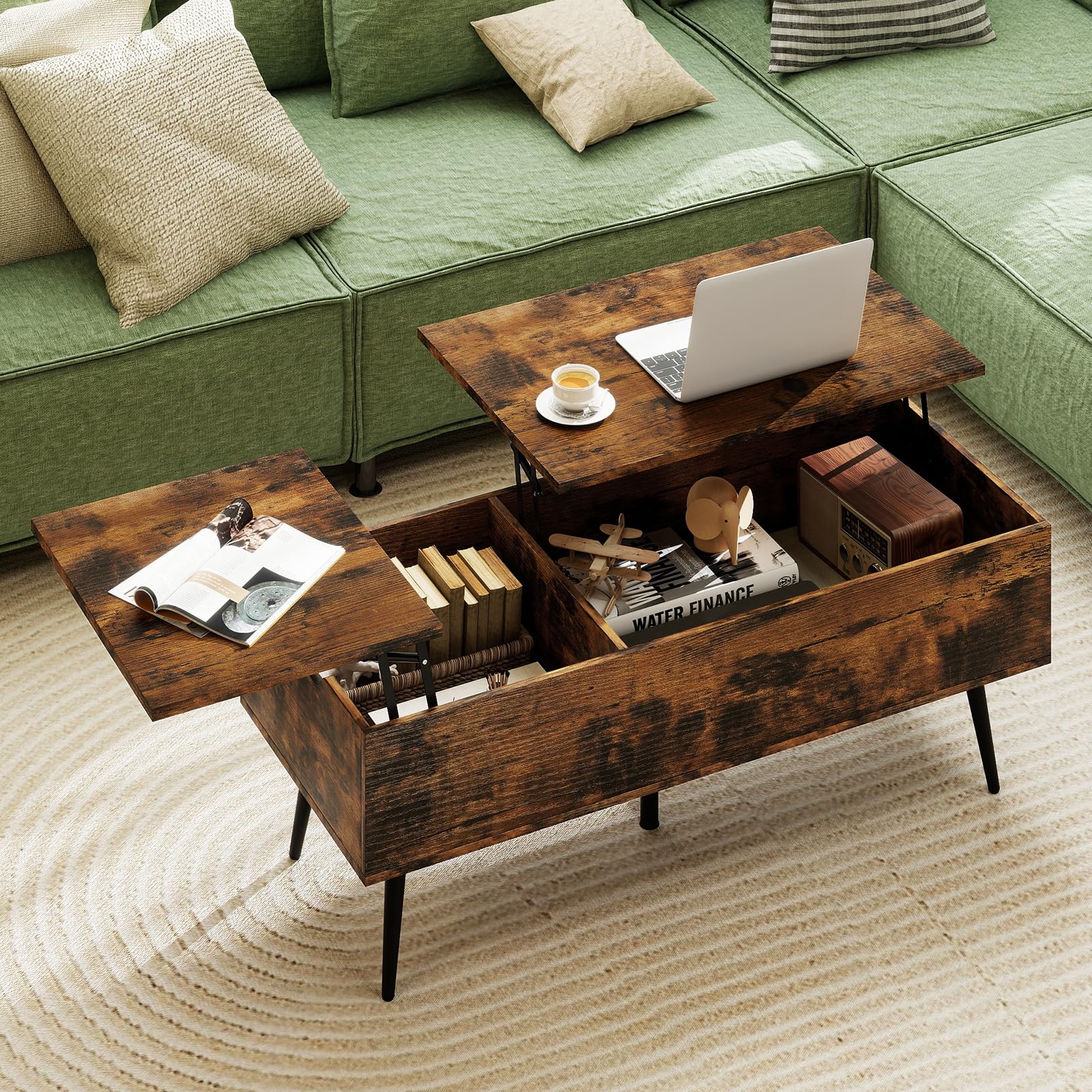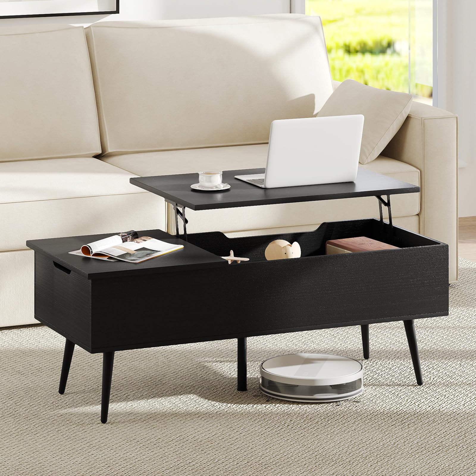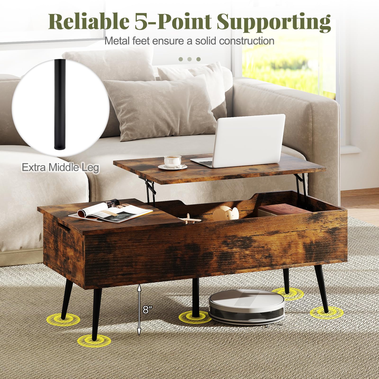 Upgrade your living space with this stylish and practical lift-top coffee table. Featuring a smooth, quiet lift mechanism, it easily transforms into a comfy workspace or casual dining table right from your couch. Dual hidden compartments keep your essentials—remotes, magazines, chargers—tidy and out of sight. Supported by 5 sturdy metal legs with non-slip pads, it offers exceptional stability without scratching your floor. The rich wood grain finish and mid-century flair bring instant charm to any room. Smart, sleek, and storage-savvy—just what your living room needs.