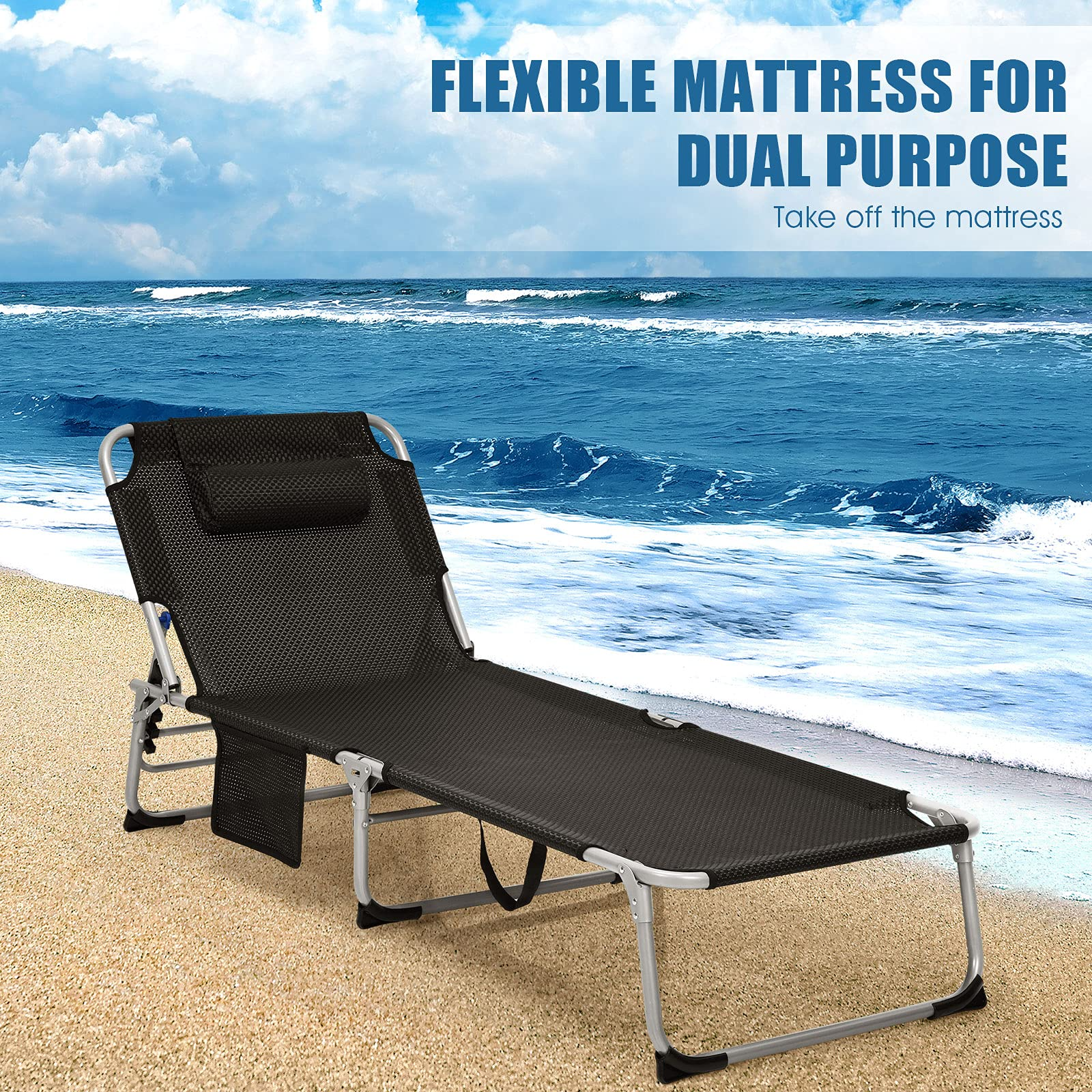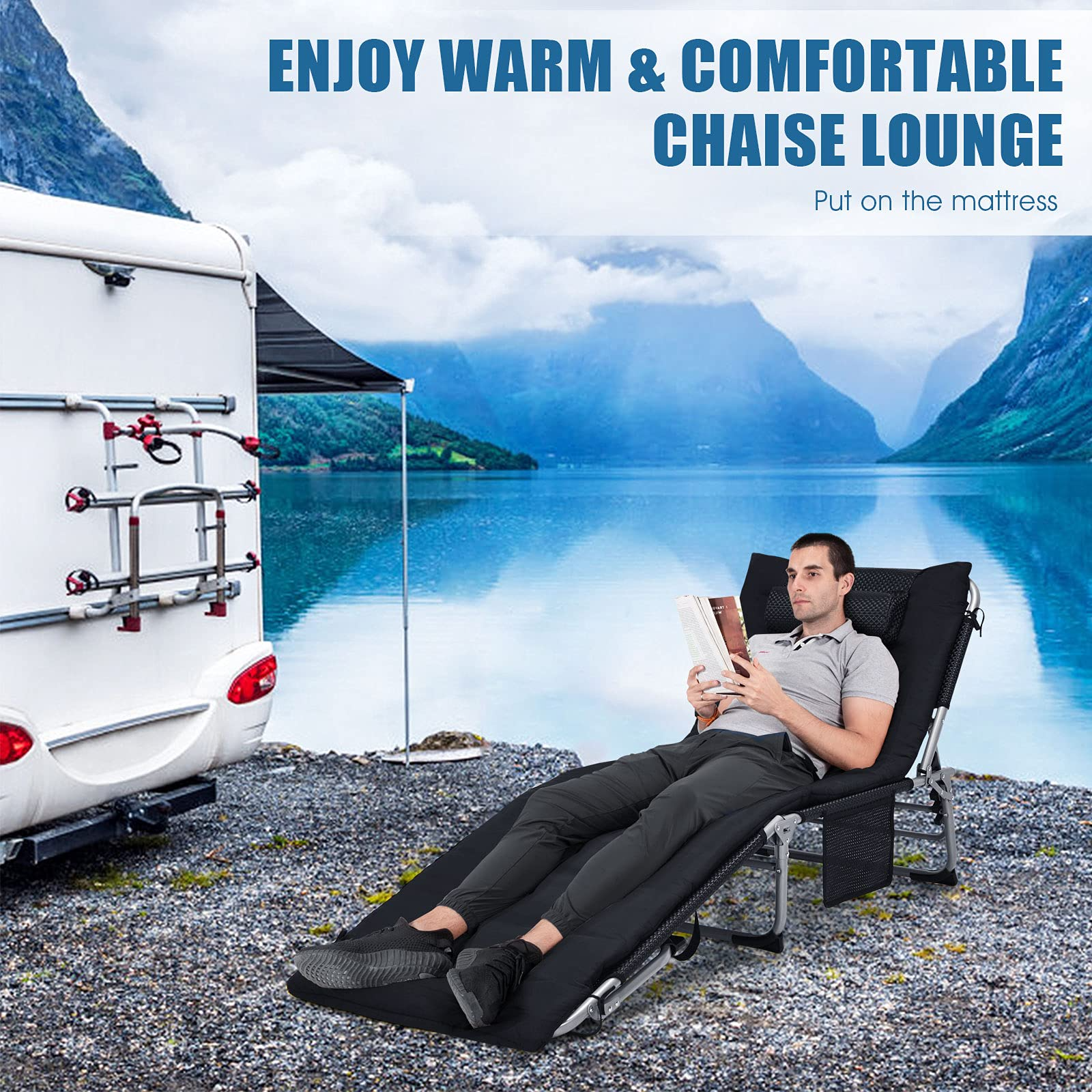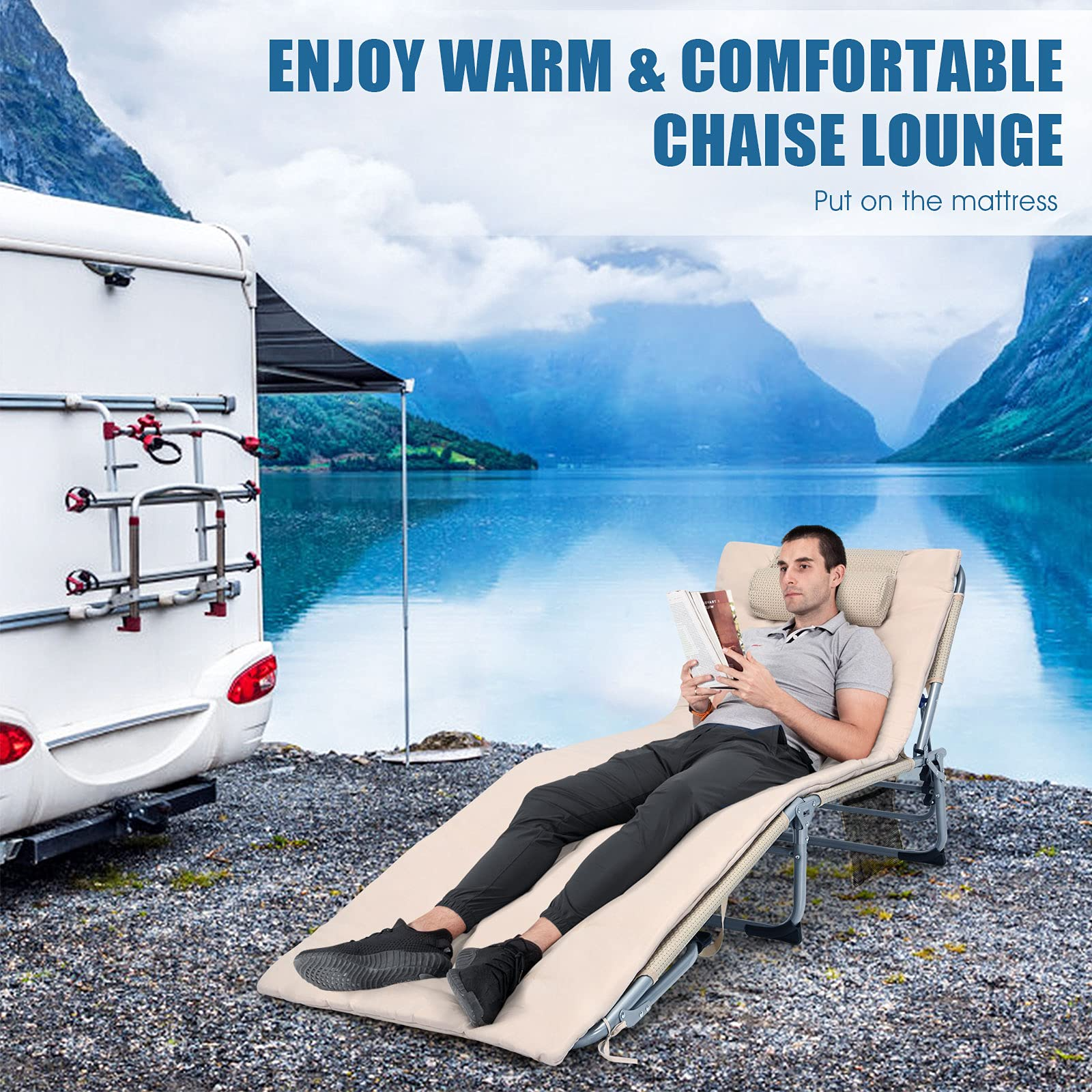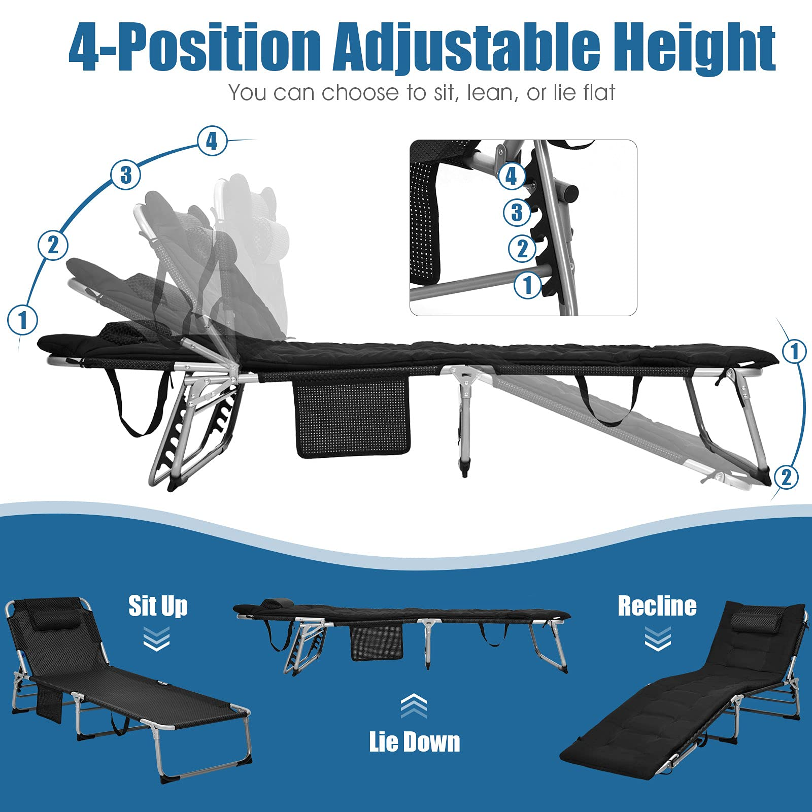 Composed of breathable fabric seat, steel frame, anti-slip bottom, this folding recliner offers reliability durability, stability and safety for long service time. The extra soft mattress allows you to have a more enjoyable travel experience while sleeping in the cot at night. The adjustable folding cot is designed with 4 positions adjustable locking system to meet you needs for relaxation and comfort. No matter you are seated or lying down, the ergonomic design could effectively and safely reduce tense muscle and support your body.