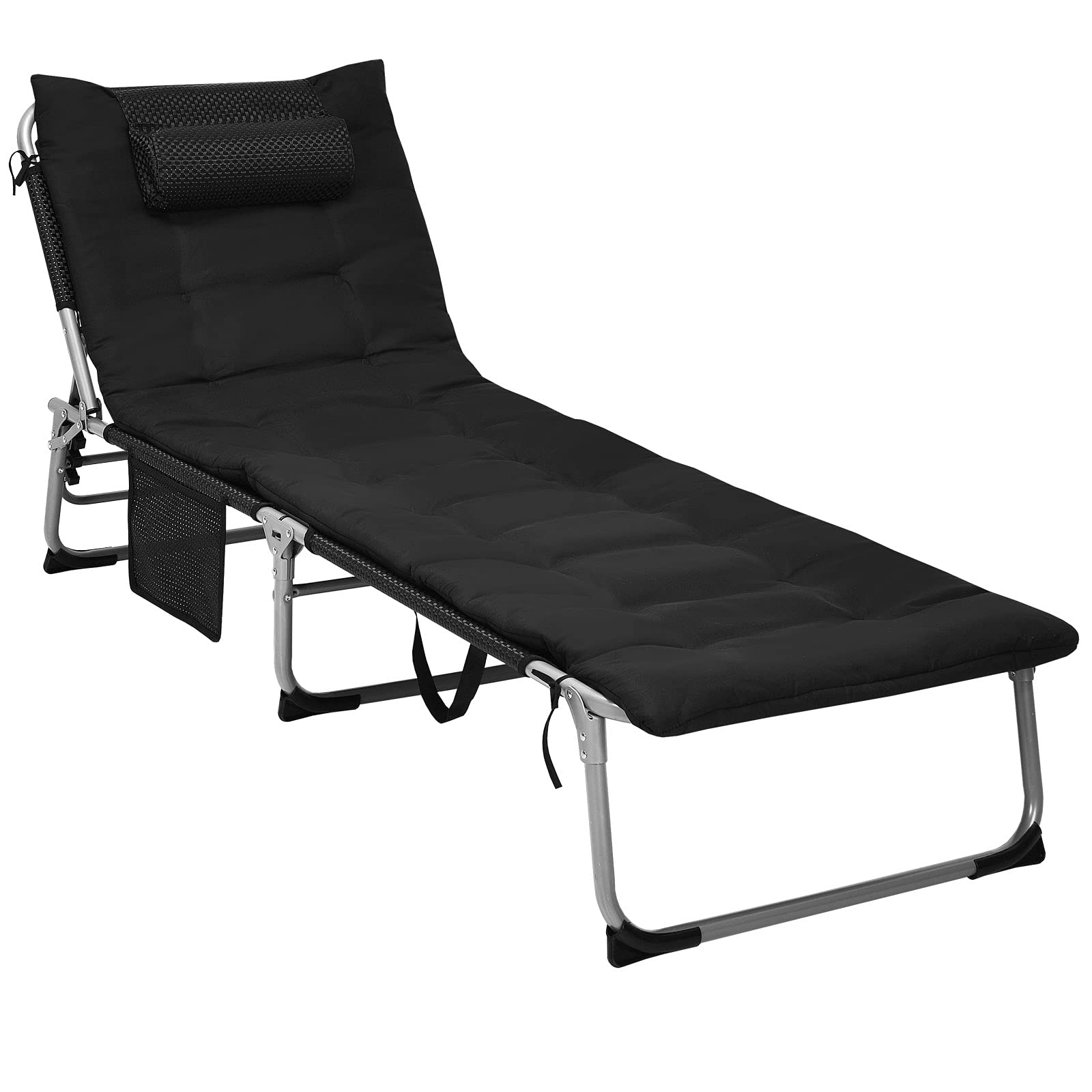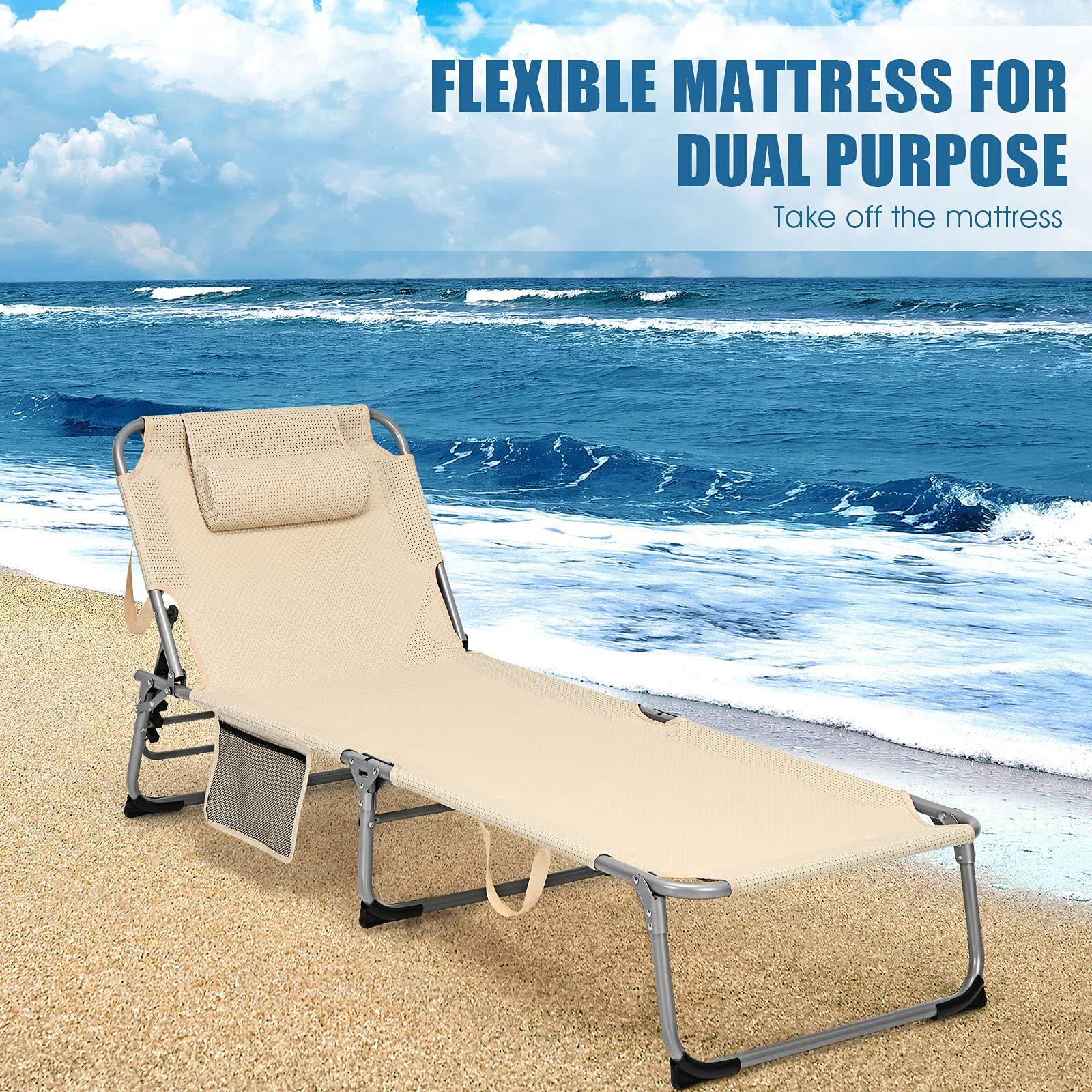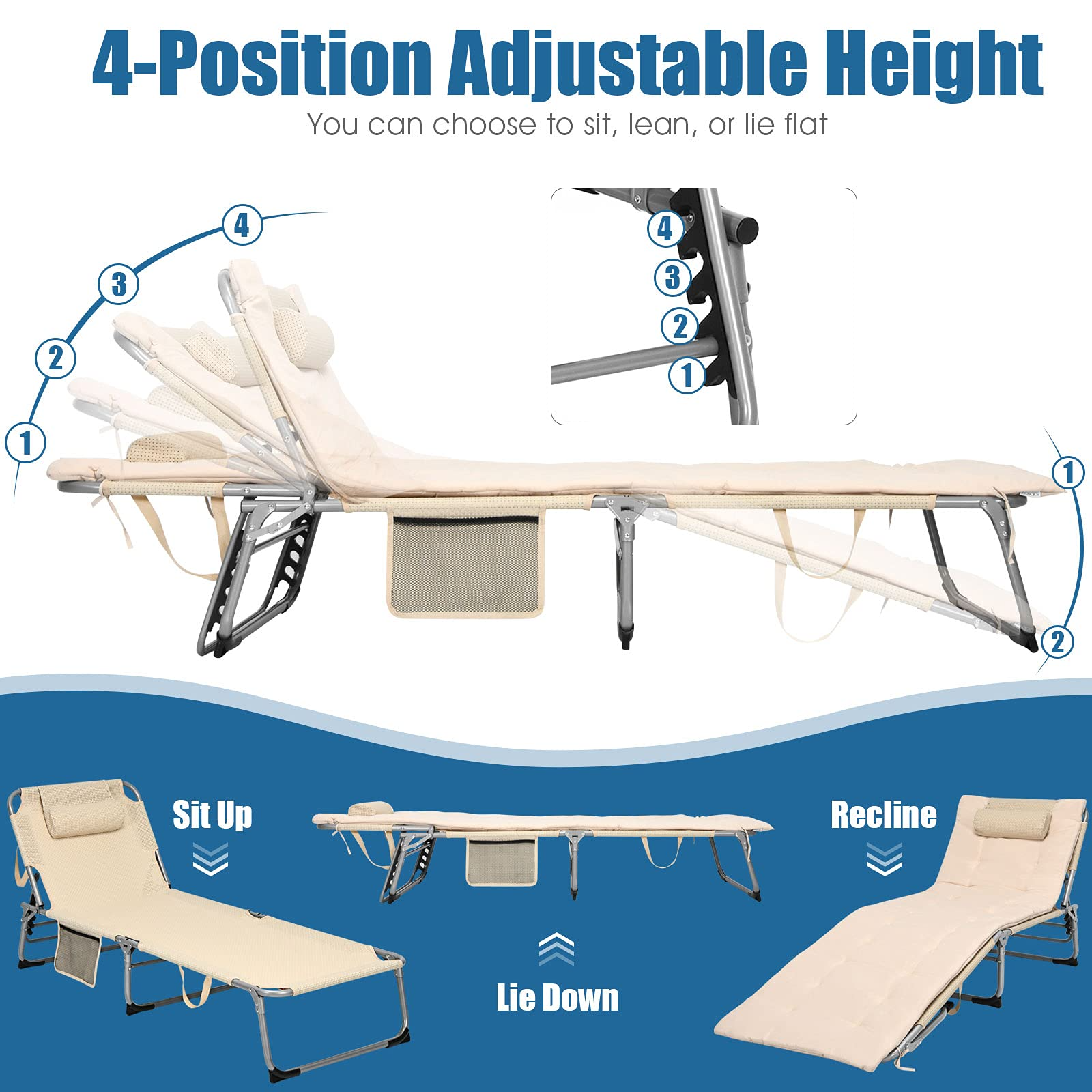 Composed of breathable fabric seat, steel frame, anti-slip bottom, this folding recliner offers reliability durability, stability and safety for long service time. The extra soft mattress allows you to have a more enjoyable travel experience while sleeping in the cot at night. The adjustable folding cot is designed with 4 positions adjustable locking system to meet you needs for relaxation and comfort. No matter you are seated or lying down, the ergonomic design could effectively and safely reduce tense muscle and support your body.