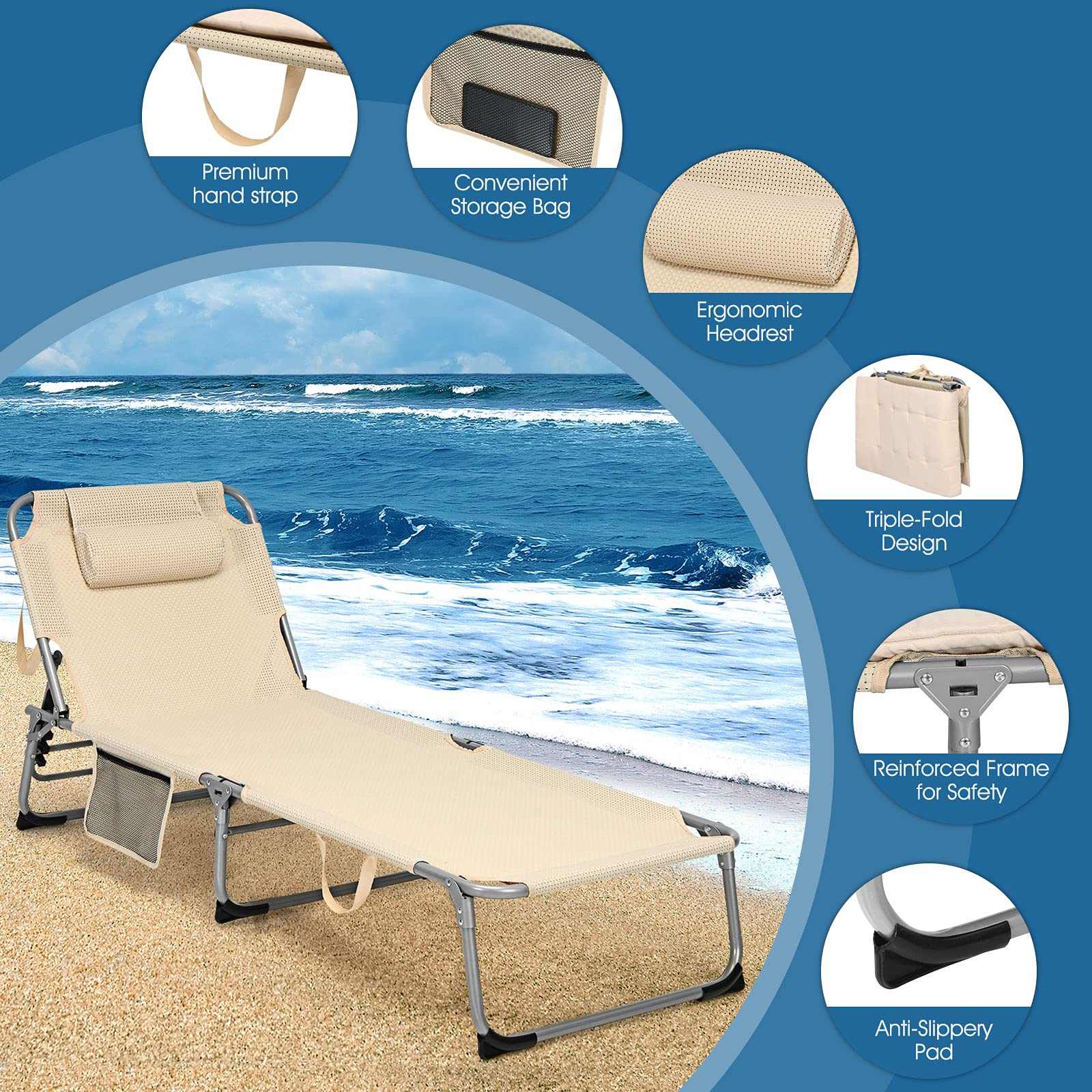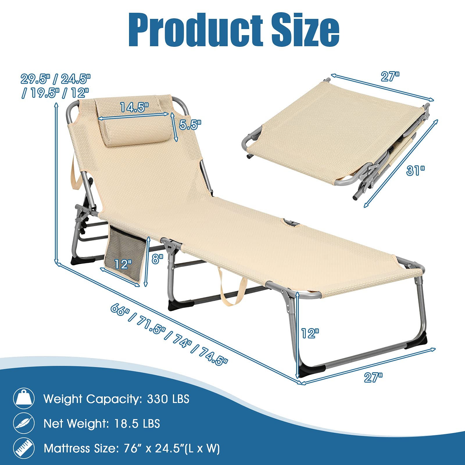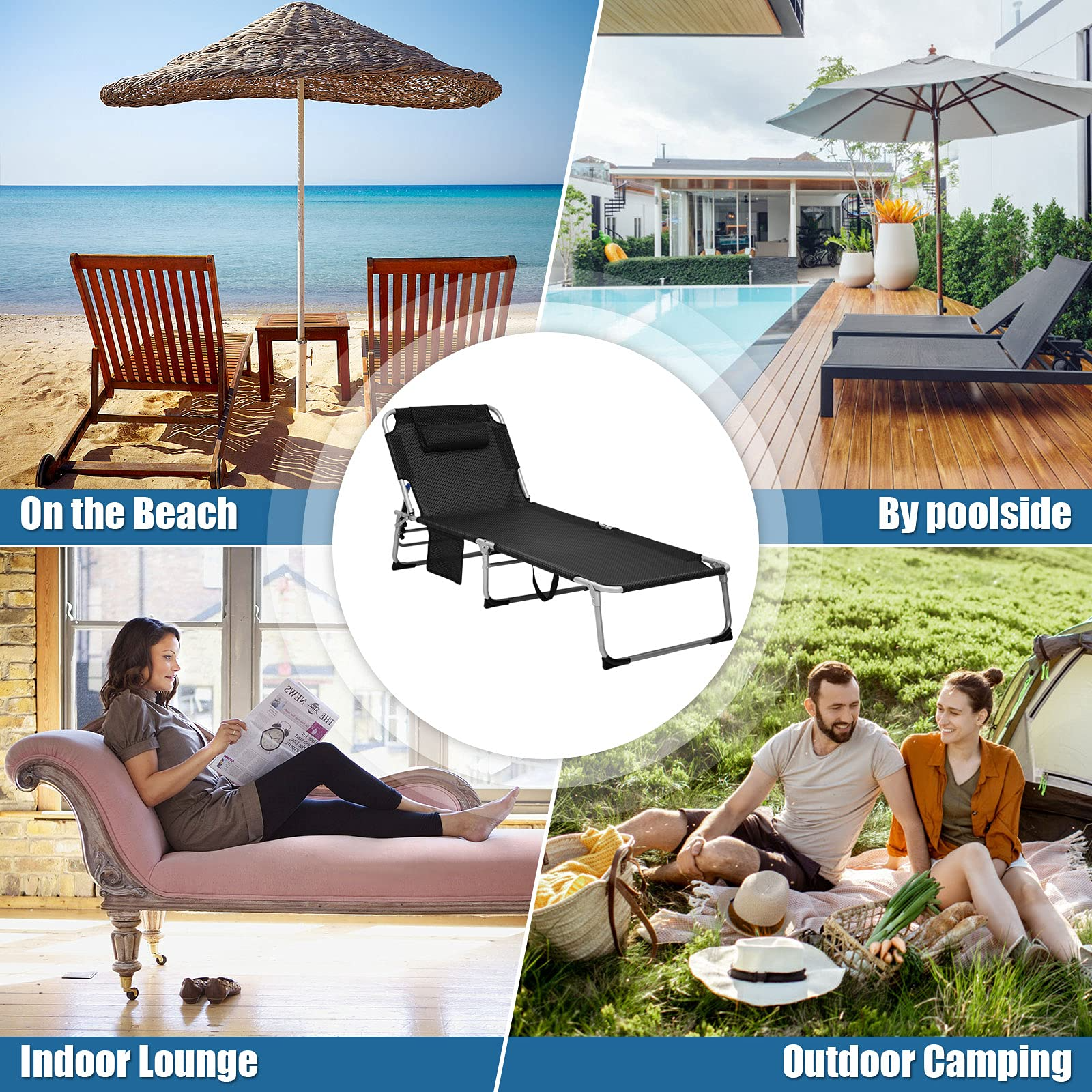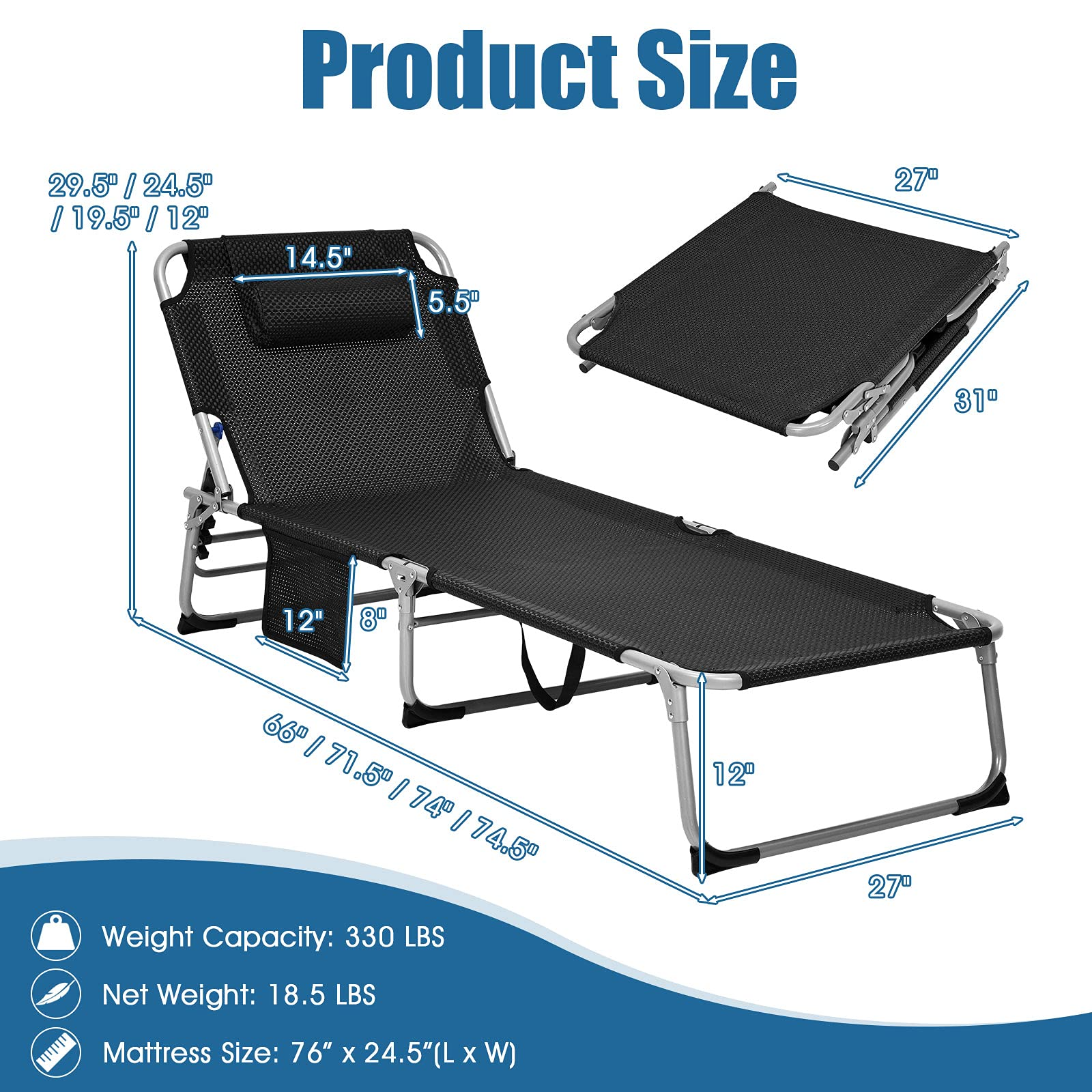 Composed of breathable fabric seat, steel frame, anti-slip bottom, this folding recliner offers reliability durability, stability and safety for long service time. The extra soft mattress allows you to have a more enjoyable travel experience while sleeping in the cot at night. The adjustable folding cot is designed with 4 positions adjustable locking system to meet you needs for relaxation and comfort. No matter you are seated or lying down, the ergonomic design could effectively and safely reduce tense muscle and support your body.