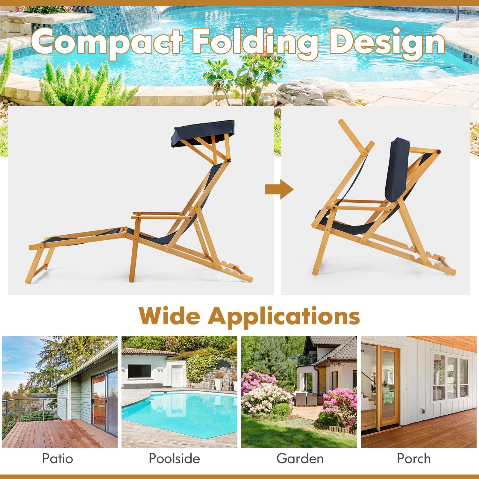 Enhance your outdoor experience with our versatile solid wood chaise lounge chair! Constructed from sturdy birch wood, this foldable beach lounge chair features an adjustable canopy and backrest to accommodate your sunbathing or leisurely reading sessions outdoors. The premium oxford fabric ensures year-round comfort and durability, with easy-to-find replacements for a fresh update. Portable and easy to transport, this outdoor chaise lounge is perfect for various outdoor settings. Complete with comfortable armrests and a footrest, it offers maximum relaxation and effortlessly complements any outdoor area, whether it's on the patio, by the pool, in the courtyard, or garden.