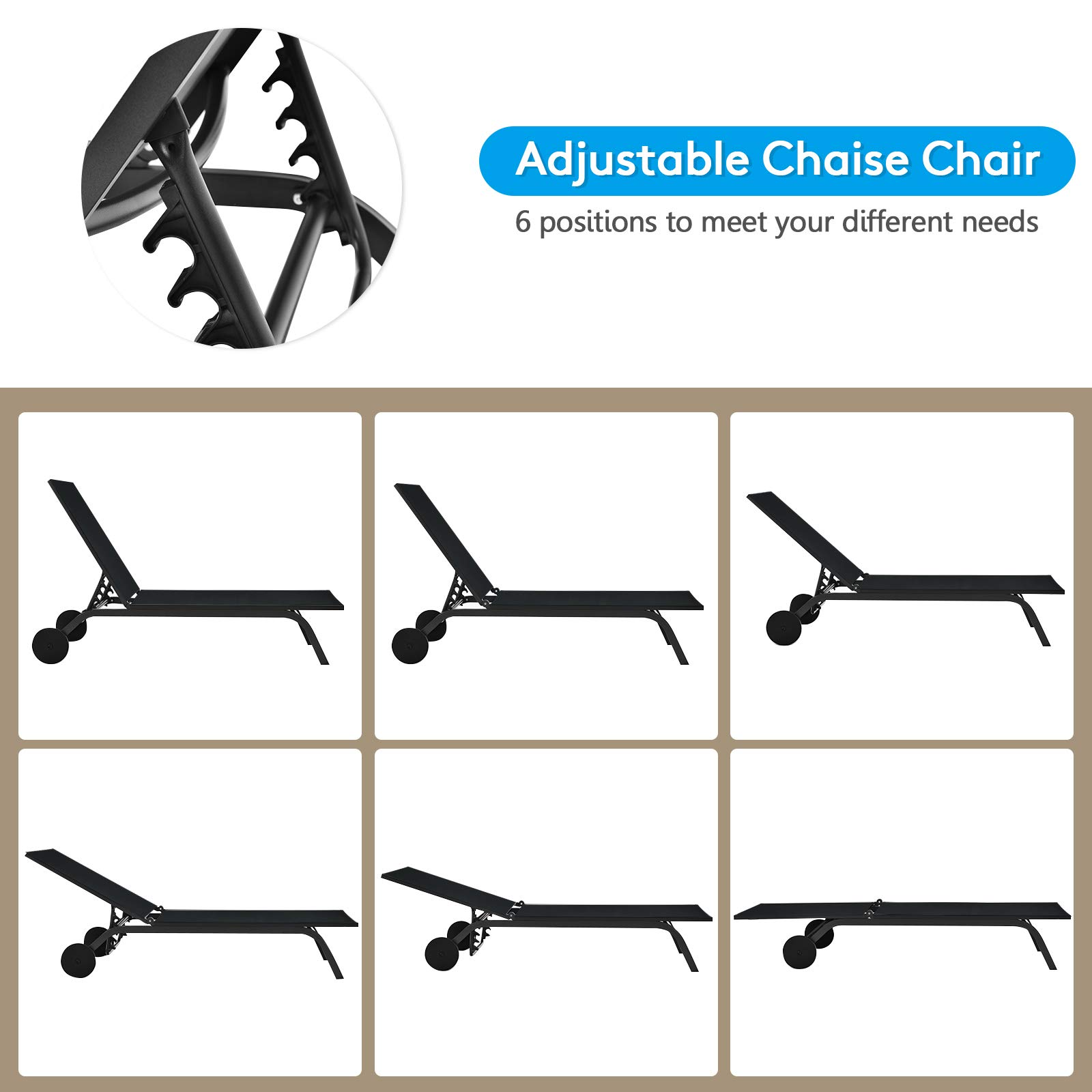 - Adjustable Backrest with 6 Positions Providing 6 positions(13", 23.5", 29", 34", 38.5", 42"), the design allows you to adjust the backrest of chaise lounge to enjoy sunshine at the best angle, which perfectly to fit the curve of your body and work greatly in offering you great enjoyment.