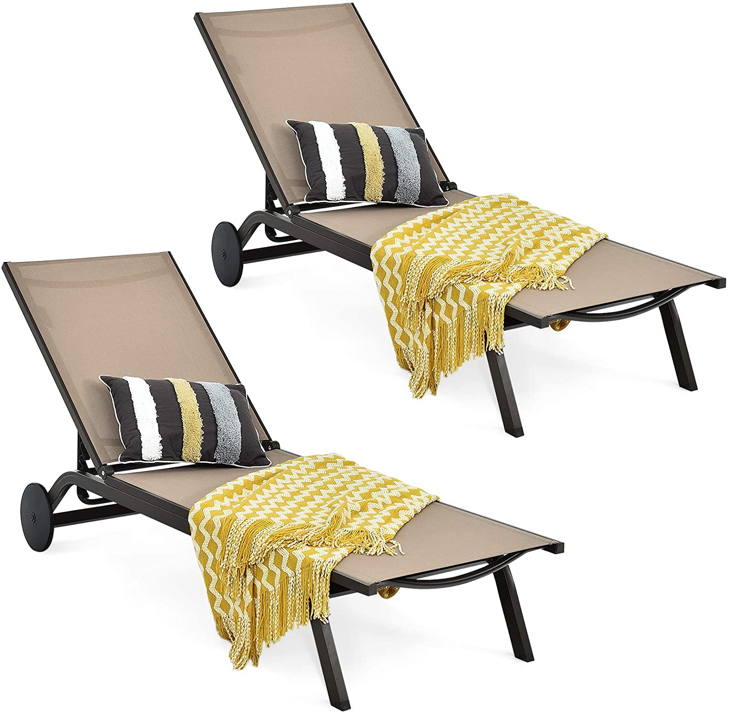 This outdoor lounge chair will create an ideal place for you to take a nap, read or rest. Crafted of heavy-duty aluminum frame, this recliner is rustproof and corrosion-resistant for long-term use. Its backrest and seat are made of breathable fabric, which makes you feel cool outdoors even in hot summer. Most importantly, this recliner has five adjustable backrest positions and you can choose various postures at will for maximum comfort. Moreover, there are 2 wheels on the back of chaise lounge, which ensure easy movement.