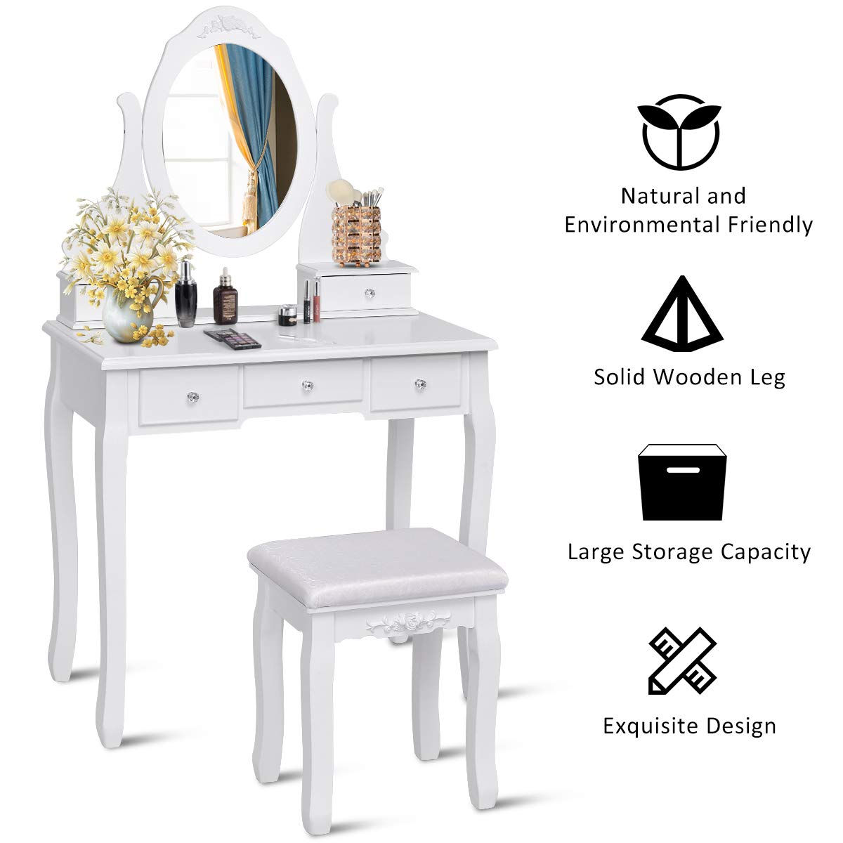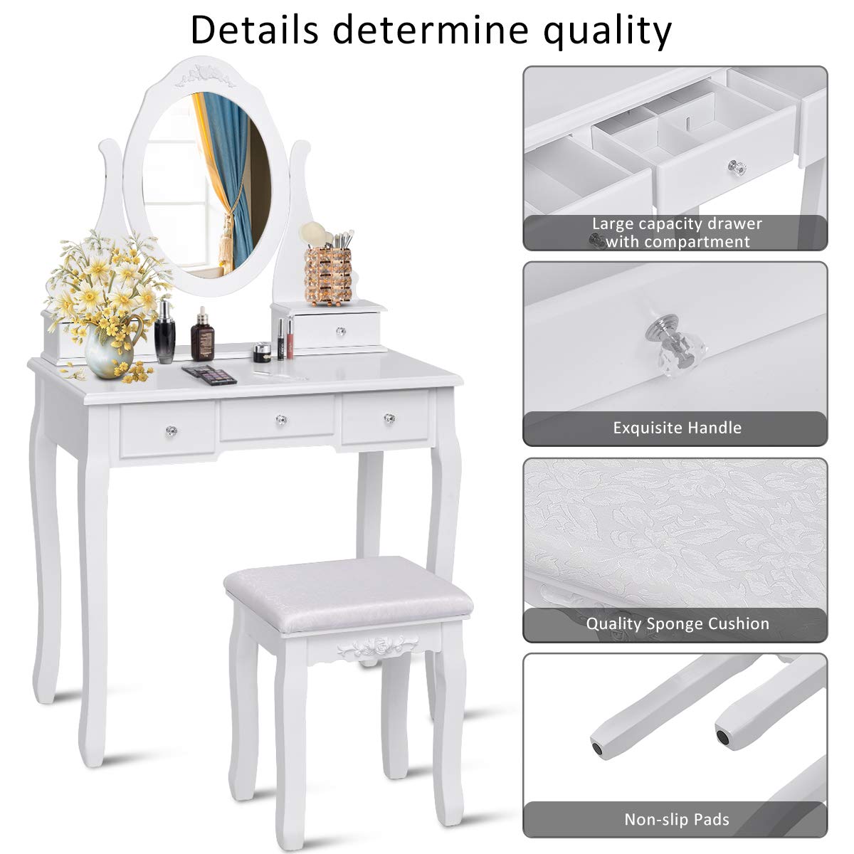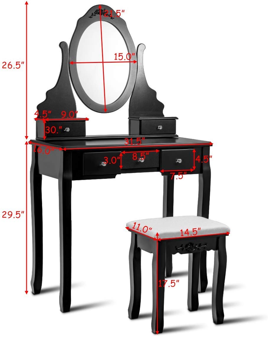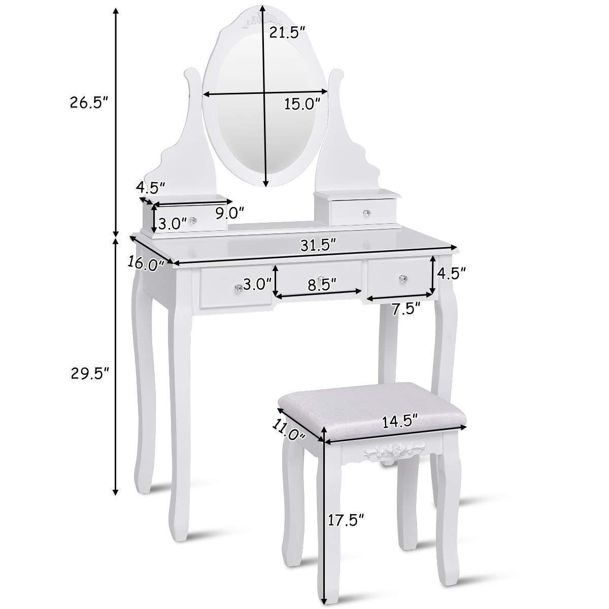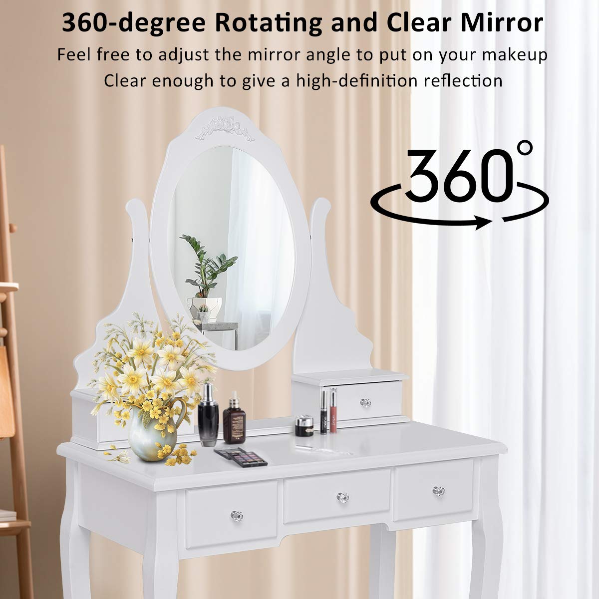 - Pretty Dressing Table with 5 Functional Drawers: Have you always wanted to have a beautiful and practical dressing table? Our dressing table is very exquisite, and you will like it very much after receiving it. It comes with 5 removable drawers, 2 on the mirror stand, and 3 drawers on the table. The top is easy to detach and is a writing desk. You will save the trouble of purchasing 2 tables. The non-slip pads of the table and stool legs are to protect the floor from being scratched.