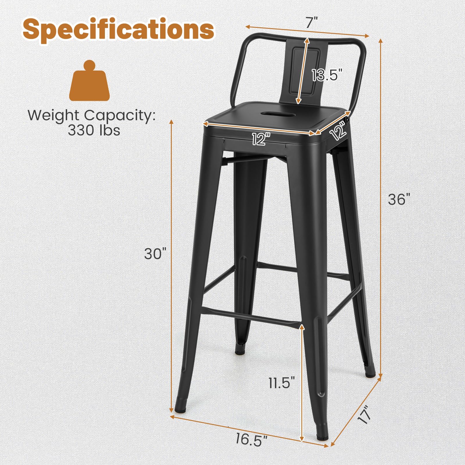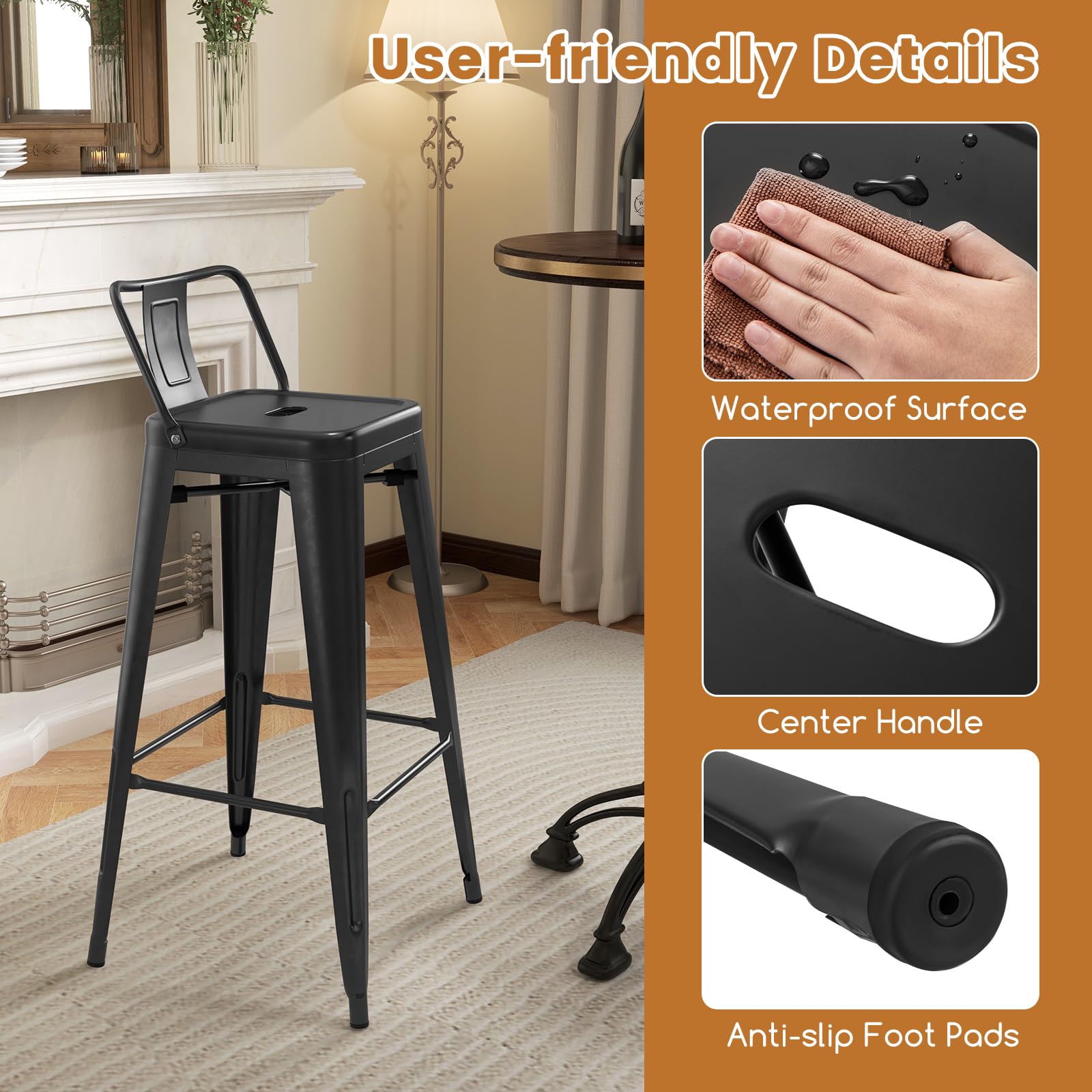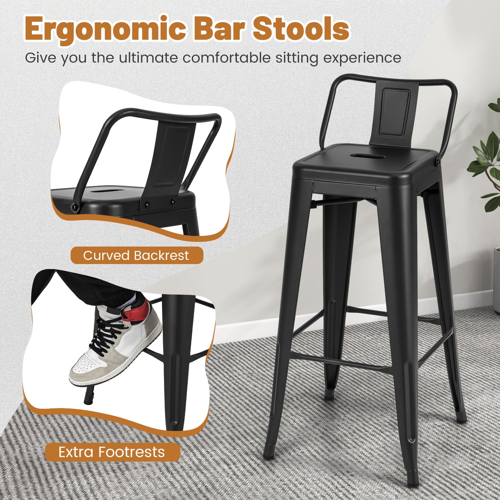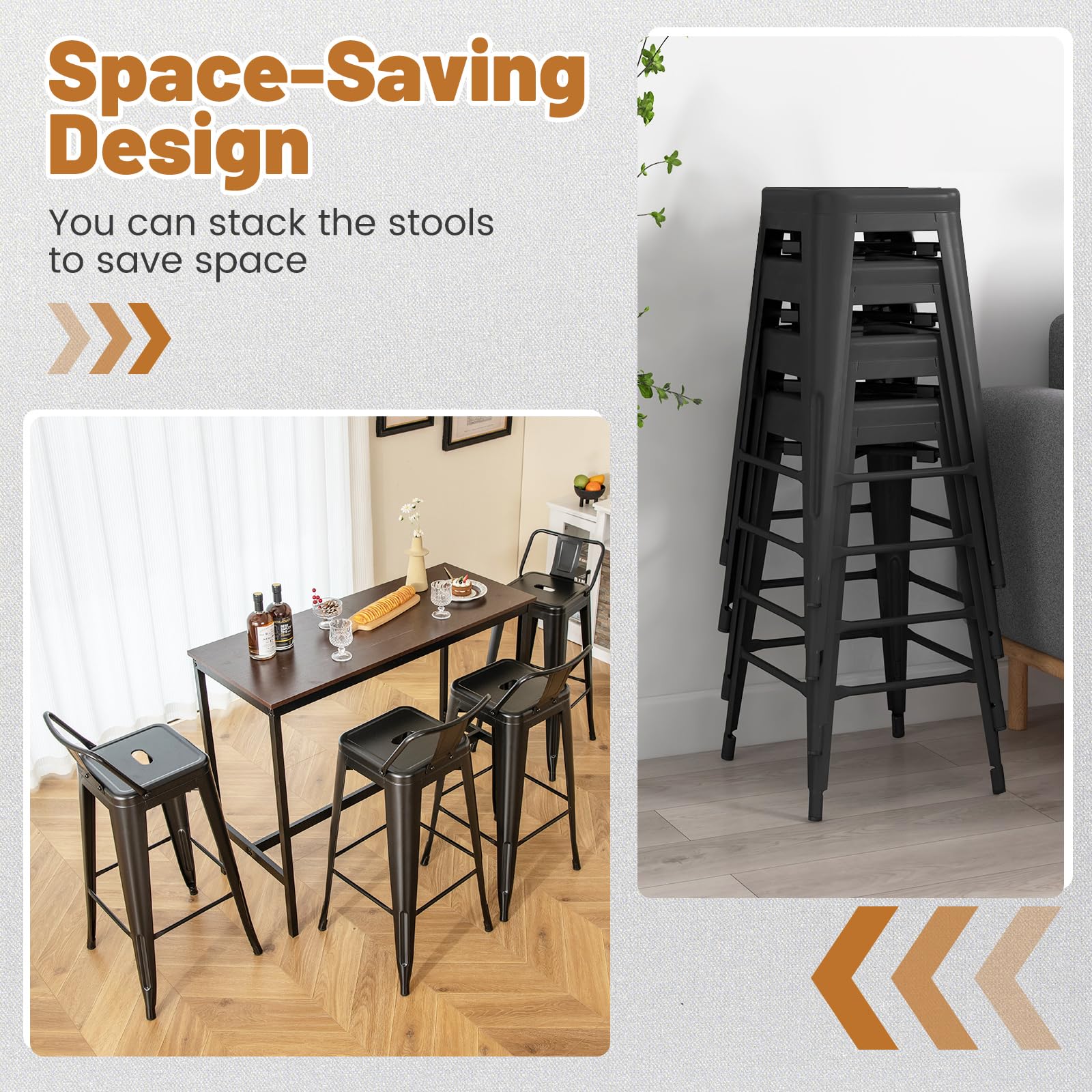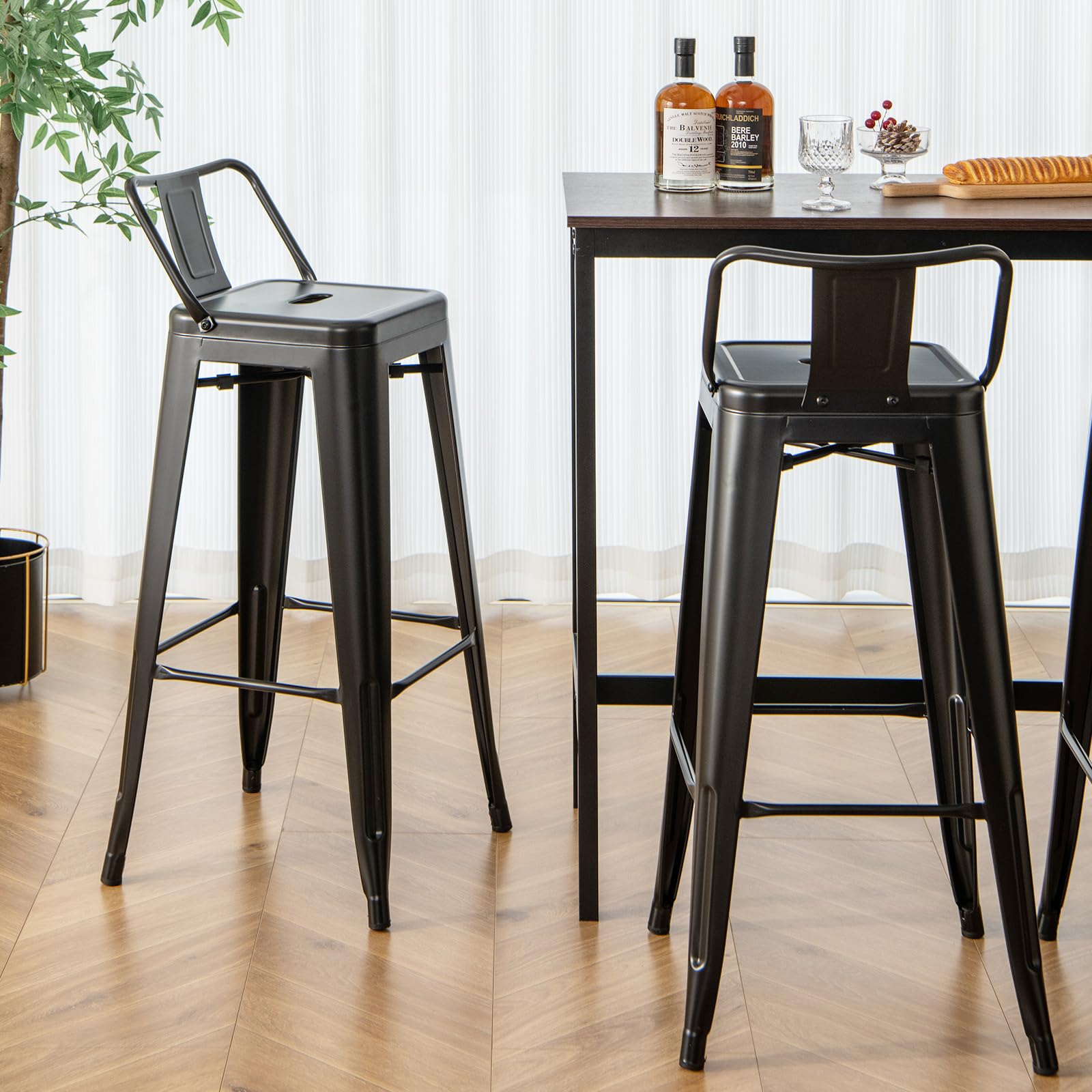Crafted for longevity, these bar stools boast a sturdy metal construction for reliable support. The rubber feet protect your floors from marks and scratches. Besides, the bar height chairs come with a low backrest, ensuring comfort during long sittings, whether you're enjoying a meal or working. The considerate footrest further enhances comfort and promotes a relaxed seating position. Featuring detachable backrest, these barstools are also stackable, making storage a breeze and saving much space. Equipped with protective pads, the stackable chairs prevent scratching when stacked together. Whether used for your kitchen counter, or adding a stylish touch to your dining area, the metal bar chairs offer a reliable and attractive choice.