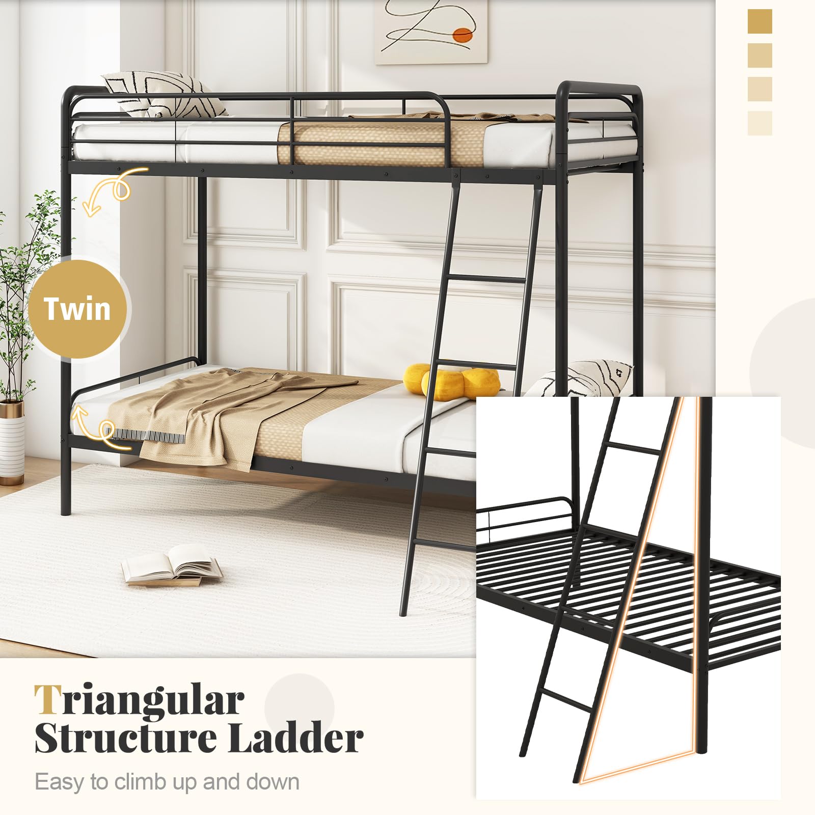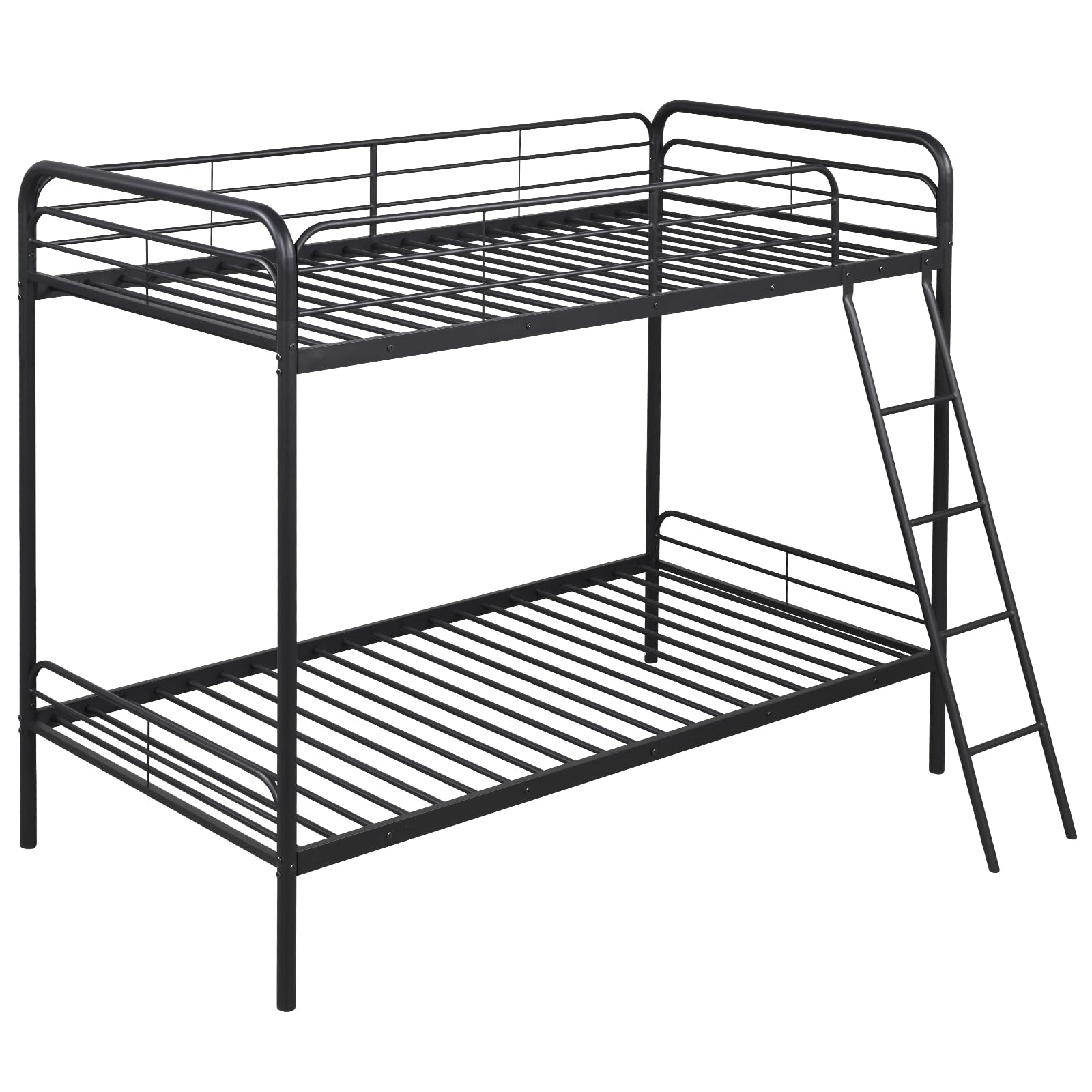 The twin over twin configuration offers a practical sleeping solution for siblings, roommates, or overnight guests, catering to various needs. The metal slatted bed frame is crafted for long-lasting durability, providing a sturdy foundation for your mattress and ensuring reliable support.Besides, the ample under-bed space can be utilized for extra storage, perfect for bins, shoes, or other accessories. Combining functionality with a sleek design, the bunk bed adds a contemporary touch to any space.