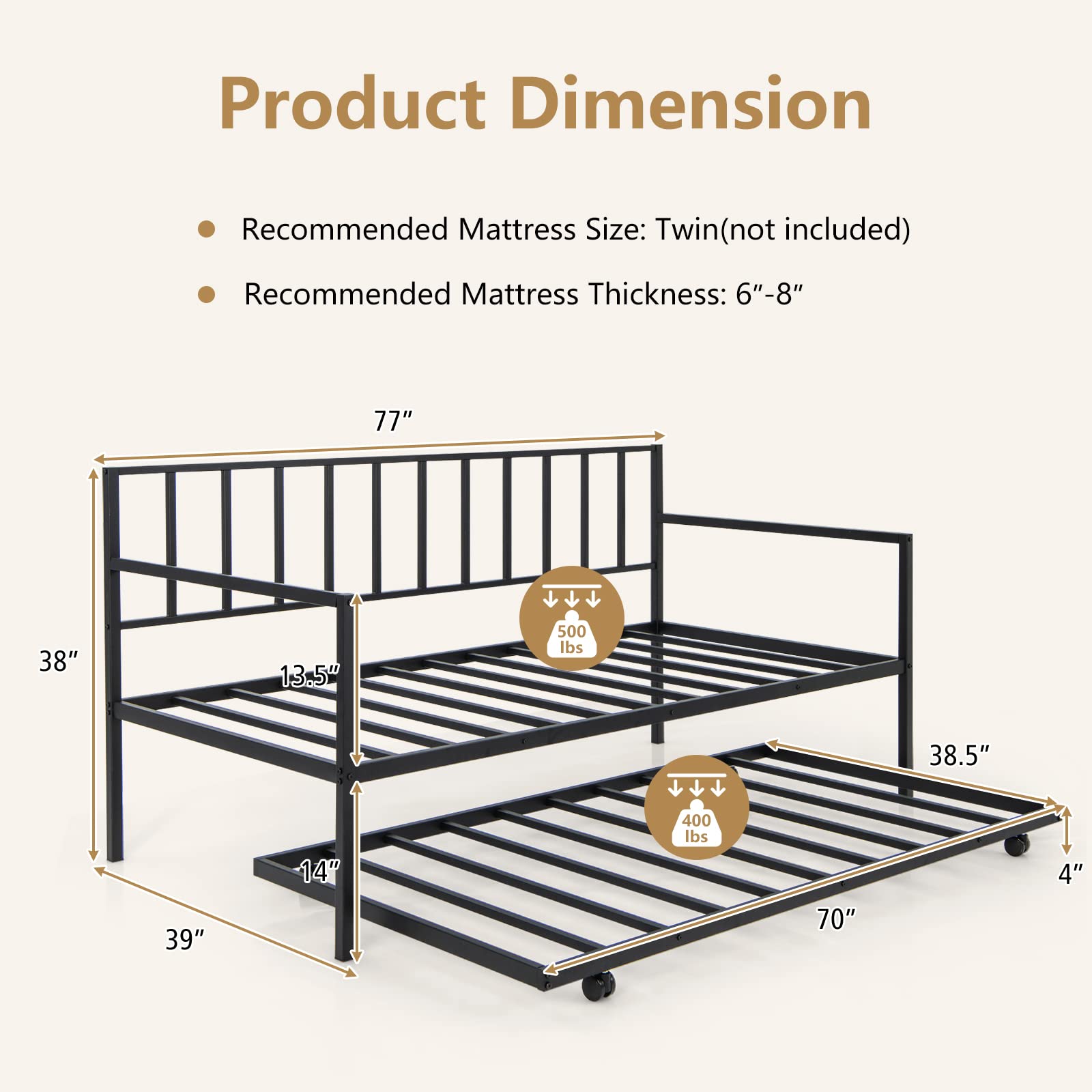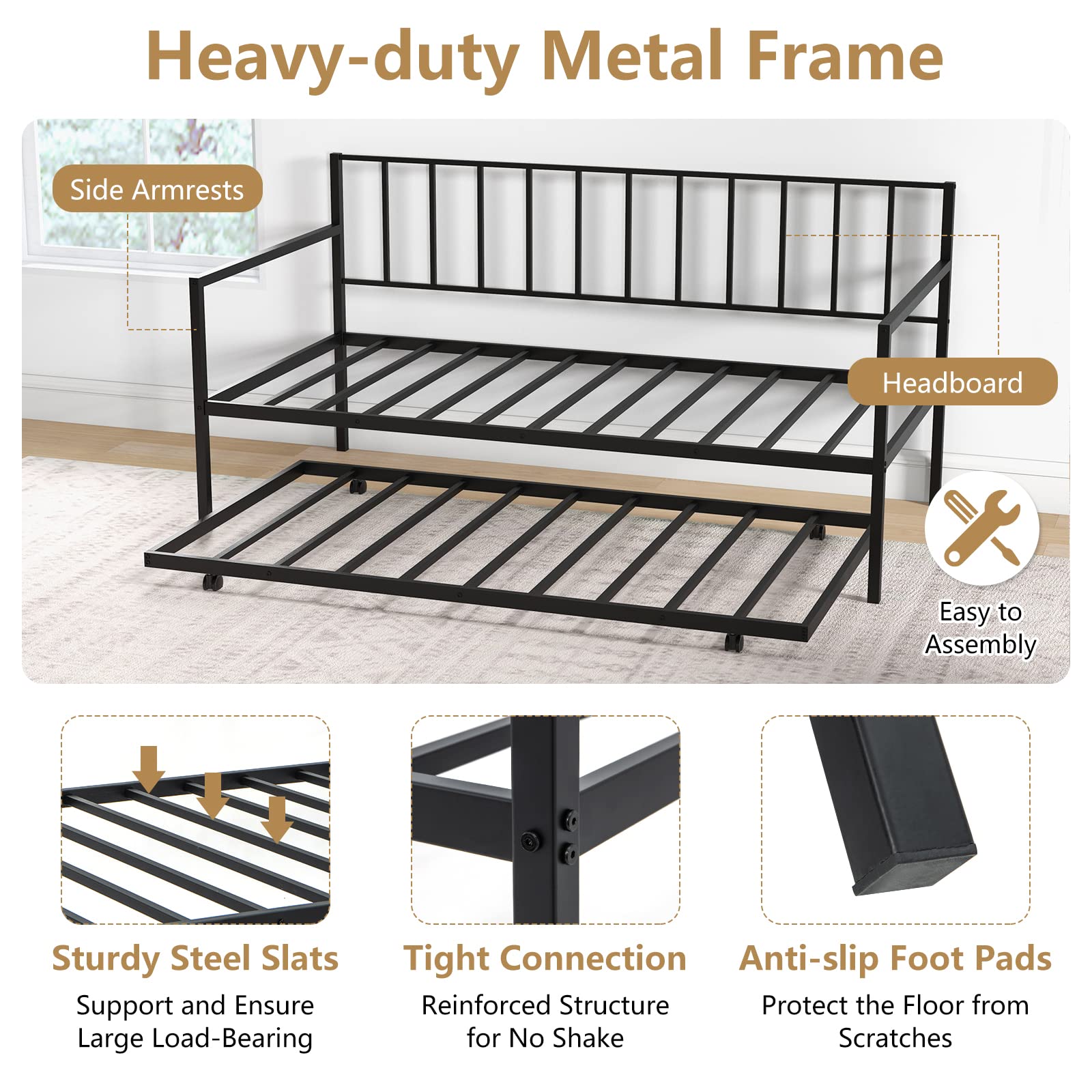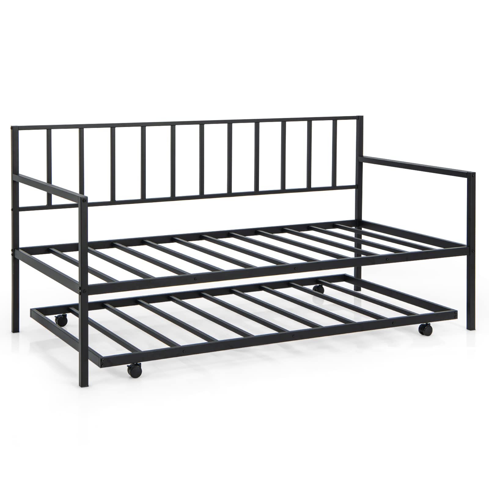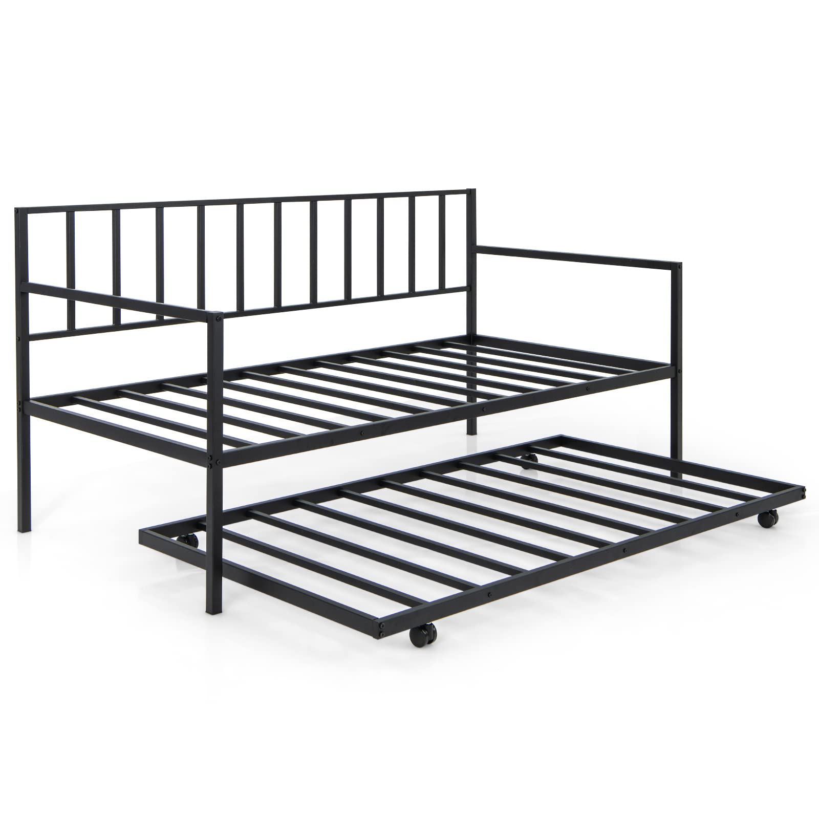 Tired of your bland room decorations and want to make a change? Our twin metal day bed is a unique fixture, which can bring in a touch of stylish and vintage design with a pull-out trundle! Featuring a contemporary design with a sturdy metal frame, this daybed with trundle is perfect for hosting additional guests in your home. The main bed will fit any standard-sized mattress, and the trundle will fit a standard twin mattress. Moreover, the side rails and heavy-duty steel slats ensure great stability and durability. A practical and concise twin metal daybed to bring a good sleep experience for you!