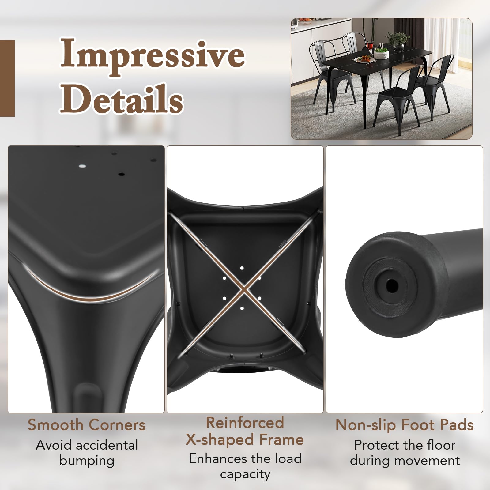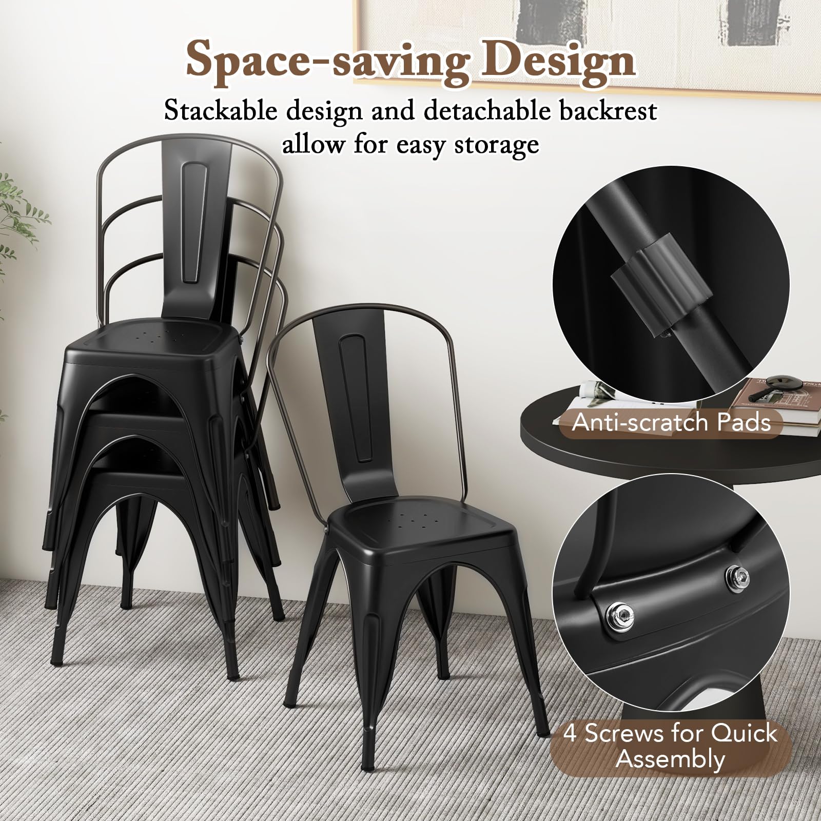 Crafted from stable powder-coated metal frame, each bistro side chair supports a substantial weight. Furthermore, the seats of these dining chairs feature holes to promote drainage. Additionally, the kitchen chairs allow you to economize space efficiently by stacking the chairs vertically when not in use. To avoid any potential marks or scuffs during stacking, each chair is equipped with rubber pads. Moreover, each chair's backrest is ergonomically sculpted, providing comfortable support that aligns with the natural curvature of your spine. For added versatility, the backrest can be detached to cater to different needs. The metal dinner chair features impressive details such as smooth corners and non-slip pads, making it a fitting choice for both your safety and floor protection. Featuring a concise and classic style, the armless dinner chairs is perfect for various settings, such as dining room, restaurant, bar or patio.