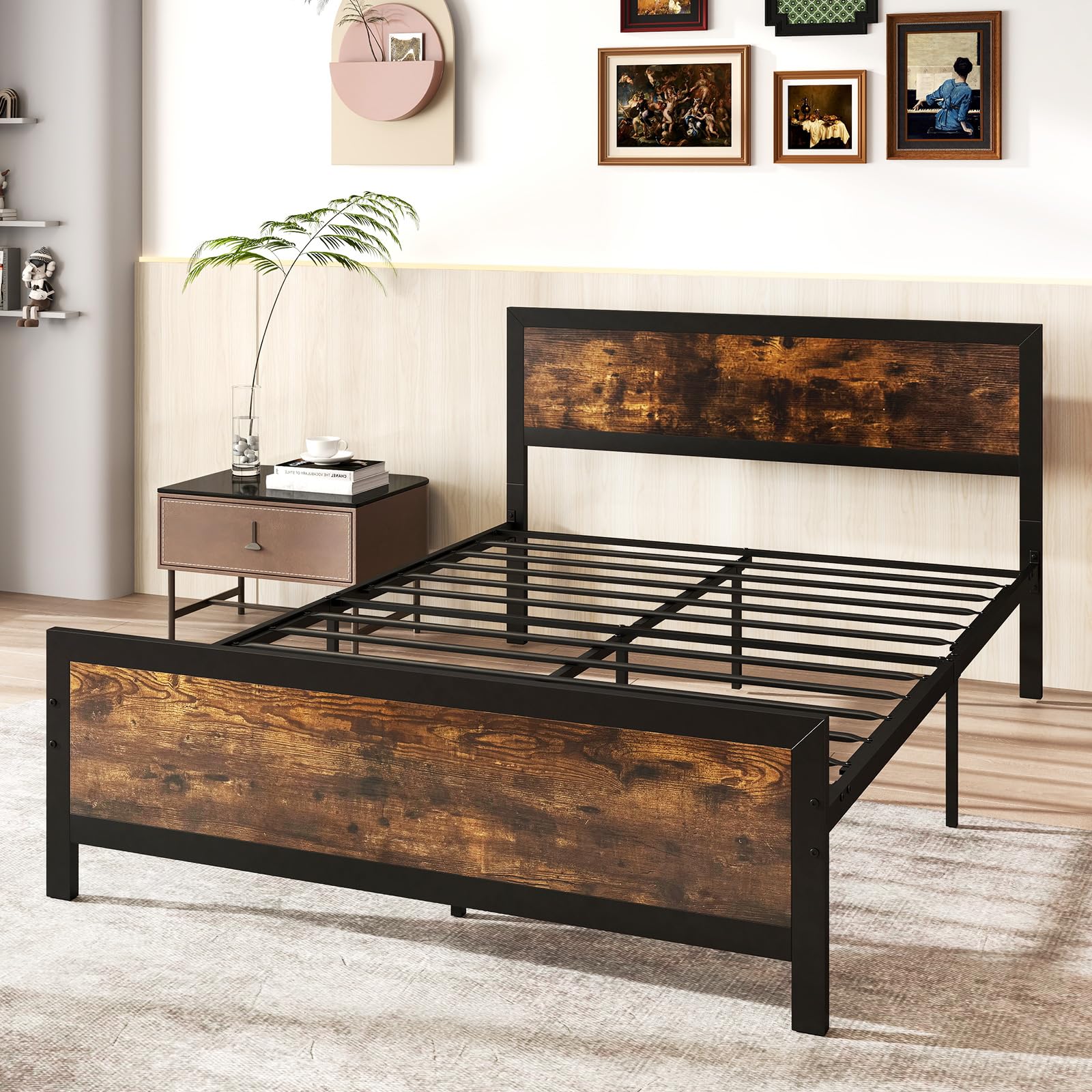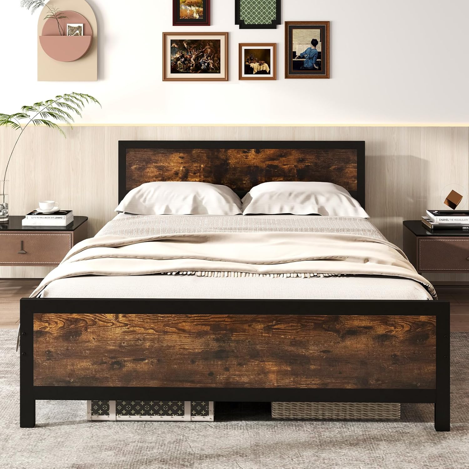The rustic headboard and footboard enhance the overall aesthetic appeal of your bedroom. The platform bed is equipped with sturdy metal slats support, providing exceptional stability and durability. With high load-bearing capacity up to 485 lbs, this bed frame ensures a reliable and secure sleeping environment. Say goodbye to cluttered rooms! 11" of clearance from the floor offers enough space to store extra odds and ends. This mattress foundation eliminates the need for a box spring.