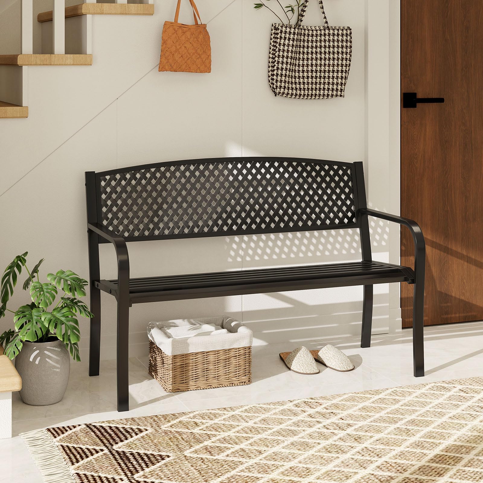 Enhance your outdoor space with our robust metal garden bench! Designed to support up to 660 lbs, this sturdy bench suits every outdoor setting. It's built for comfort, featuring a slanted backrest, an ergonomic seat, and smoothly curved armrests. The spacious seating area can easily accommodate 2-3 people, ideal for socializing or solitary relaxation. This heavy-duty bench features well-designed details, such as delicate ironwork patterns and a breathable slatted seat, effortlessly merging elegance with functionality. Perfect for placement in gardens, patios, or parks, this charming bench is a splendid addition to your outdoor decoration.