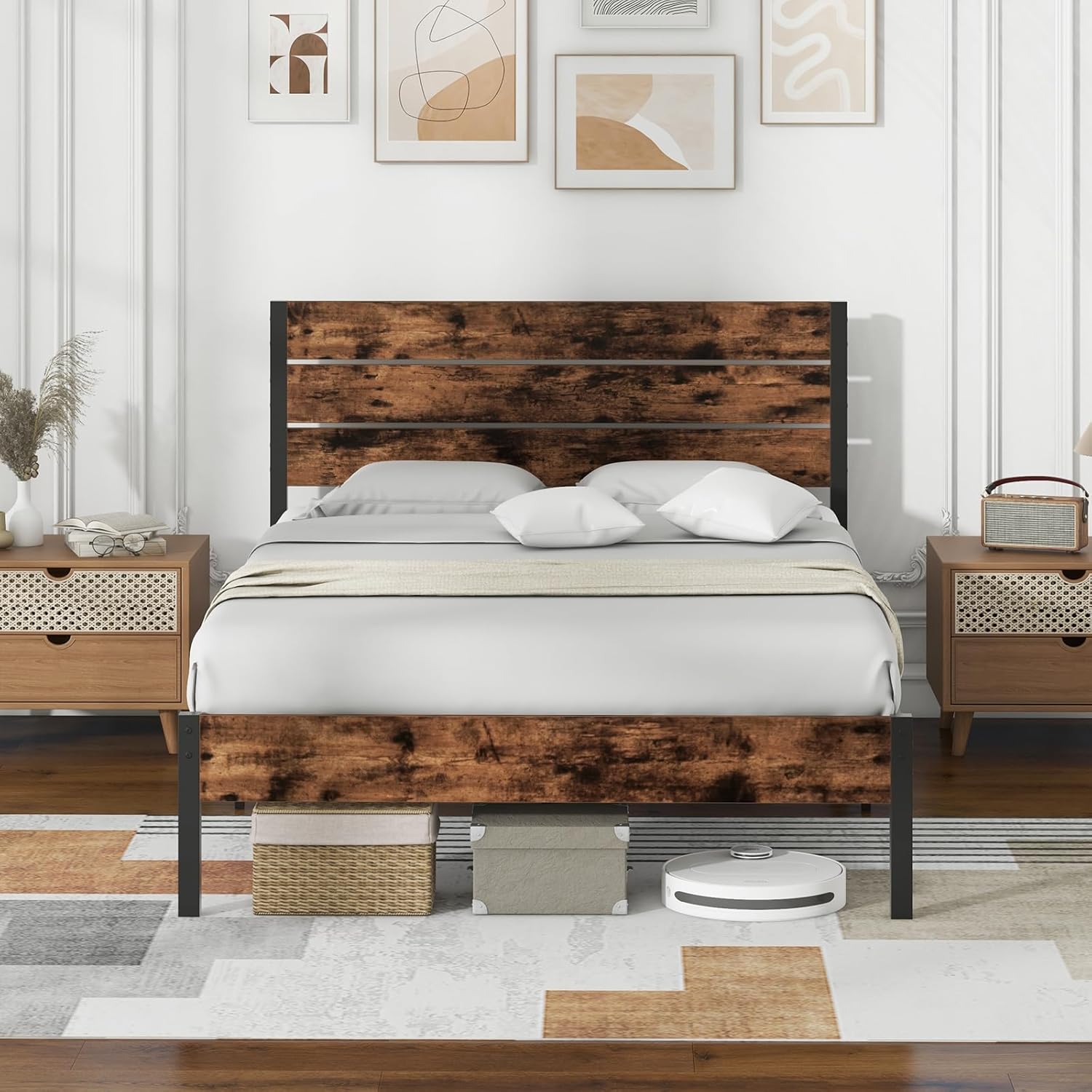 Enhance your bedroom with an industrial bed frame featuring a slatted headboard for comfort. The robust metal foundation includes 12 slats, a mute bar and extra legs to support up to 660 lbs/1100 lbs. Benefit from 12.5" clearance under the bed that offers ample space for your storage needs and robot vacuum cleaner. Thus, you can neatly organize your shoes, blankets, bed sheets, books, etc. Enjoy the convenience of snap lock slats for simple assembly and anti-slip foot pads to protect your flooring. This platform design eliminates the need for a box spring, allowing for the best fit with an 8"-12" thick mattress for a comfortable and supportive rest.