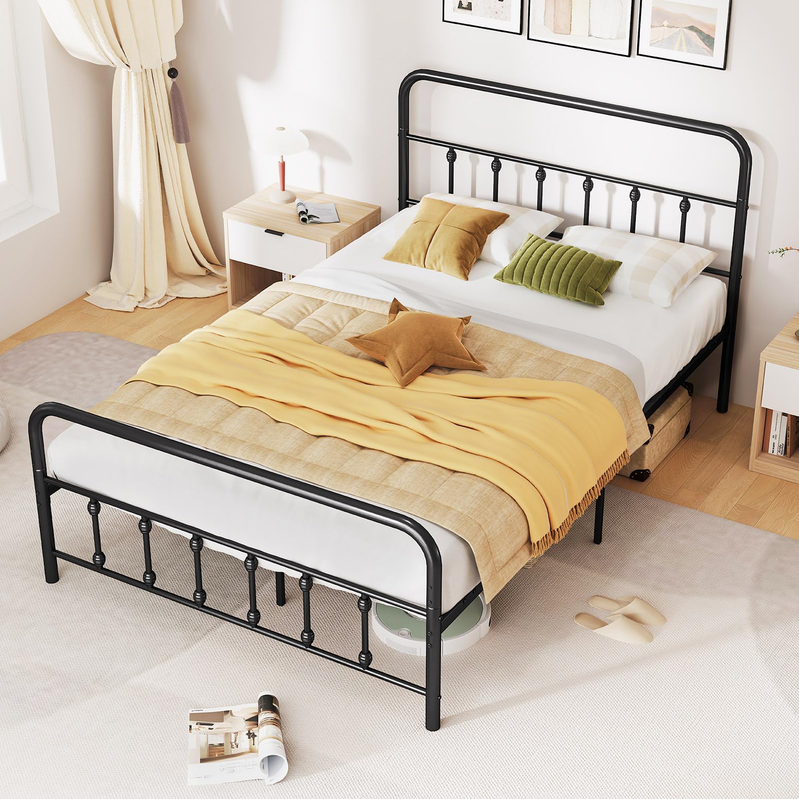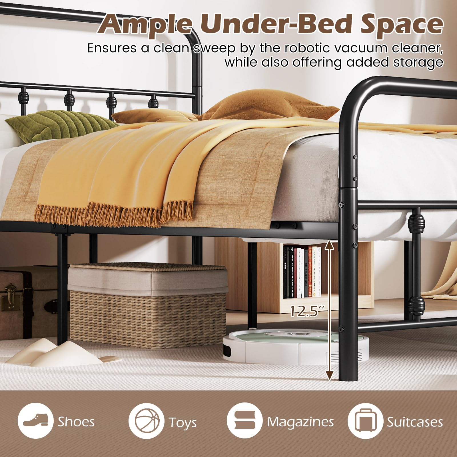 Adding a touch of vintage elegance to your bedroom, this metal platform bed is not only stylish but also sturdy. With a robust metal construction including 12 strong slats and extra legs, it can support up to 1100 lbs, ensuring stability. Assembly is simplified with snap lock connections and the bed frame features a mute bar to prevent squeaks/anti-slip foot pads to protect the floor. The 12.5” high under-bed clearance ensures a clean sweep by the robotic vacuum cleaner, while also offering added storage. Advancing practicality, this platform bed eliminates the need for a box spring, and a mattress between 8” to 12” is recommended for the best comfort. More user-friendly details await your discovery.