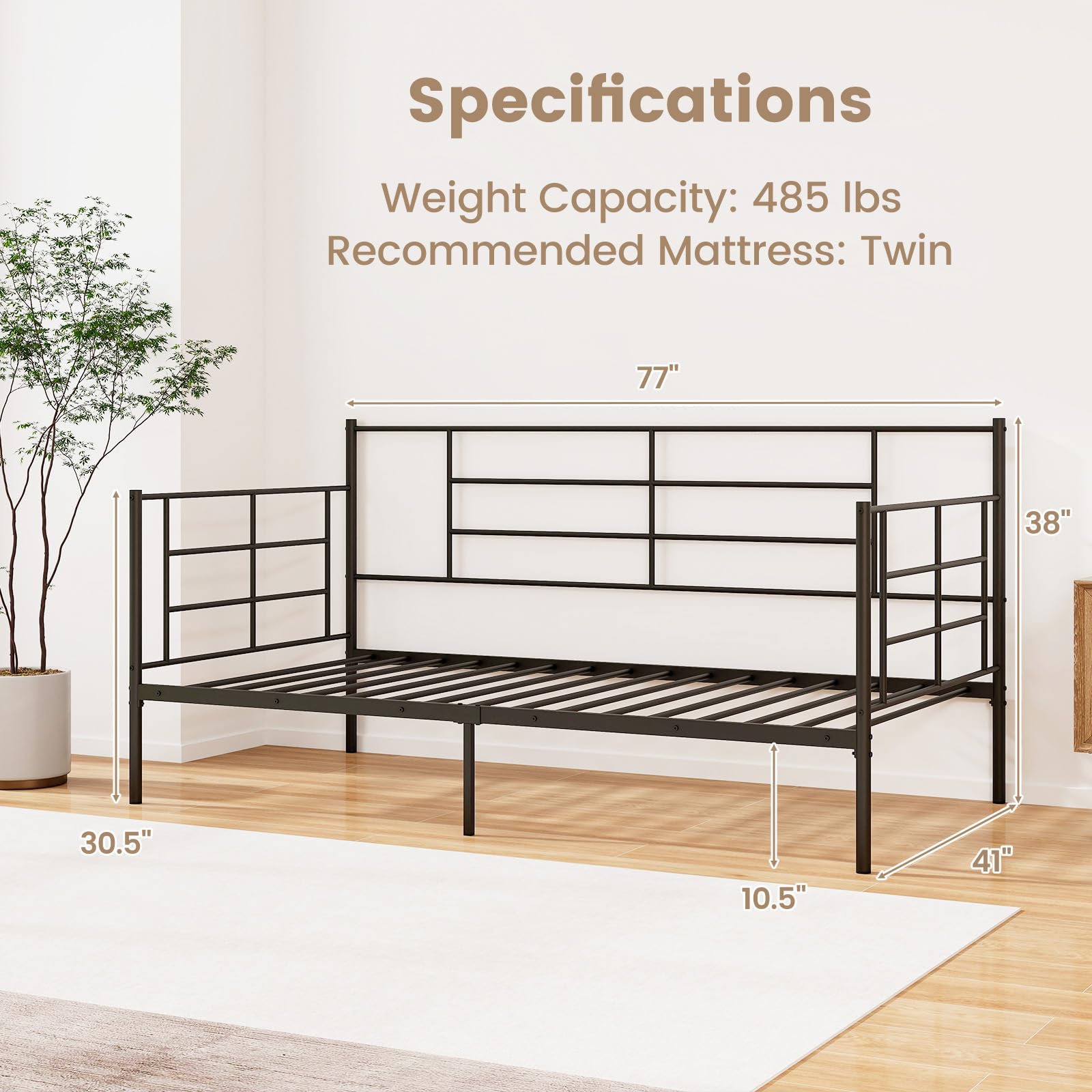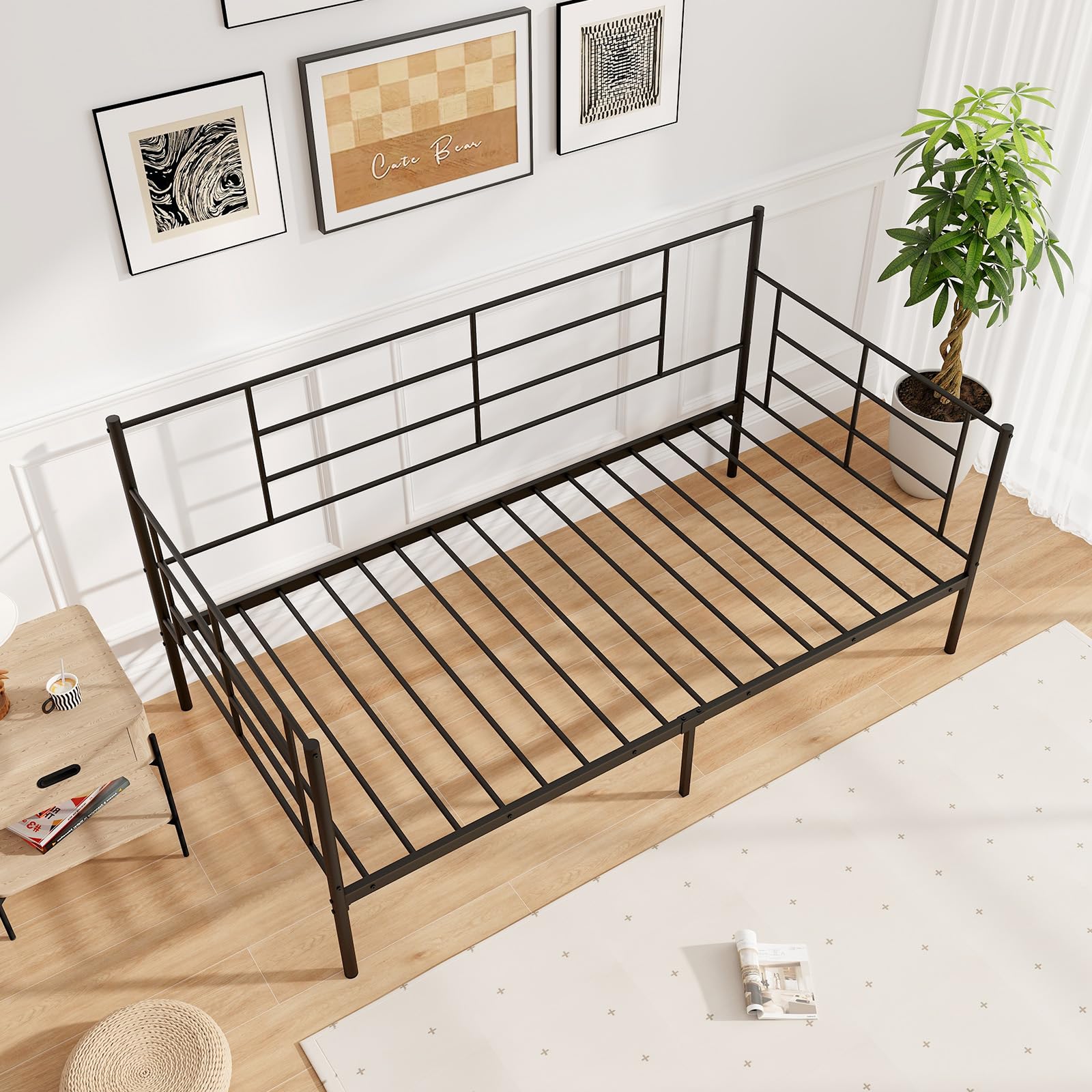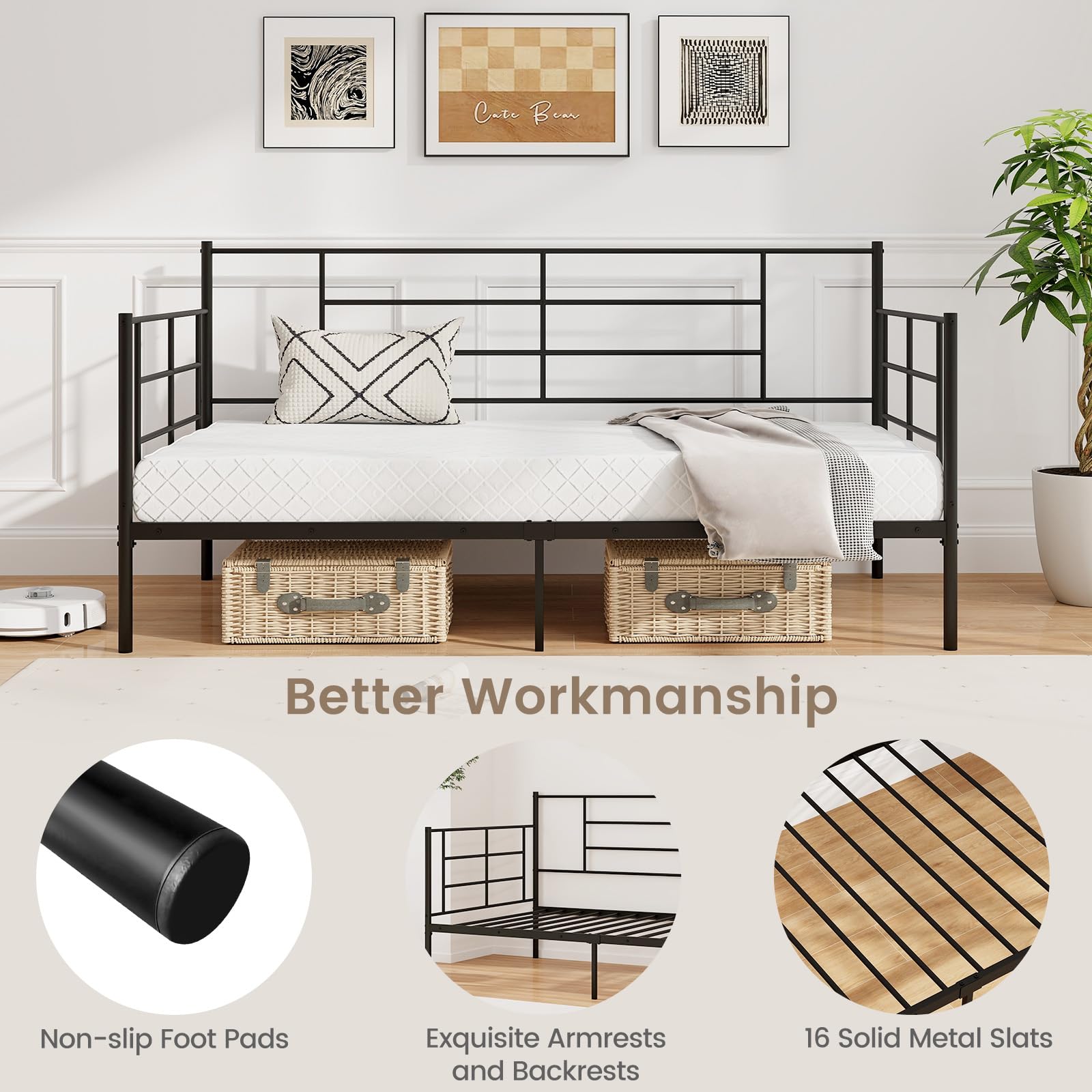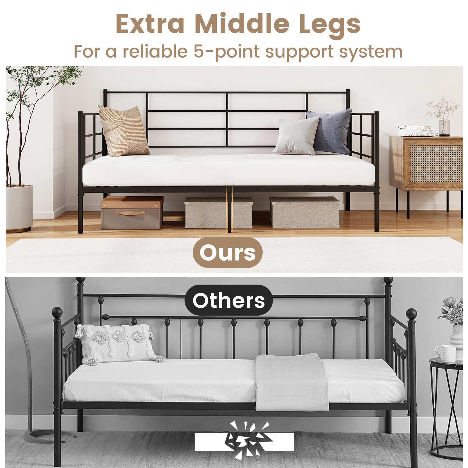This functional furniture with 2-in-1 design can be used as a cozy daybed or as a functional sofa – ideal for hosting overnight guests or providing a comfortable lounging spot. The bed features 16 solid metal slats, eliminating the need for box springs and ensuring robust support for a peaceful night's sleep. Not like others with four leg, ours with extra middle leg guarantees reliable stability and durability for long-term use. You can also aximize your room potential with the 10.5" raised under bed storage space, which allowes you to keep cleaning supplies, extra bedding, or seasonal items neatly. The exquisite armrests and backrests bring a chic and stylish vibe to your home decor. Enjoy the modern-inspired daybed with better workmanship, which creates a harmonious atmosphere and reflects your unique taste!