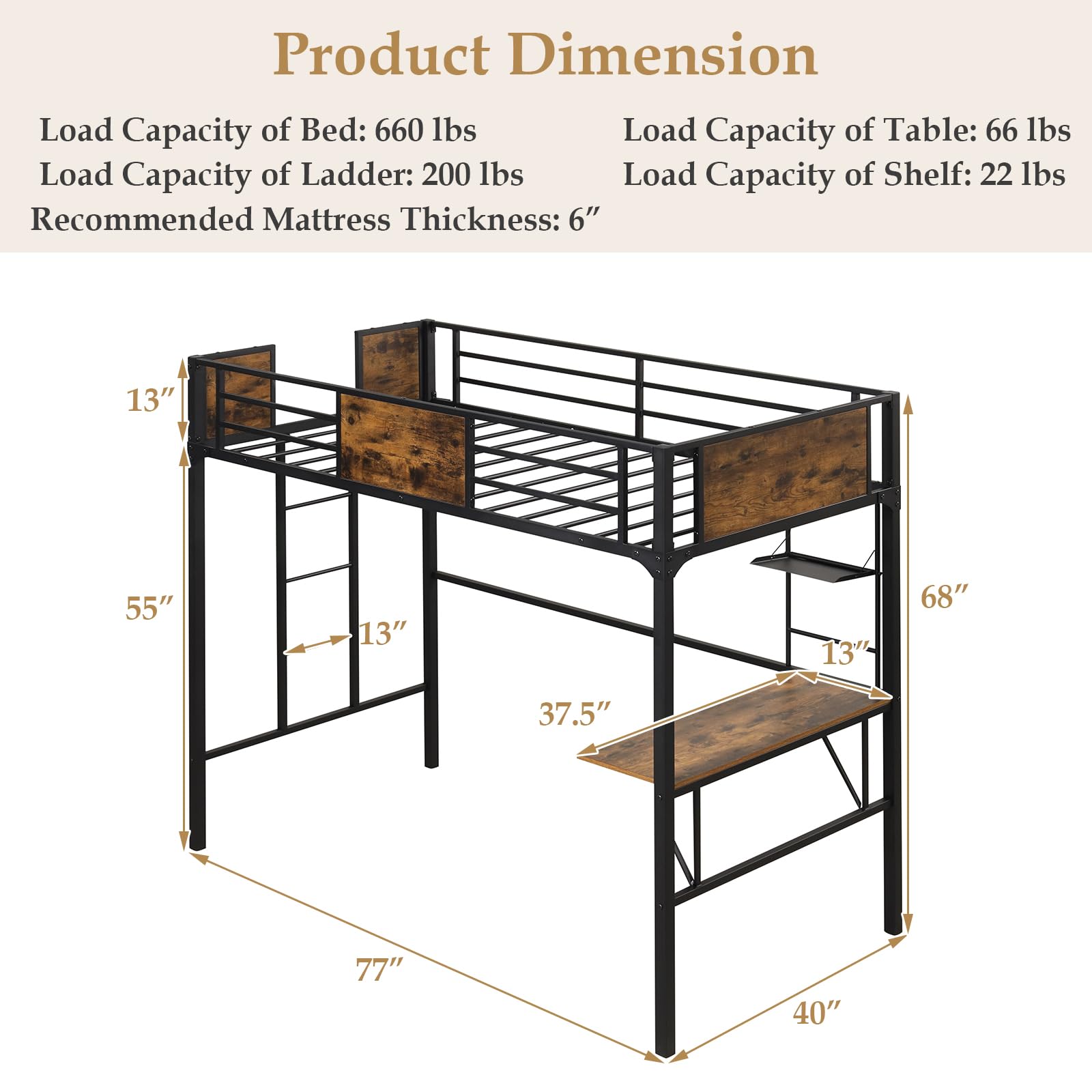 - [Multifunctional Twin Loft Bed]: Consists of a twin bed, a built-in study desk, and a storage tray, this loft bed frame provides a private entertaining space for you. With all the accessories, you can create an effective working or studying environment for work, study, and relaxation.