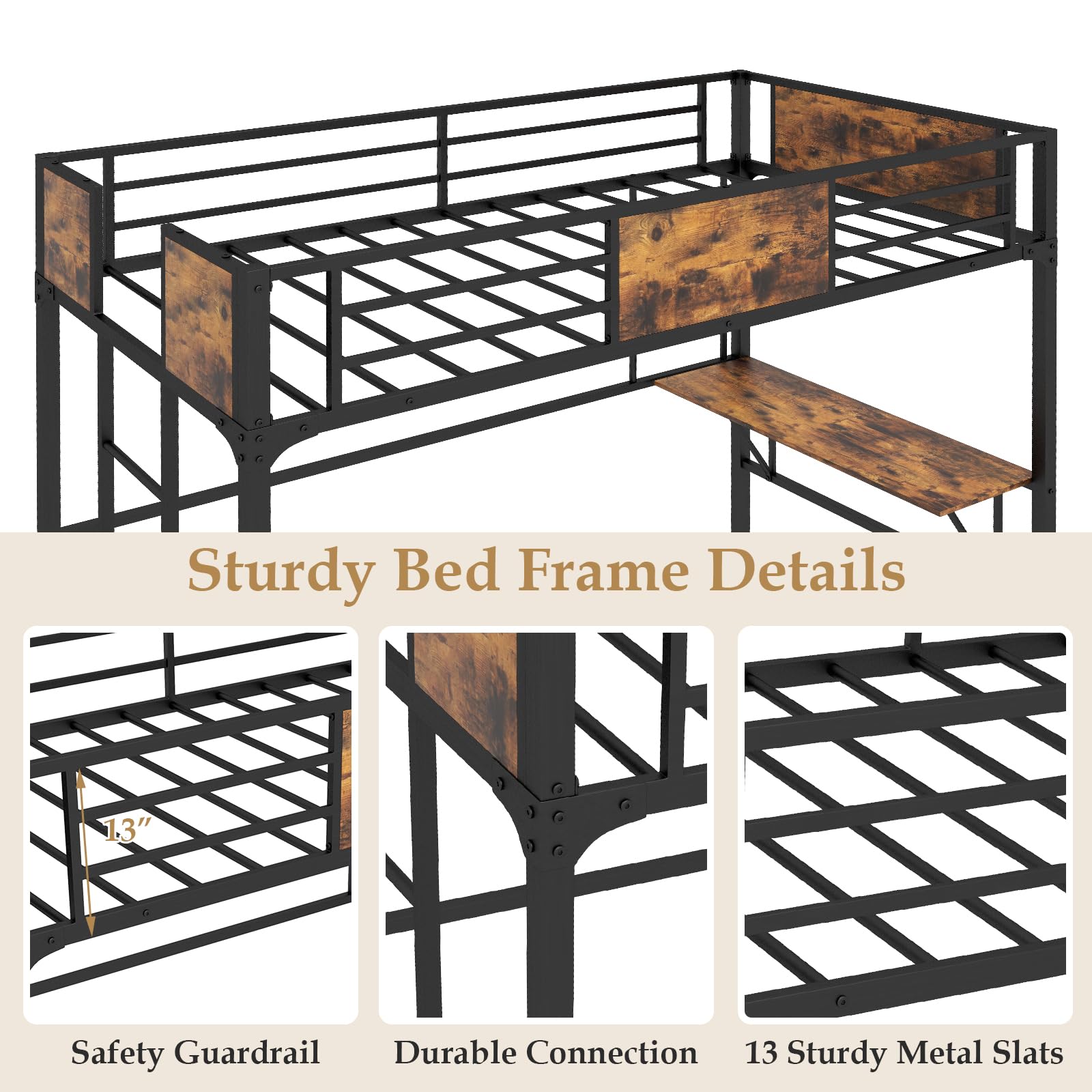 Having trouble deciding which bed to choose for your bedroom? Then our industrial metal loft bed with a working desk is worth having! With the combination of the study bed, storage tray, and twin bed, this multifunctional bed frame offers a practical and space-saving solution for your bedroom. Additionally, crafted from durable metal and MDF materials, the bed frame can hold up to 660 lbs. What’s more, the built-in working desk, creates an effective workspace for studying or working. Besides, the bed frame also has sturdy bed frame details such as anti-tipping devices and safety guardrails for enhanced safety. Upgrade your bedroom with this versatile and functional bed frame today.