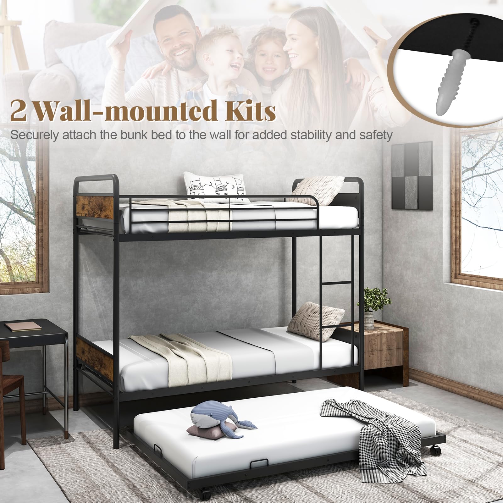 - Space-saving Bunk Bed with Trundle: This bunk bed features 2 twin size beds and a trundle, which is designed for rooms with limited space. Ideal for families with multiple children or frequent visitors, the triple bed frame enlarges extra sleeping space. Note: Recommended to use 3 twin size mattresses (38" x 75")