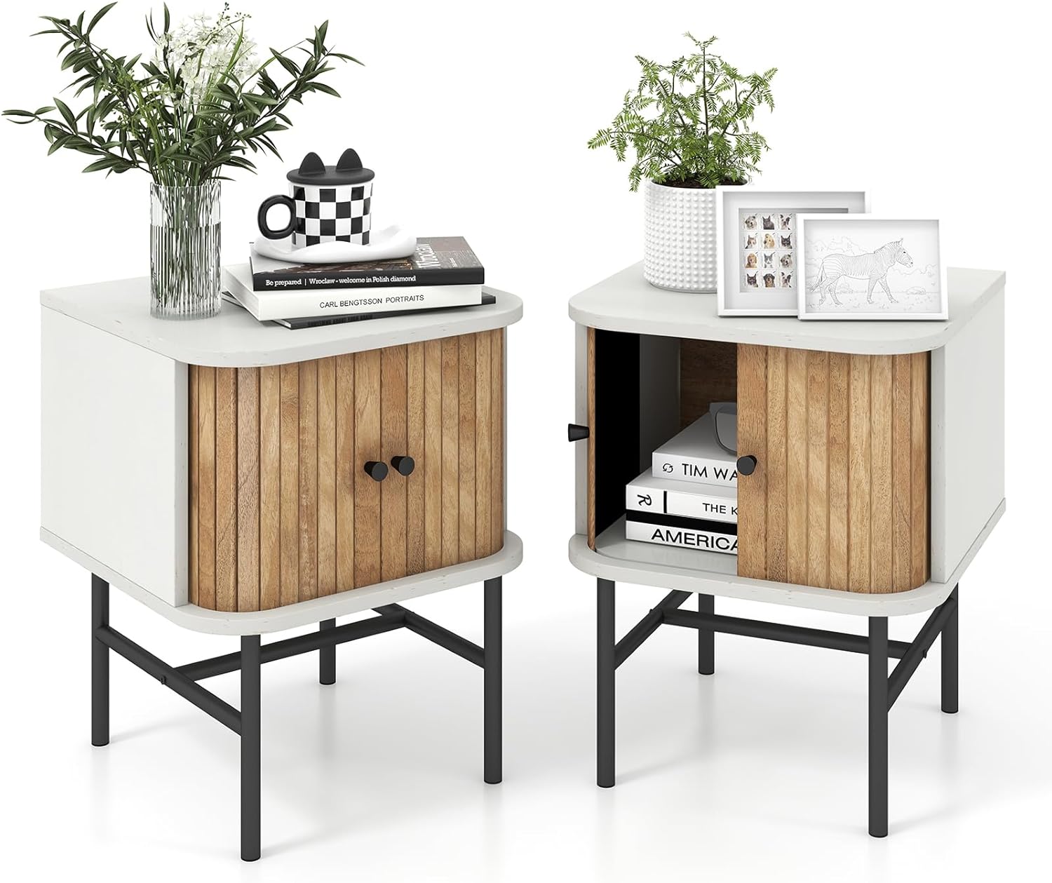 The nightstand fulfills your storage and showcase needs. There are 2 sliding doors for storage convenience and wide tabletop to enlarge display space. For reliable structure, the end table is made of durable board for long-lasting use and supported by 4 sturdy metal legs for strong stability. The mid-century modern nightstand enhances the aesthetics of your home, making it ideal for living room, and bedroom, etc.