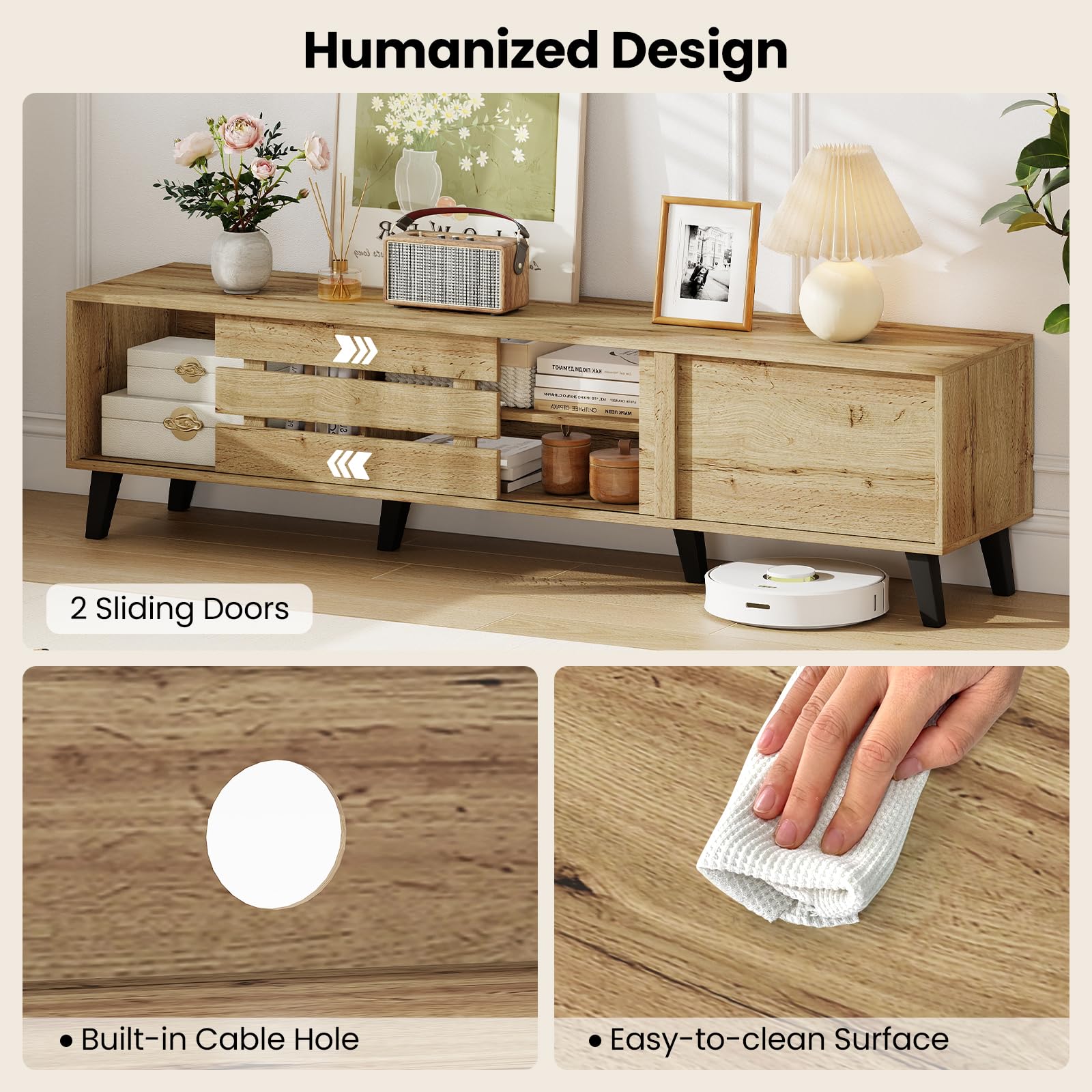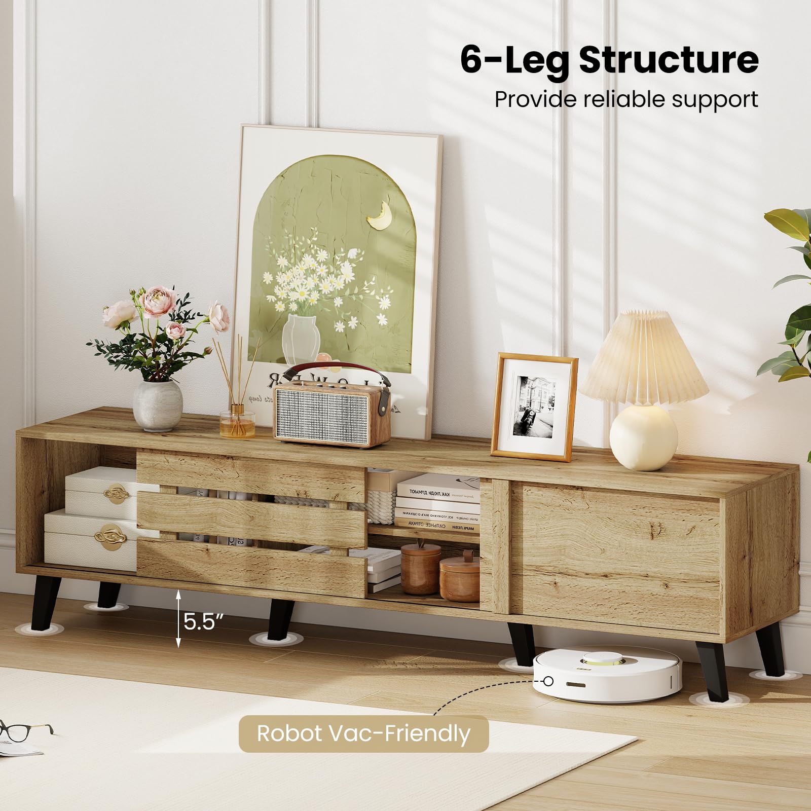 Transform your entertainment space with a media centerpiece: our stylish TV stand! It is not just spacious (71"L x 16"W) and sturdy (supports TVs up to 65"/70"/80"), but also a marvel in design. Tidy up in style with smart compartments and hidden storage that keep all your gadgets and media perfectly organized. Say goodbye to visible cables and hello to seamless elegance with special cable management. Plus, it's crafted with a stunning wood grain finish that adds a touch of timeless elegance to any room. Upgrade your living area effortlessly--this piece is a game-changer for enthusiasts of both function and fashion. Act now and redefine your home aesthetic!