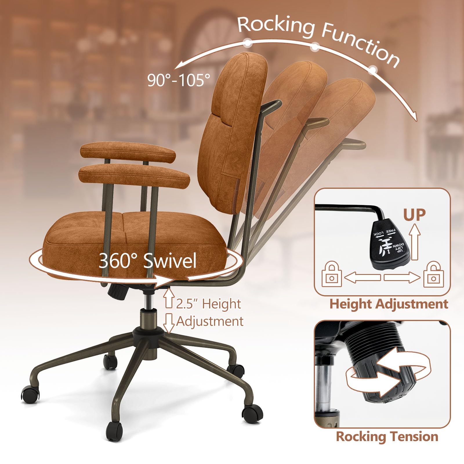 With a lever to lock or free height adjustment, and a knob for rocking tension control