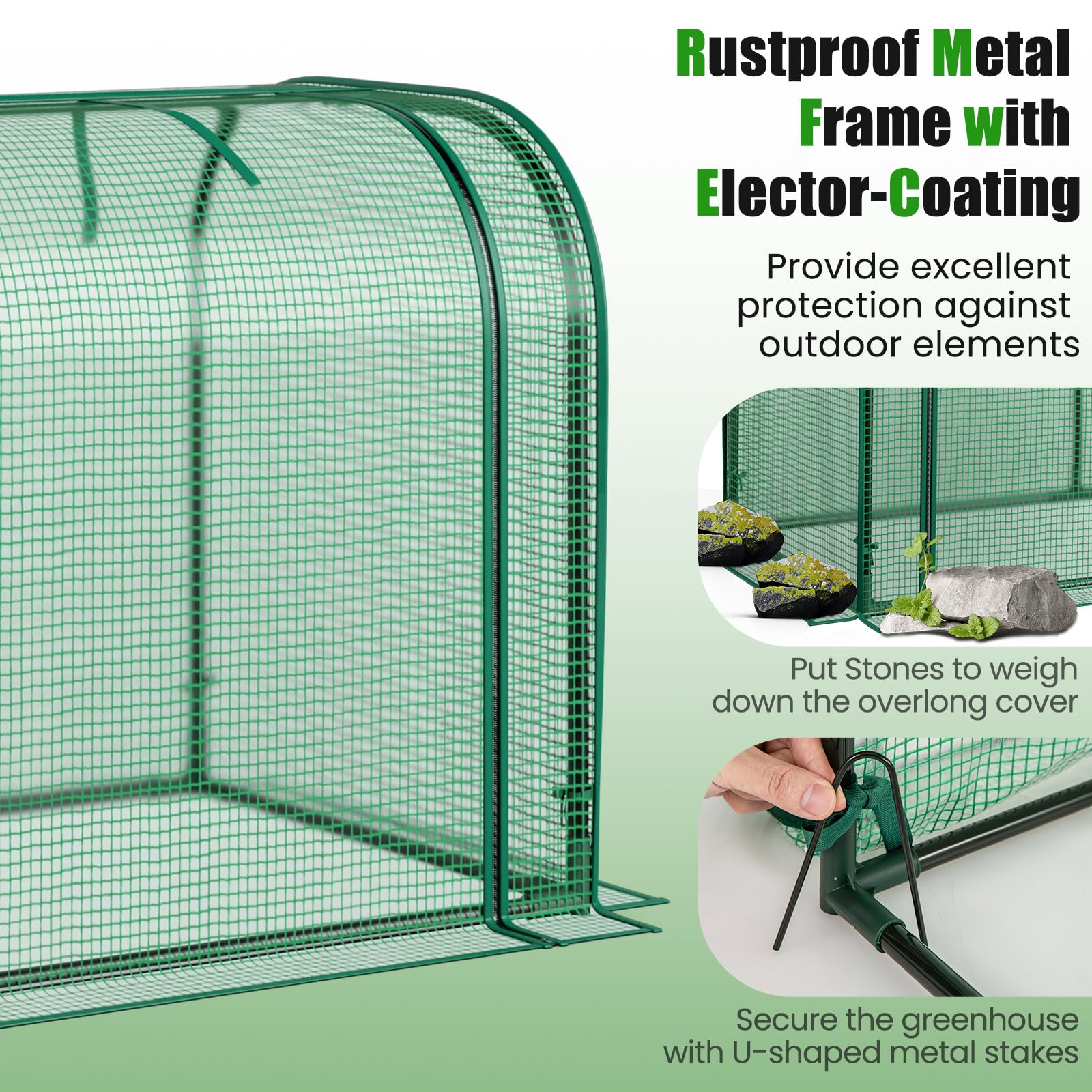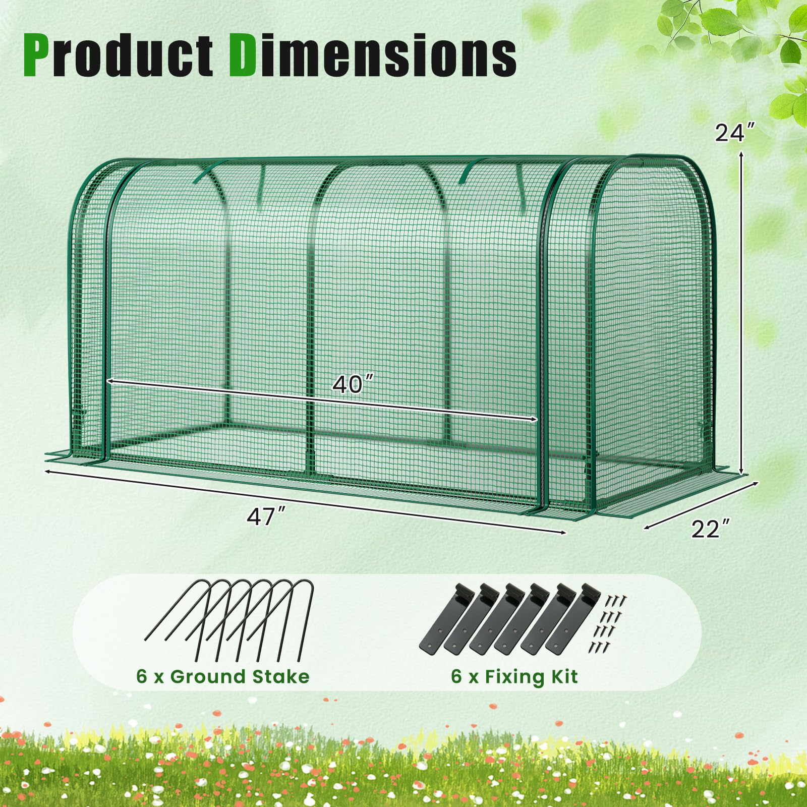 Our 2-in-1 versatile tunnel greenhouse measures 47'' x 22'' x 24'' (L x W x H), which doubles as a portable greenhouse or a raised garden box cover (fixing kit included), expanding your gardening possibilities. The protective cover is crafted premium PE material, which is sun-protection, bite-proof, and waterproof, helping protect your lovely plants all year round. Besides, in contrast to normal metal tubes, our metal frame with elector-coating would not rust over times, providing excellent protection against outdoor elements. With stones and ground stakes fixed the frame, our greenhouse is further secure. In addition, featuring a convenient zipper door, it is easy to control the interior temperature and protect plants from small animals when closed while increasing airflow when opened. This mini greenhouse ULTIMATE SOLUTION for all your gardening needs!