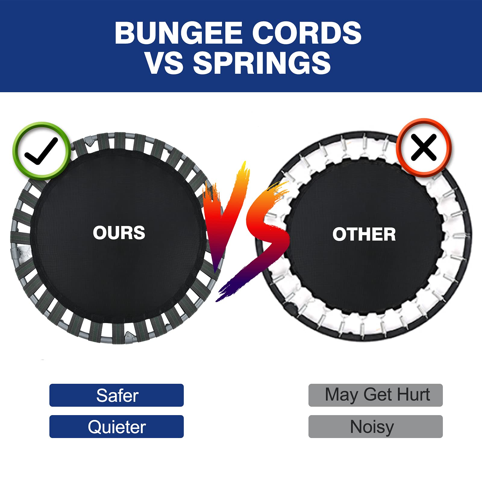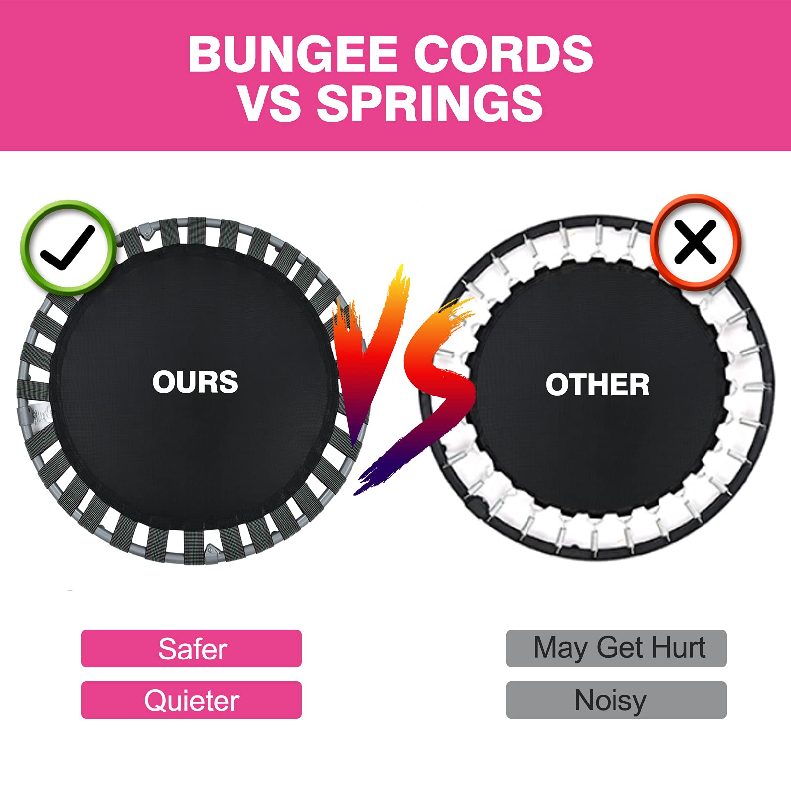- Quiet Mini Trampoline: Featuring 30 durable bungee cords, this fitness trampoline avoids disturbing others. At the same time, the anti-slip pads will help reduce the noise while preventing your floor from scratches. Hence, you can do your own things intently.