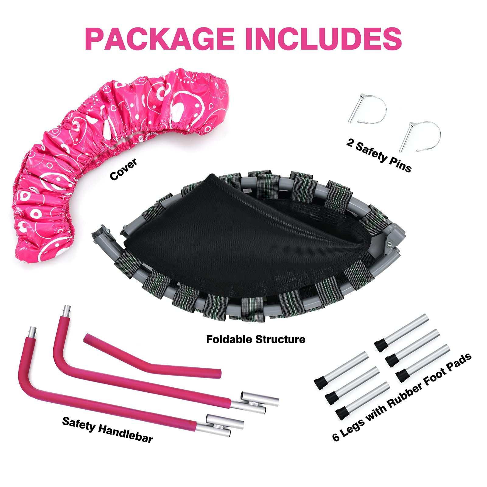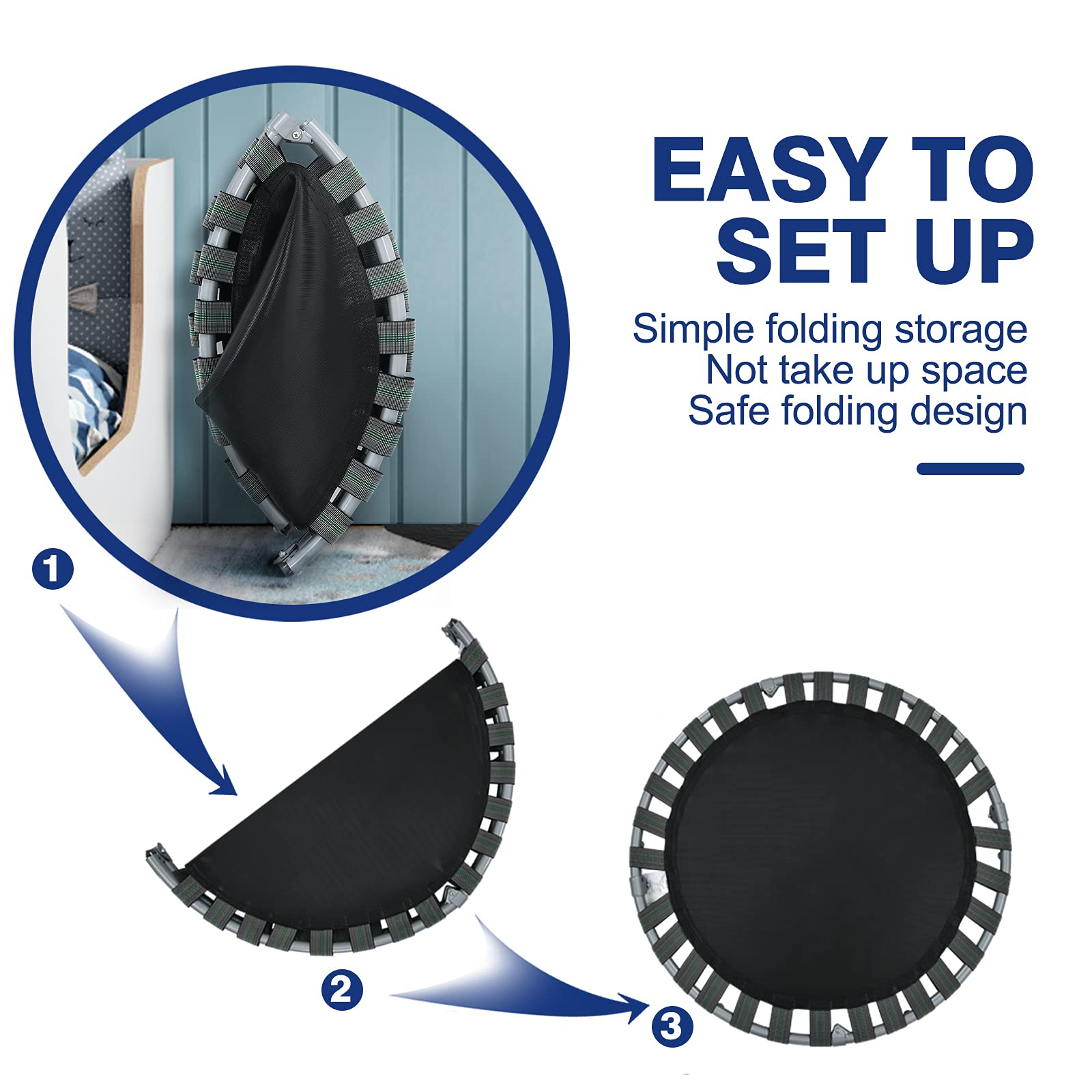 - Foldable Design: After removing the handle, cover and legs, the other parts of this lightweight mini trampoline can be easily folded into compact size. As a result, you are able to carry it effortlessly. And the storage becomes easier in order to save your home space.