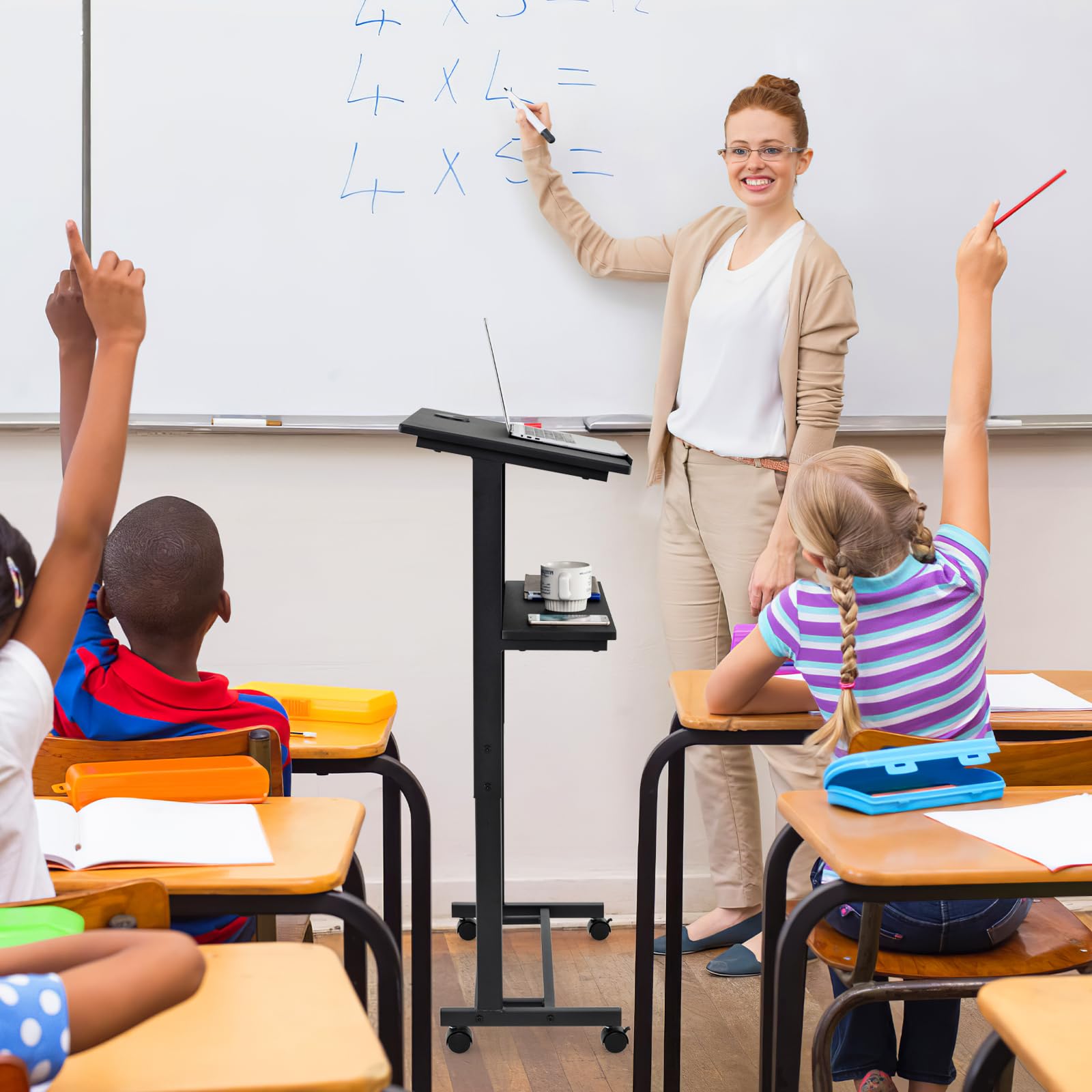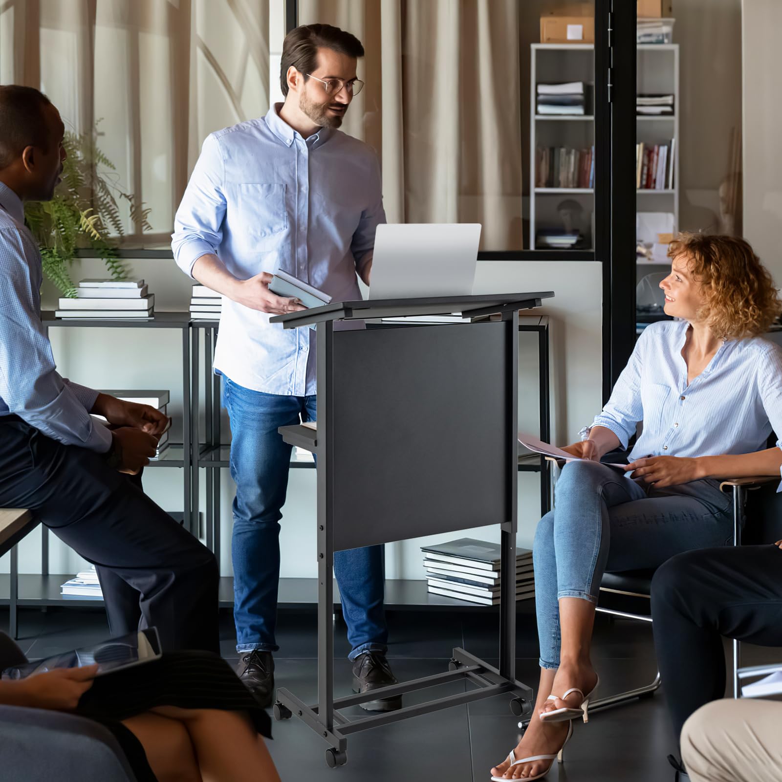 - [Adjust on the Fly]: The wheeled lectern features 3 available heights (48” max height, 45.5 medium height and 43” min height) and can be secured tightly by side screws. It ensures different people present at their most comfortable level without compromising on posture or performance.