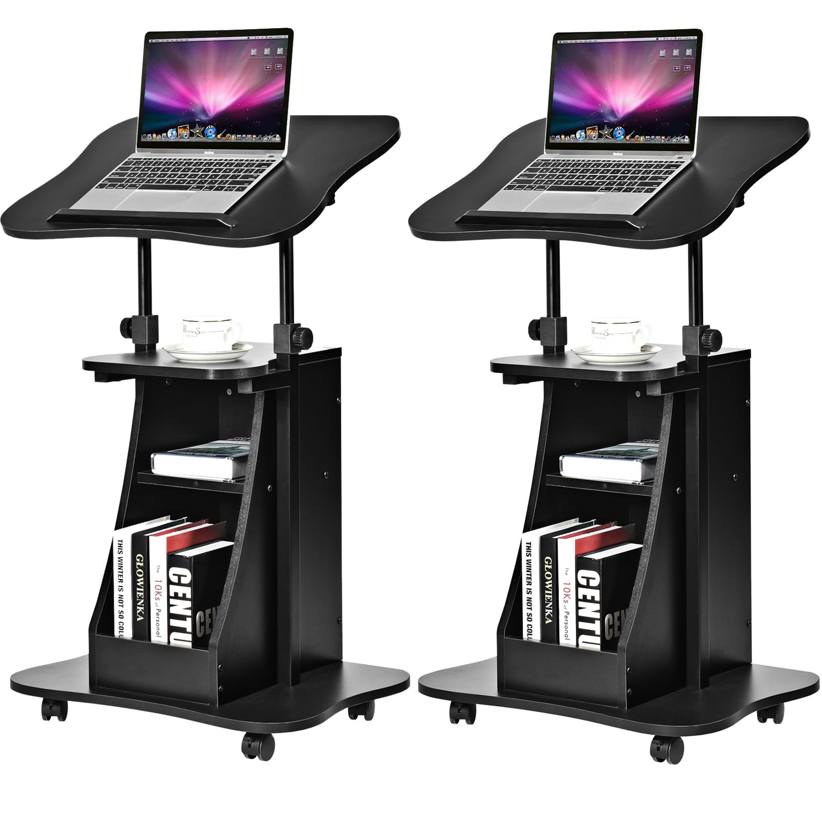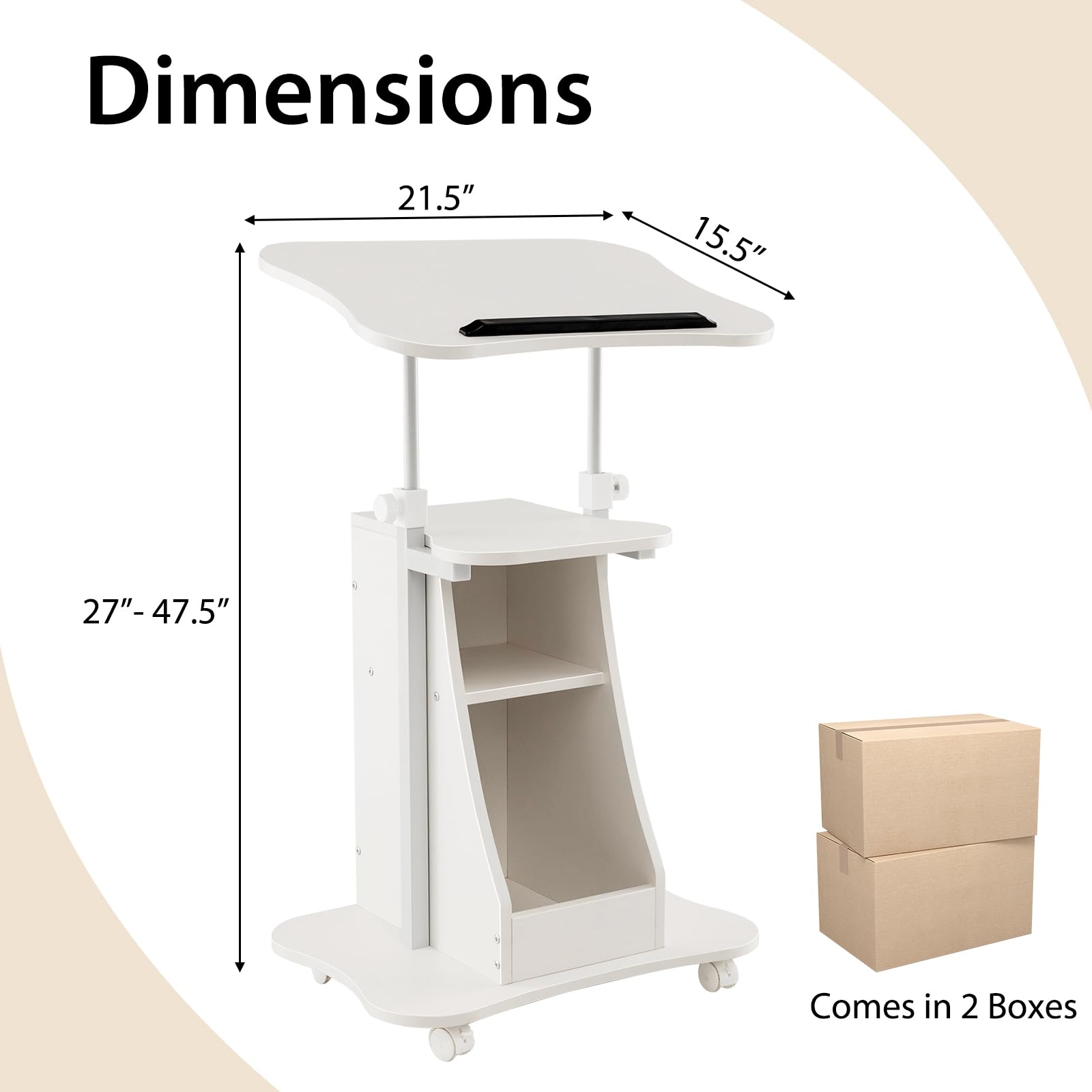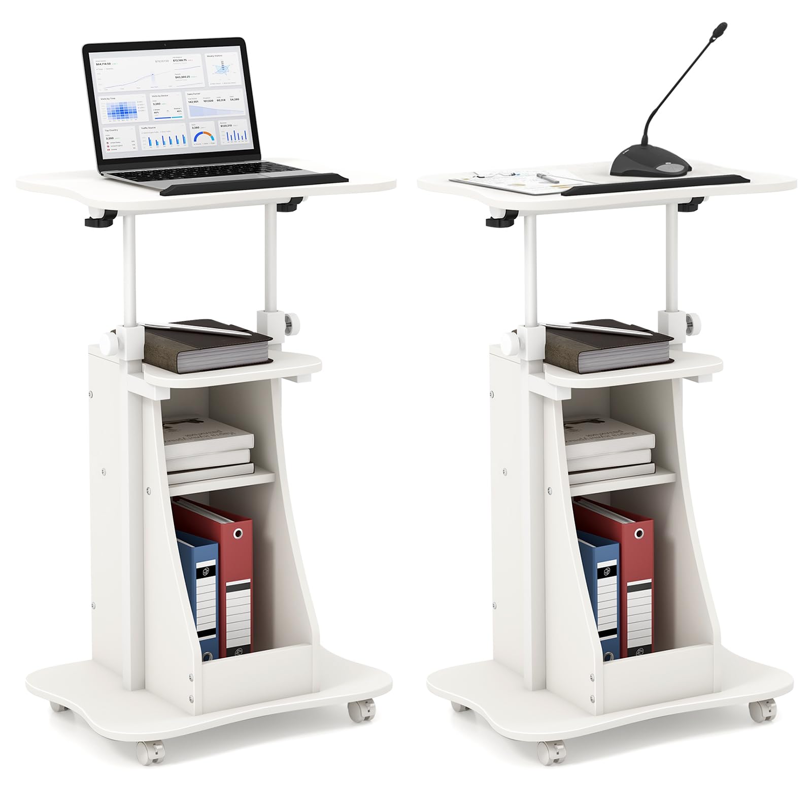 Enhance your workspace with this height-adjustable mobile podium stand! Customize the height and tilting angle of the tabletop with a simple twist of knob. Thus, you can sit or stand for ultimate comfort and productivity, and enjoy an ideal angle to work on your laptop. Besides, you can stow sundries in the under-desk storage space, keeping them easily accessible and well organized. It is a breeze to maneuver with smooth-rolling casters and keep it stable with 2 brakes. Upgrade your work from home setup today!